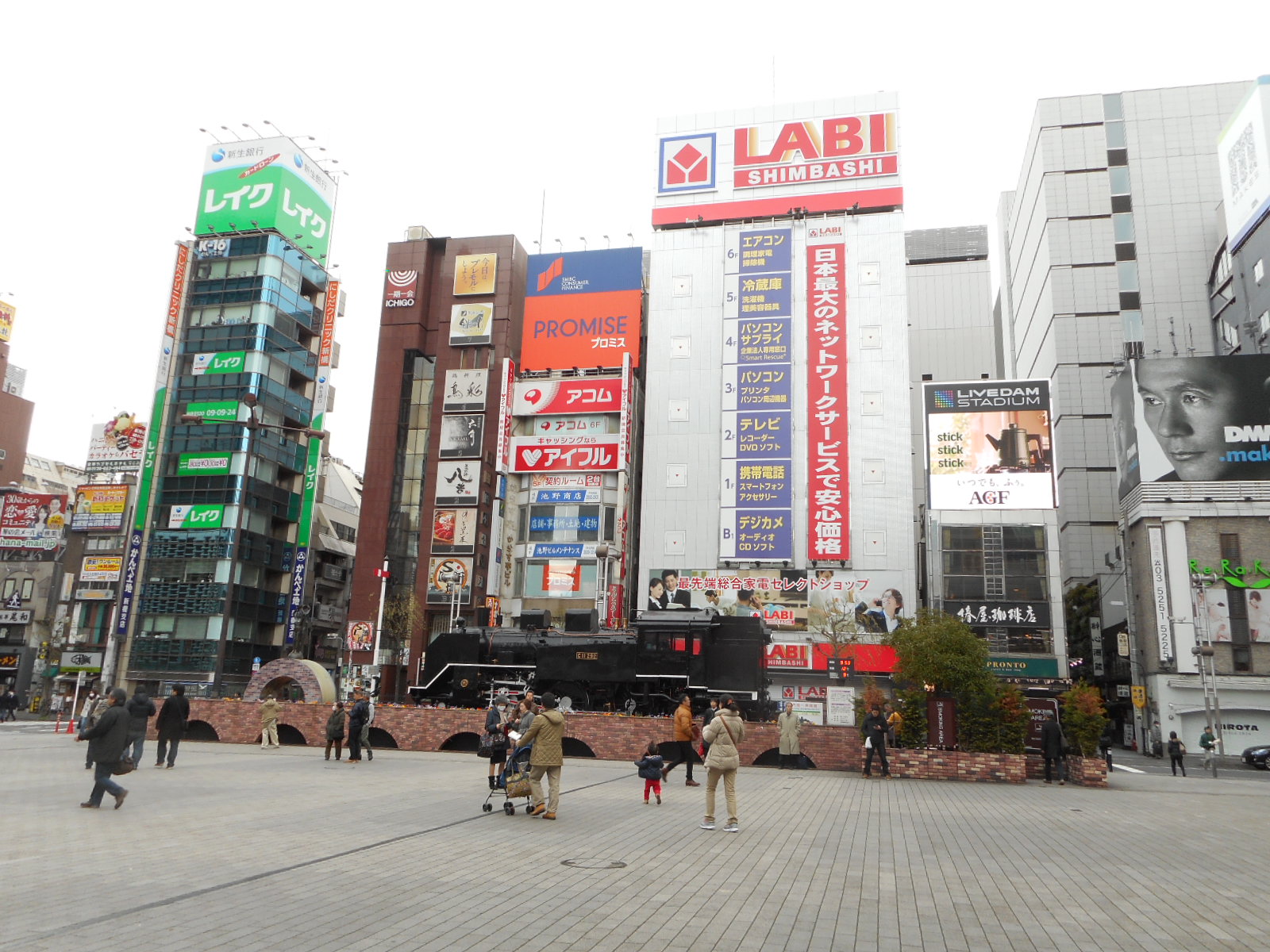 歩いて5分で新橋駅に着きました(駅前広場にはSLが展示されていました)!!