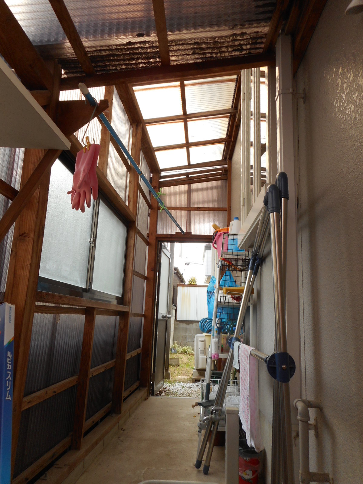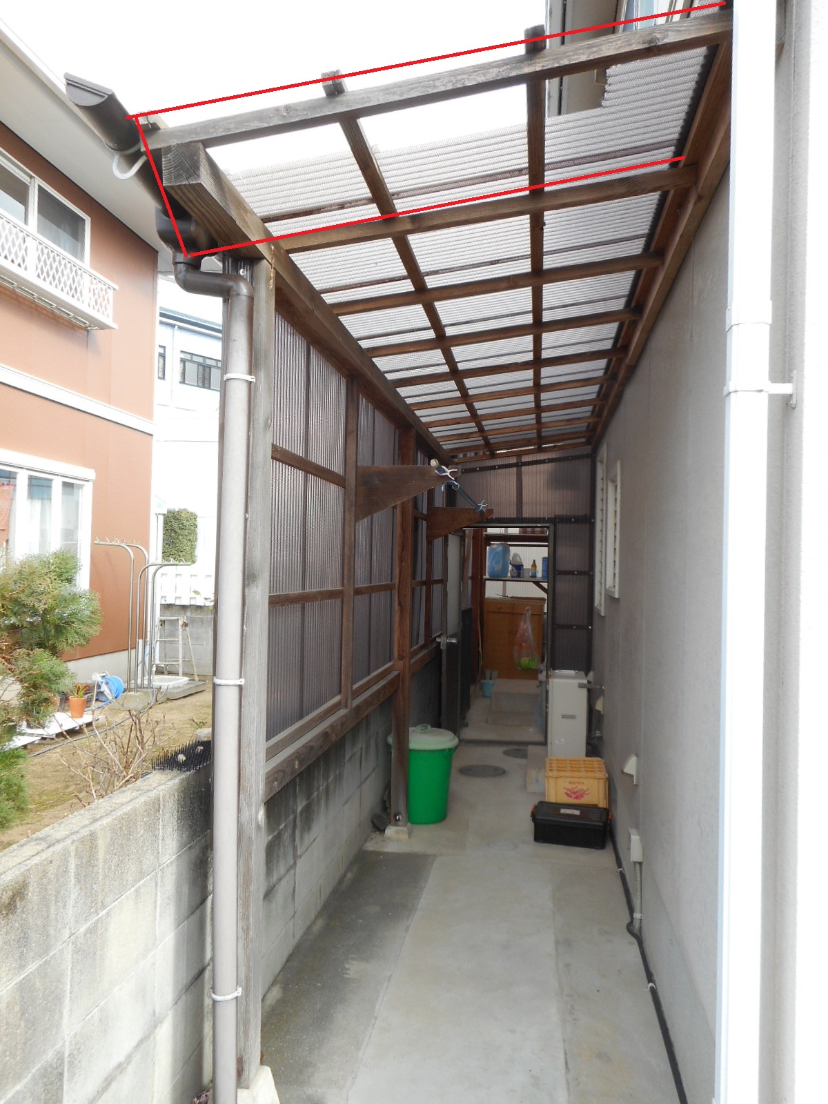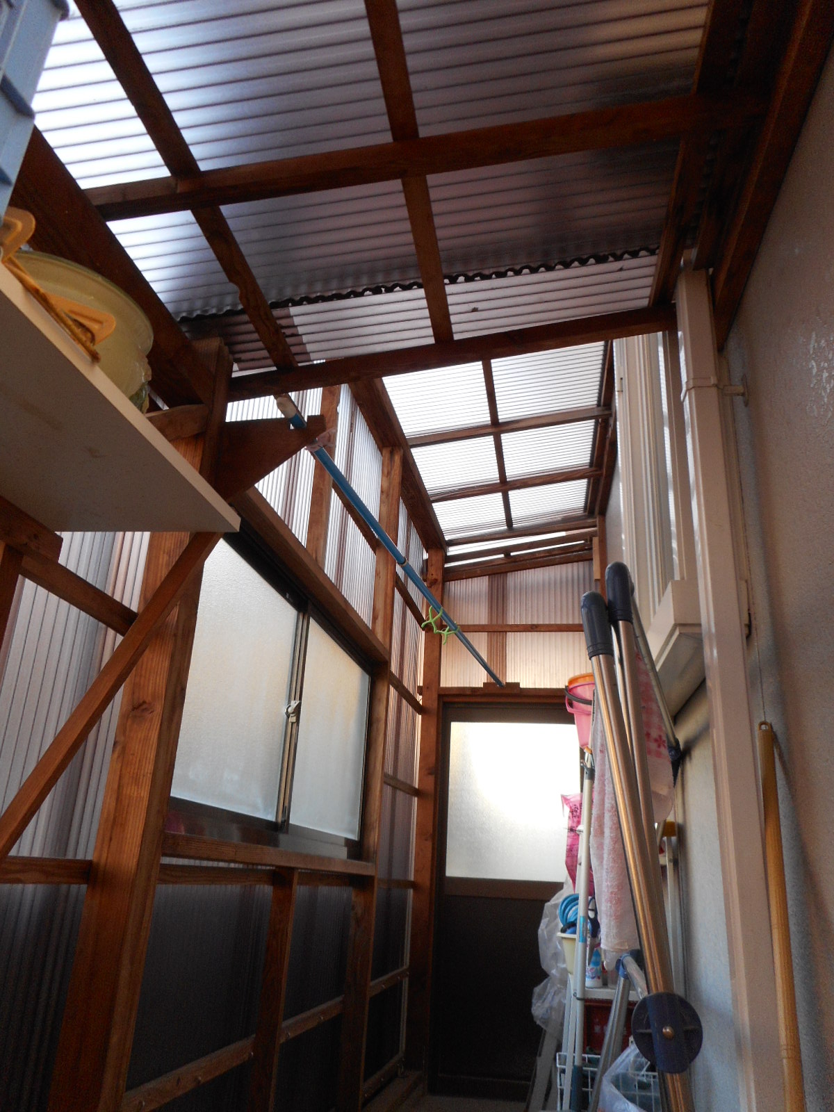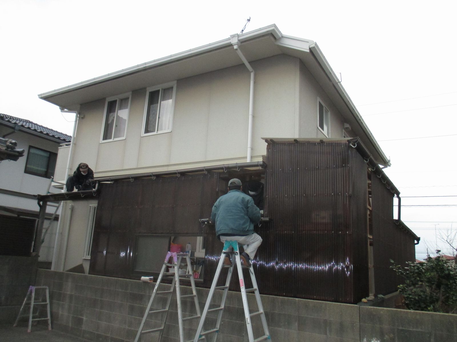 正面(玄関側)の屋根の波板を撤去しました!! 側面の波板を張替え、屋根の波板を張って行きます!!