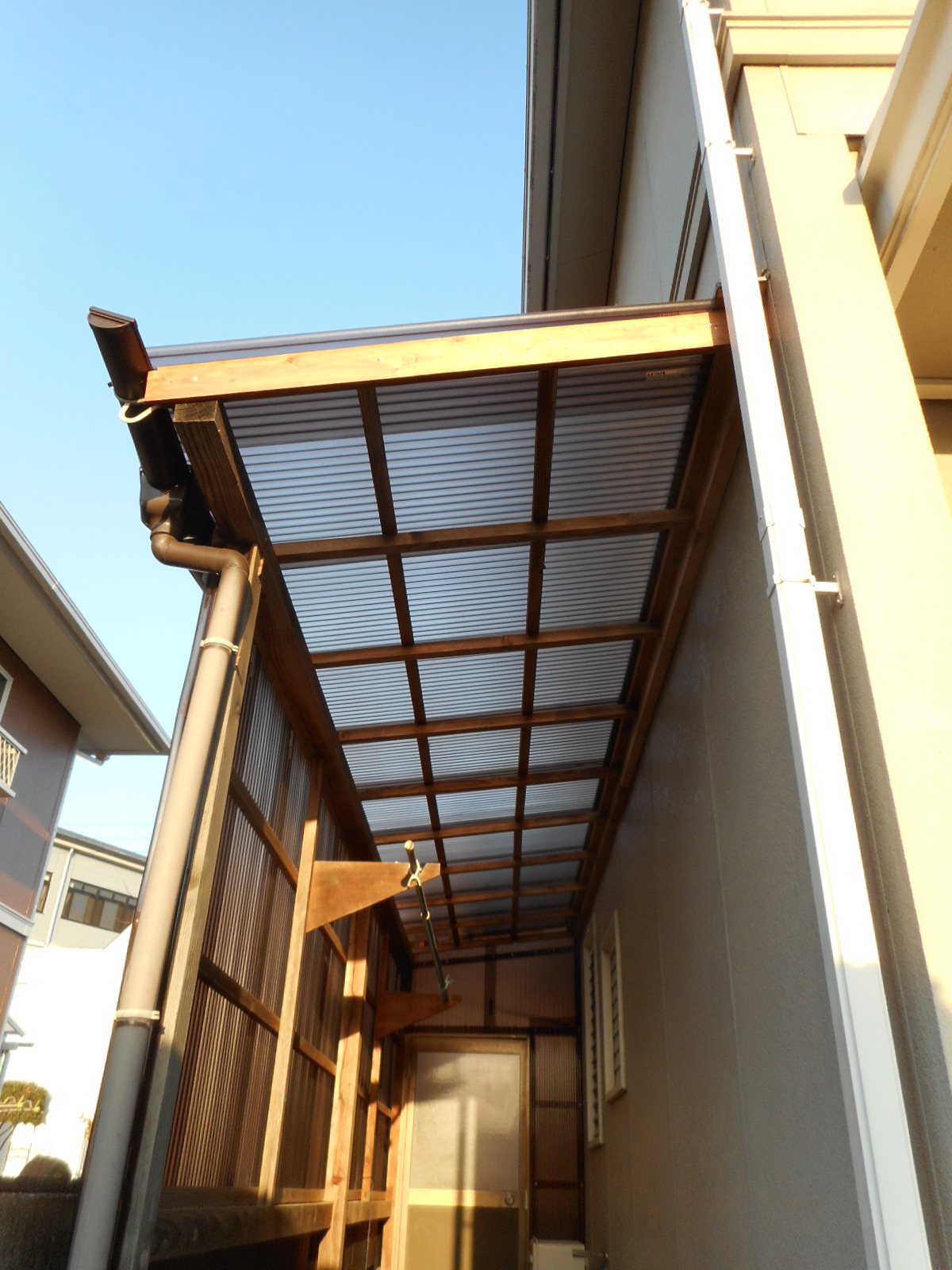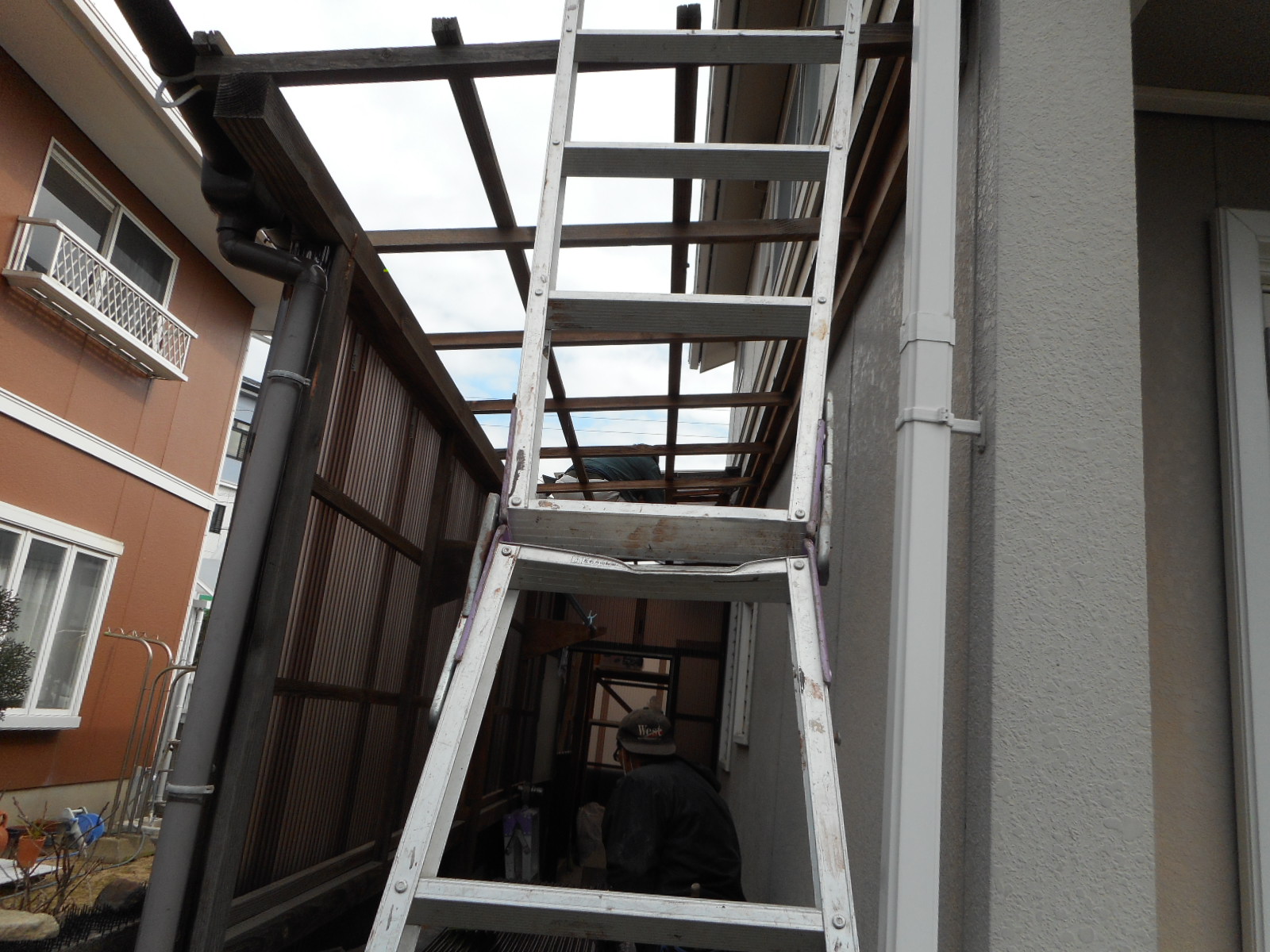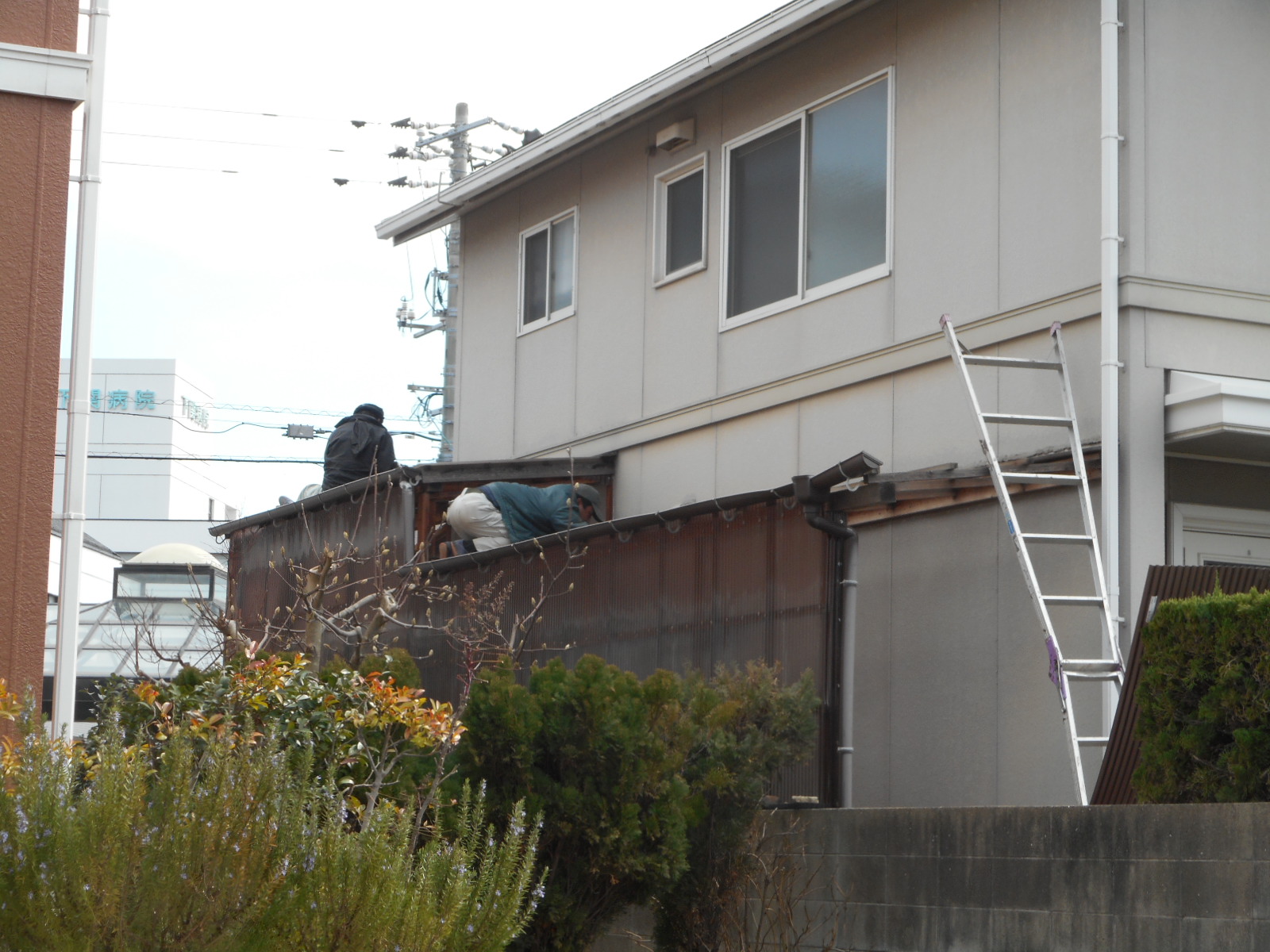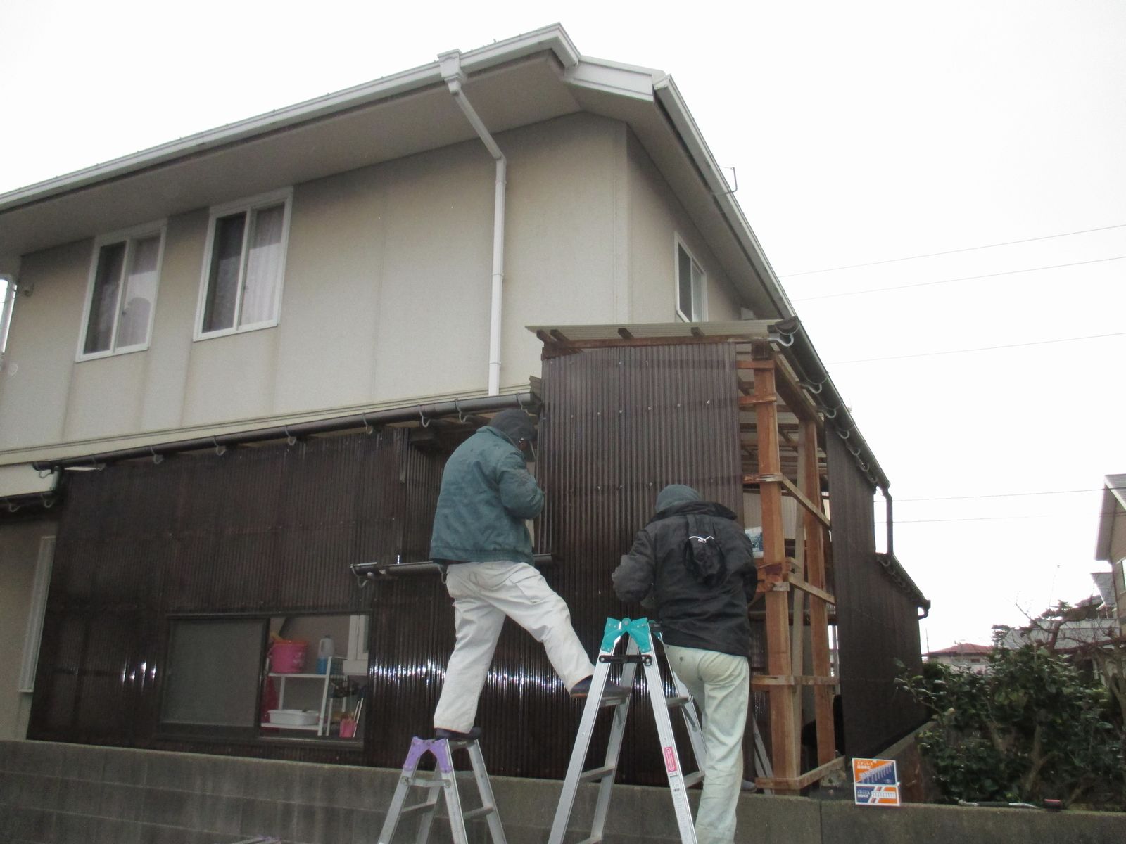 正面(玄関側)の屋根の波板を撤去しました!! 側面の波板を張替え、屋根の波板を張って行きます!!