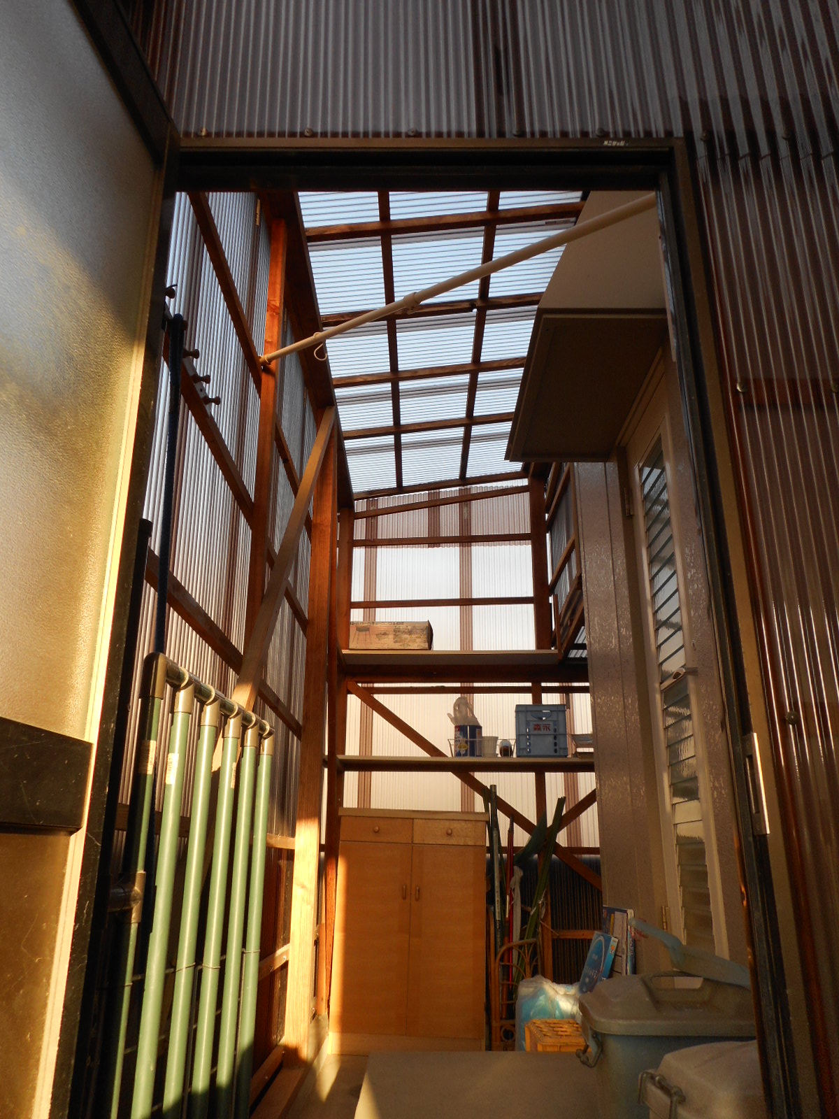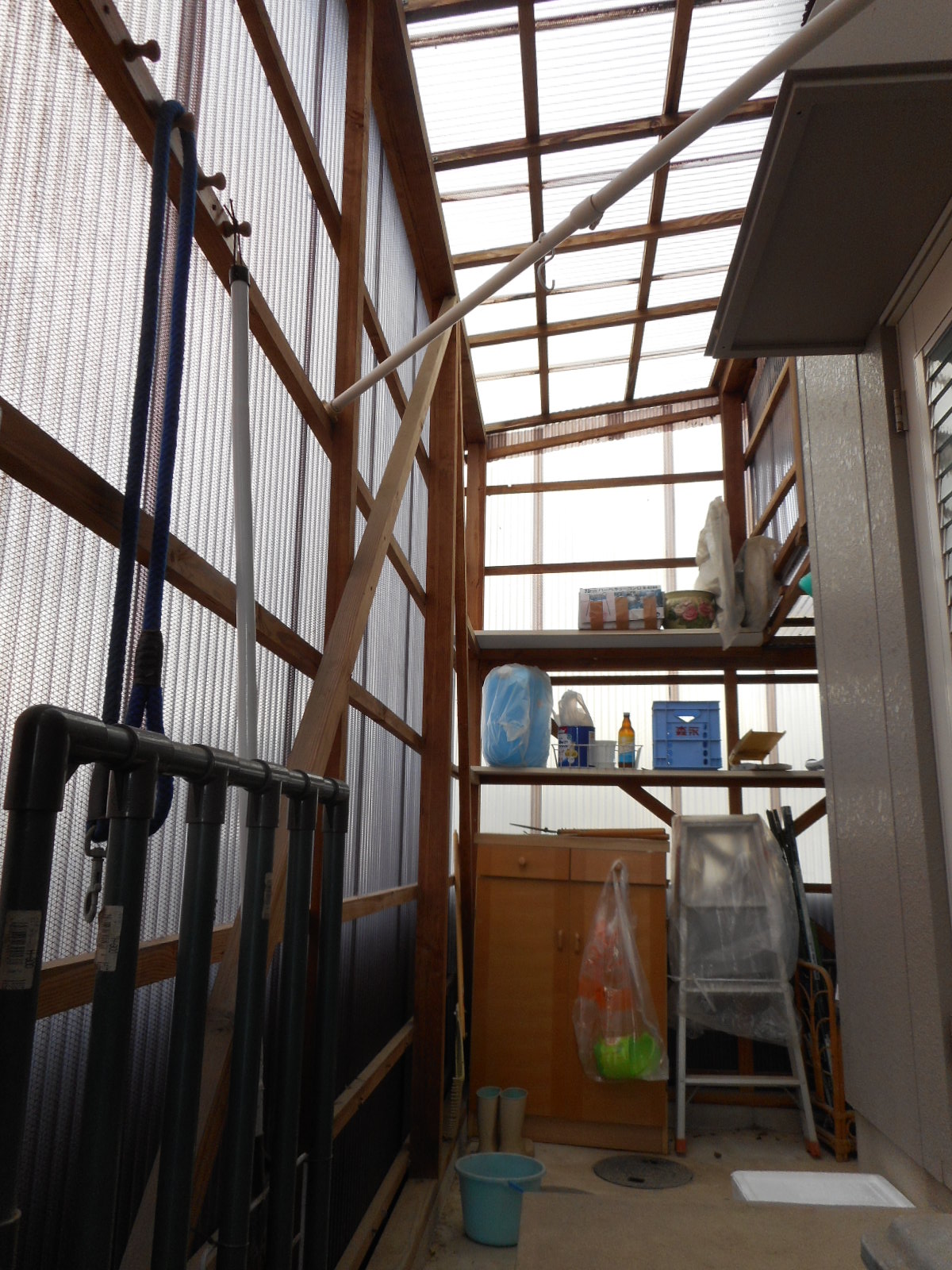 玄関側の手前の、赤線で囲った部分の屋根の波板が風で飛びました!! 玄関側、奥の内部を見る!!