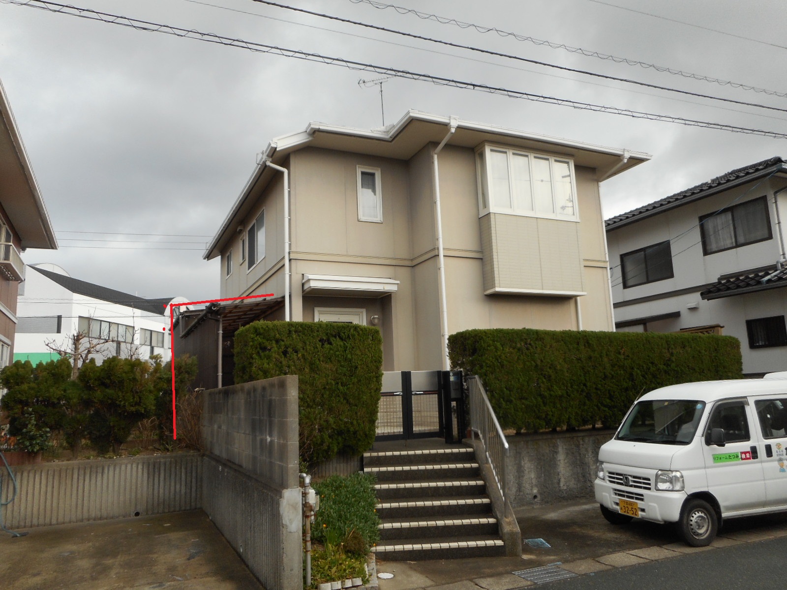 全容を玄関側から見る(赤線のところが倉庫ですL型に裏まであります)!!