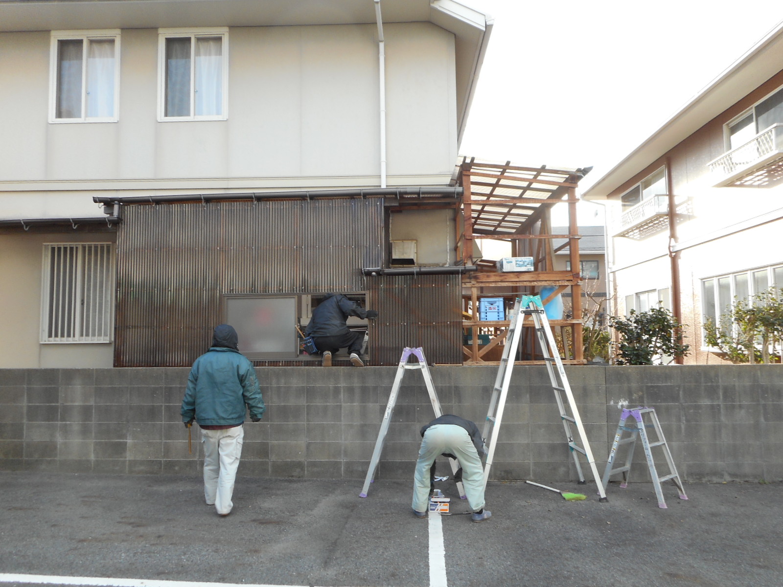 裏側の半分の波板を解体,撤去しました!! 撤去した部分に、新規波板を張って行きます!!