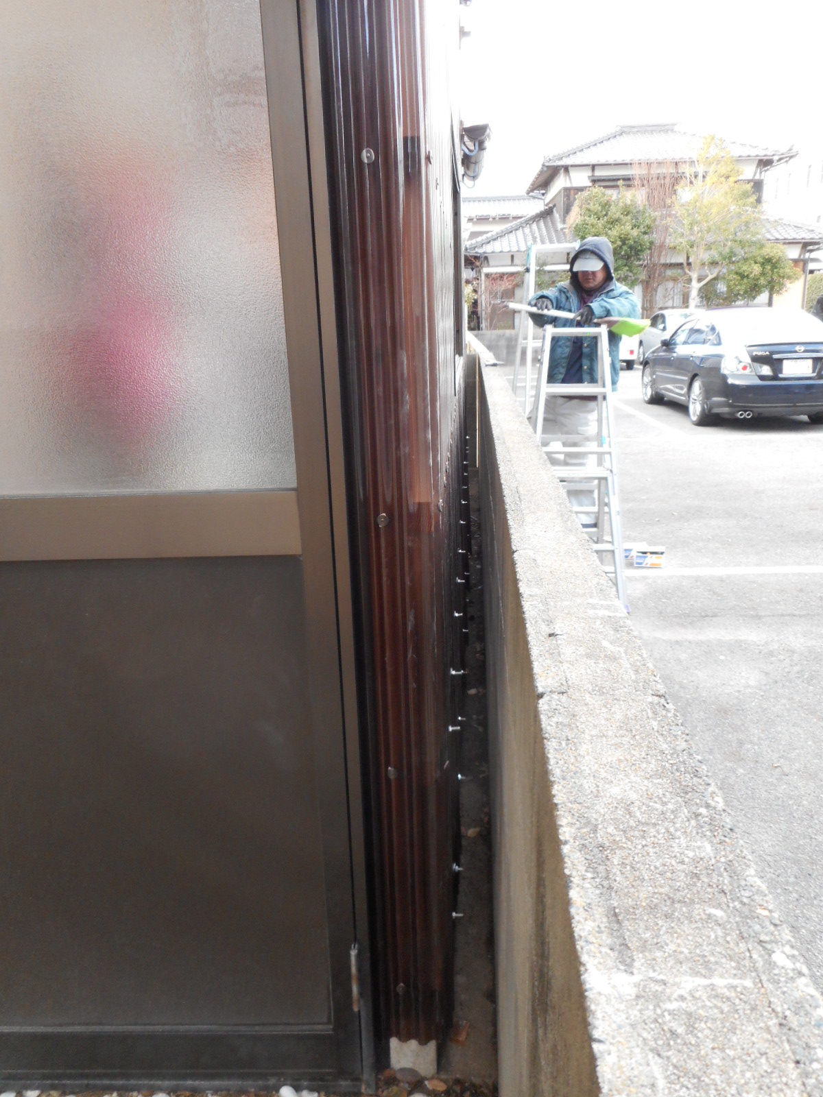 ご覧の様に、ブロック塀との間の隙間がわずかしかないため、この部分は内側から穴を明け、ナット式のフックを使用しての作業だったので、非常に手間がかかり、今回の作業は3人で3日間を要しまた。