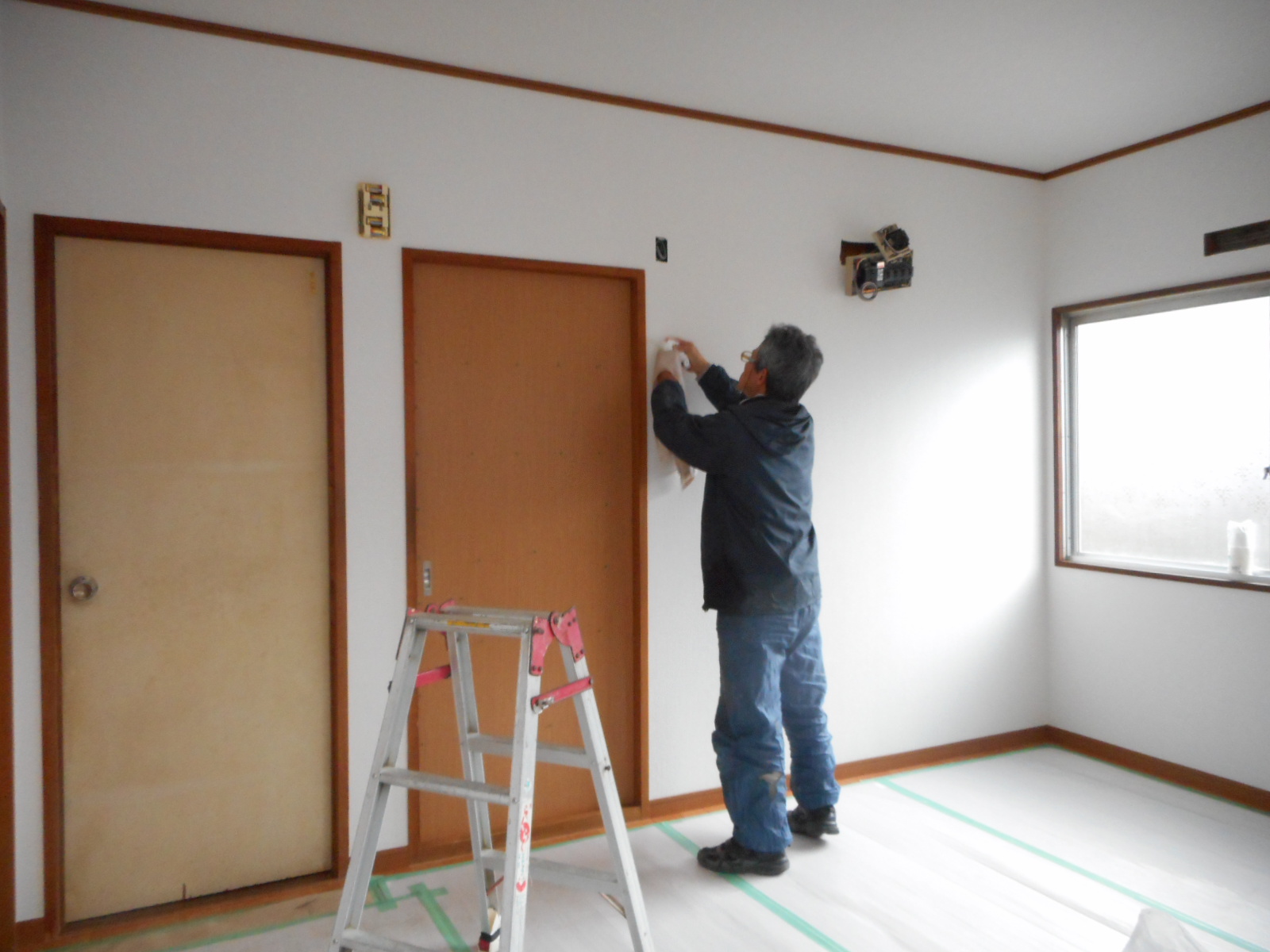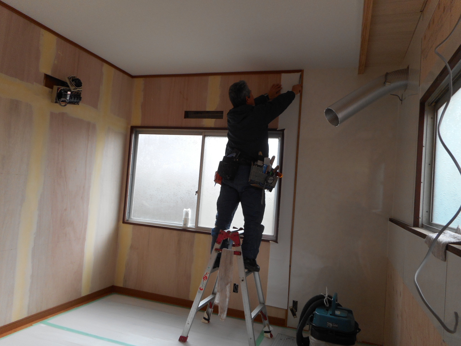 | 天井と壁廻りにクロスを張って行きます!! | クロスを張り終えたら、最後にジョイントコークで仕上げます!! |