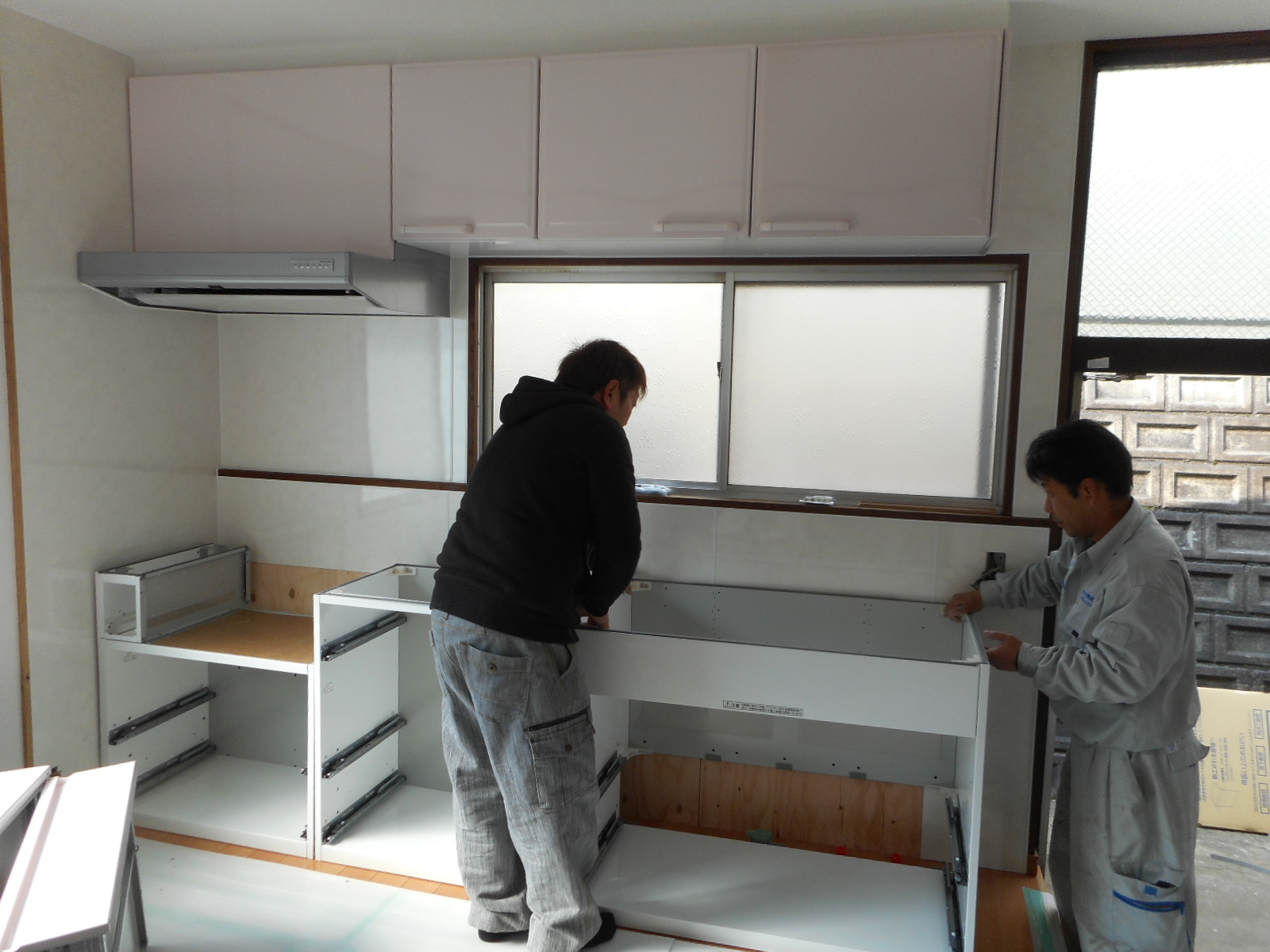 | 吊戸棚の組付けが終わったら、次は下台の組付けをします!! | 順次、下台の組付けをします!! |