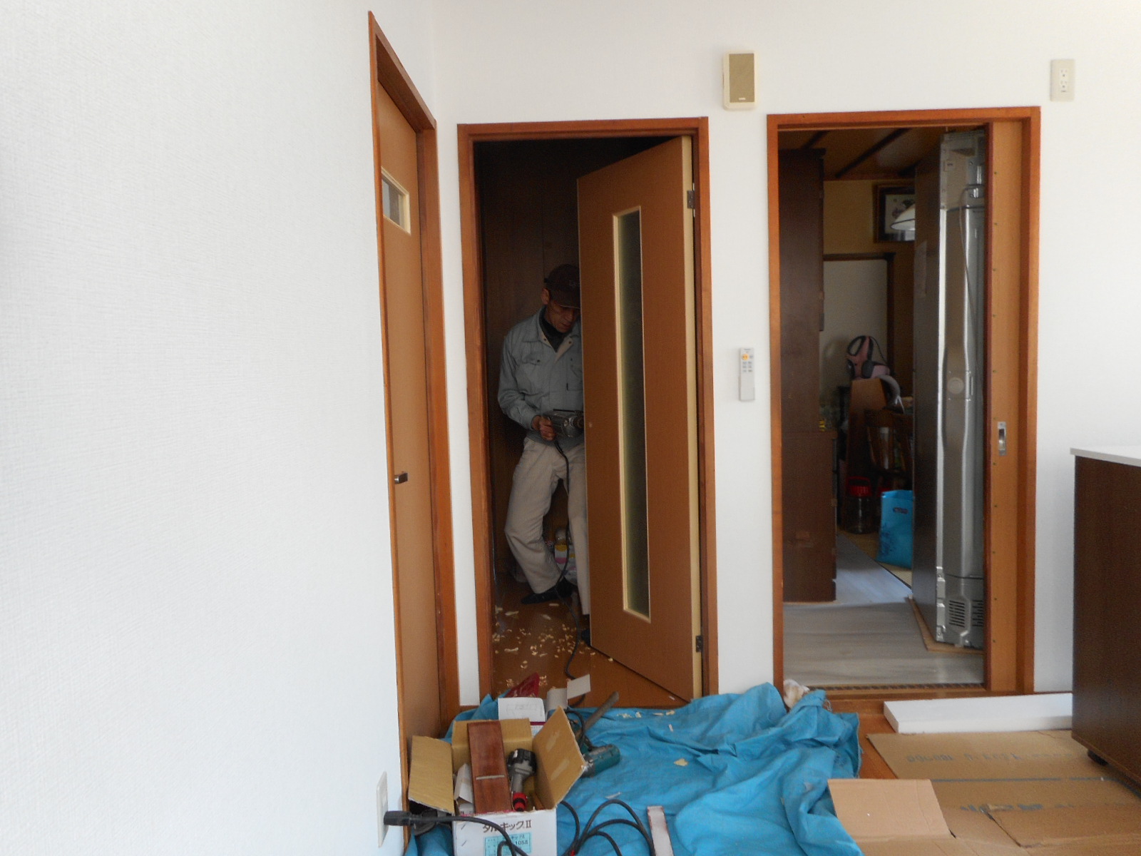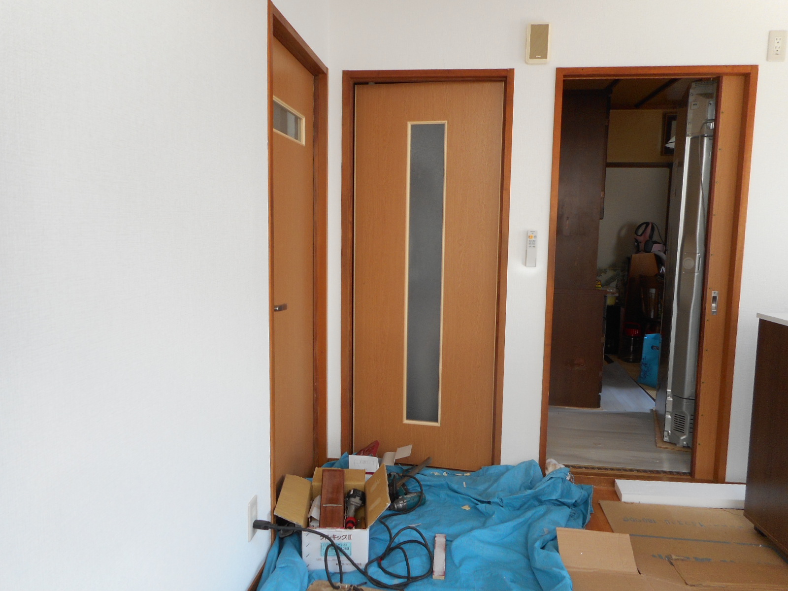 | 廊下からの入り口ドアも新しくします!! | 新規ドアの取付けが完了しました!! |