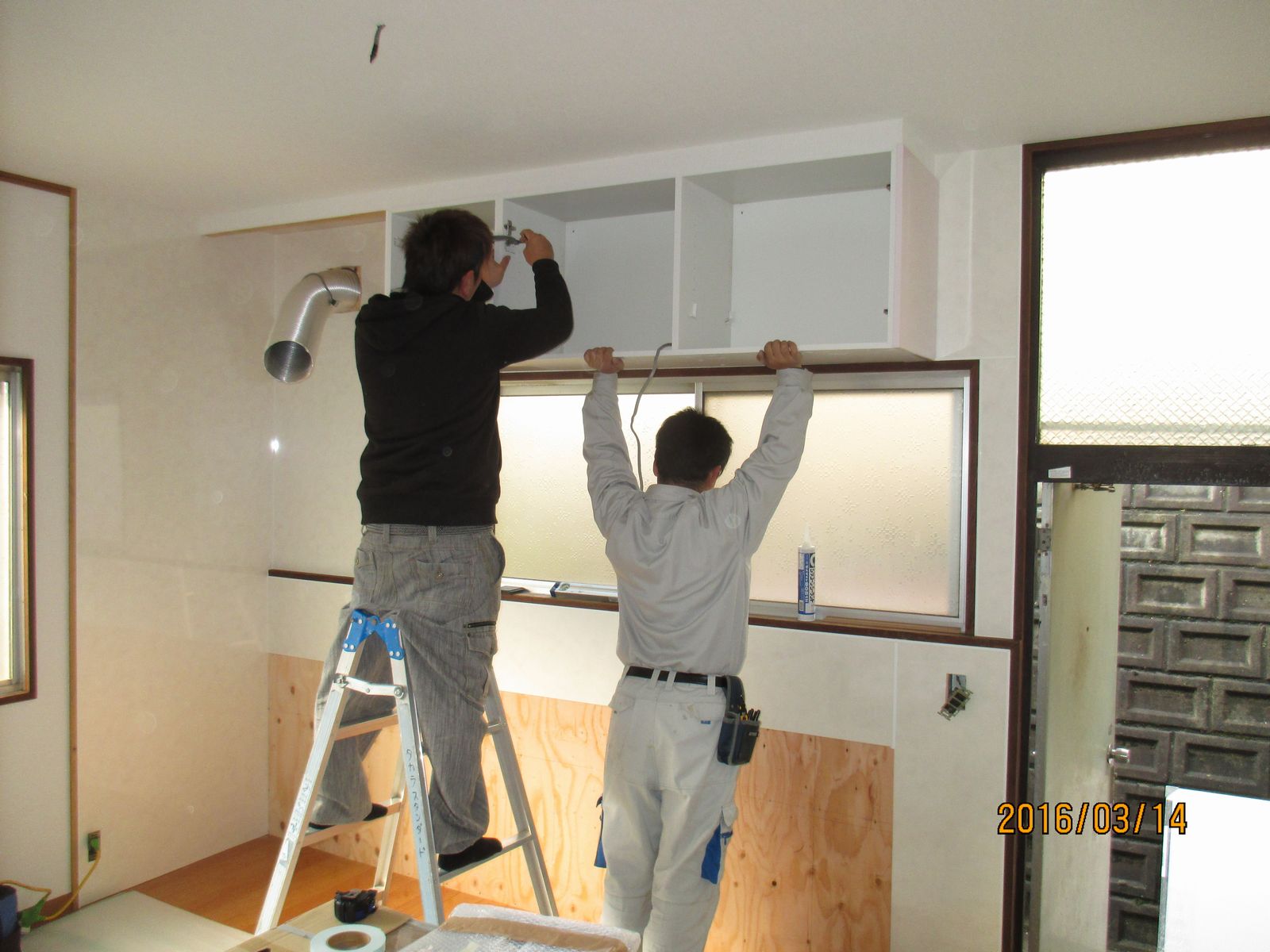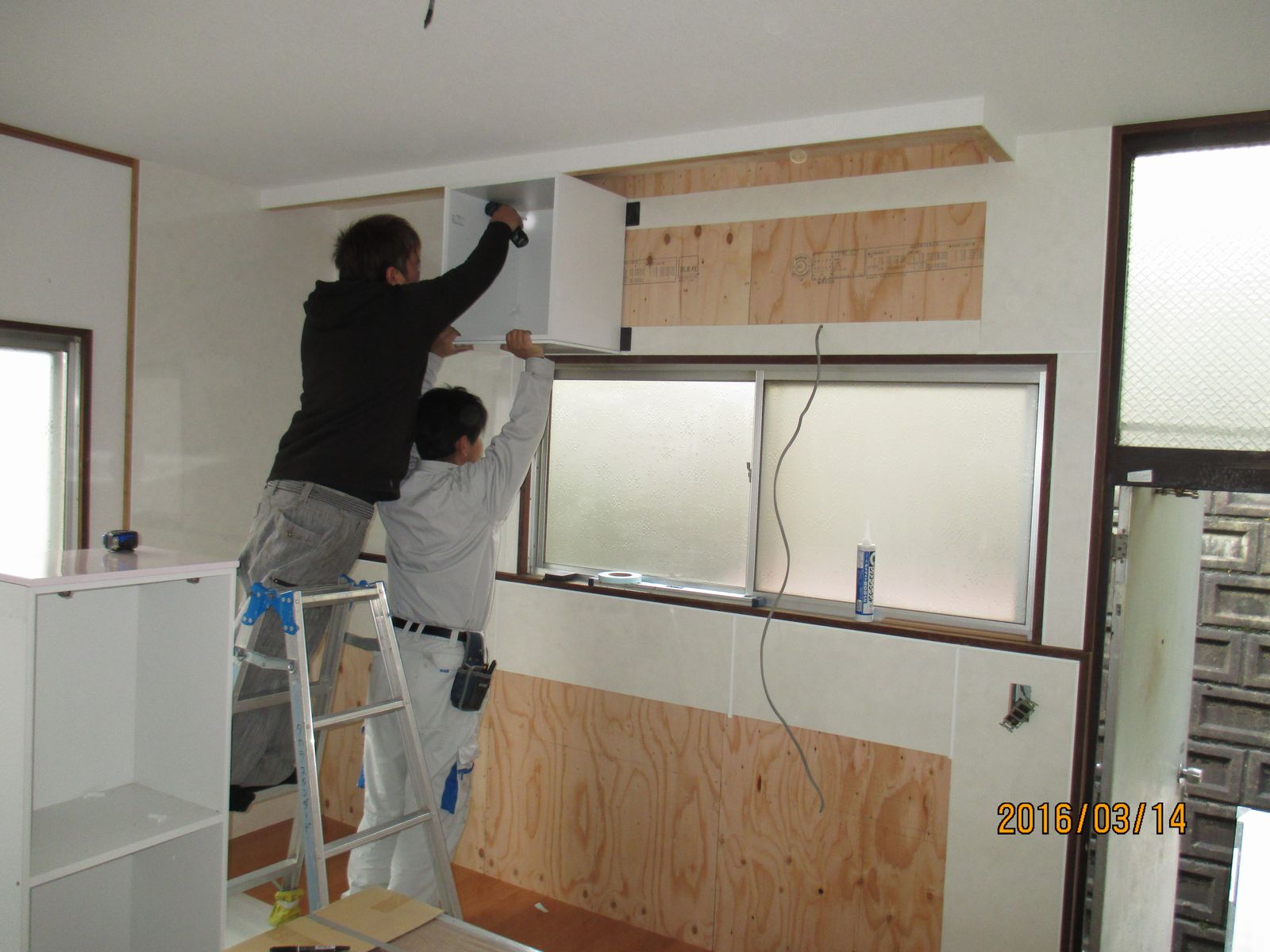 | 最初に、上の吊戸棚の組付けを行います!! | 順次、吊戸棚の組付けをします!! |