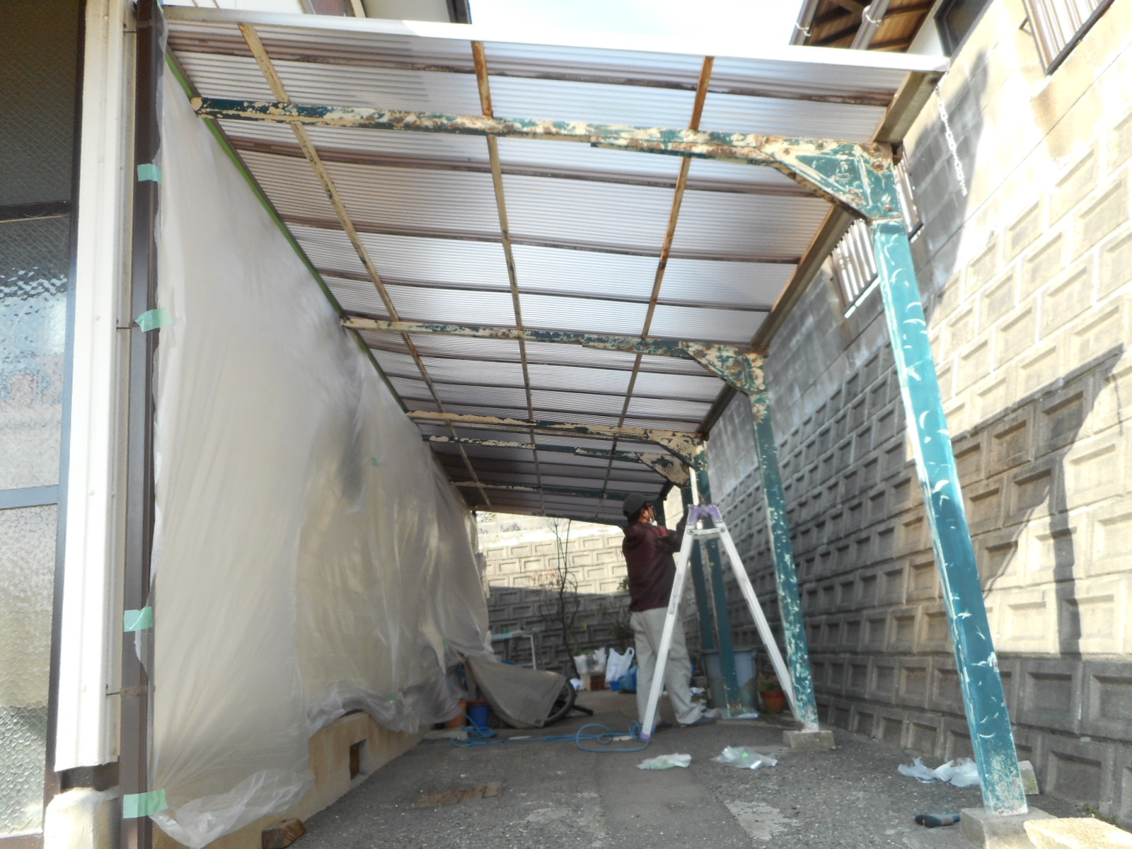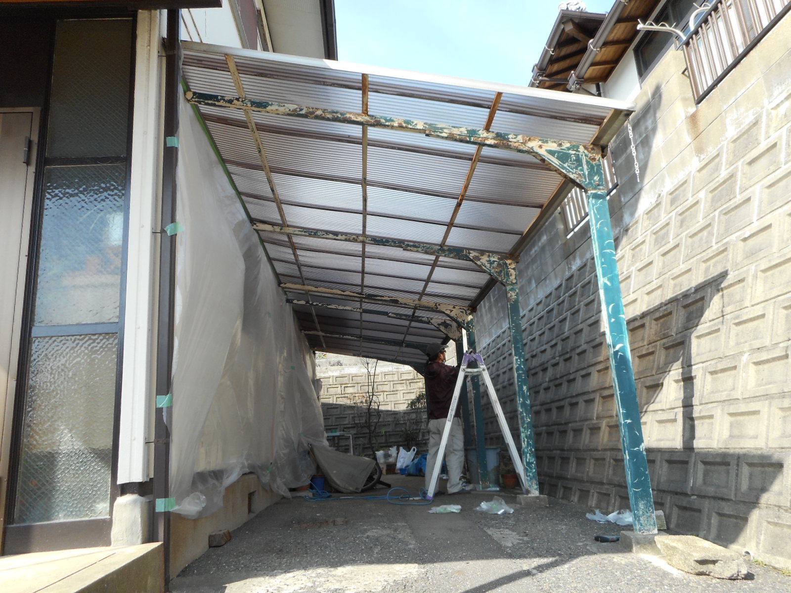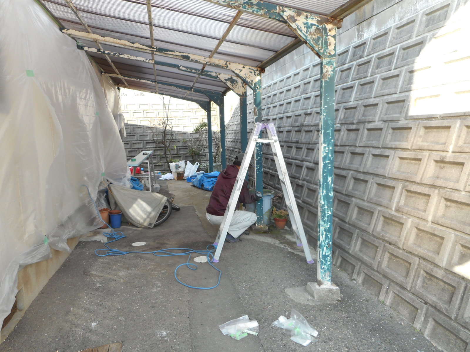 | 浮いている部分をサンダーで、しっかりケレンします!! | ケレン作業が終わったら、サビている部分にサビ止め塗料を塗りました!! |