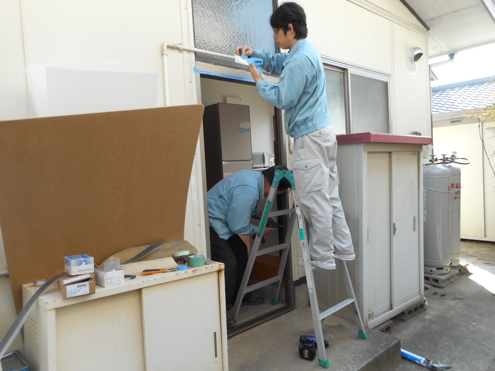 | 既存のドアを撤去し、既存のドア枠の上に新規のドア枠を取付けます!! | ドア枠の廻りに、雨水の浸入を防ぐためのコーキングを打ちます!! |