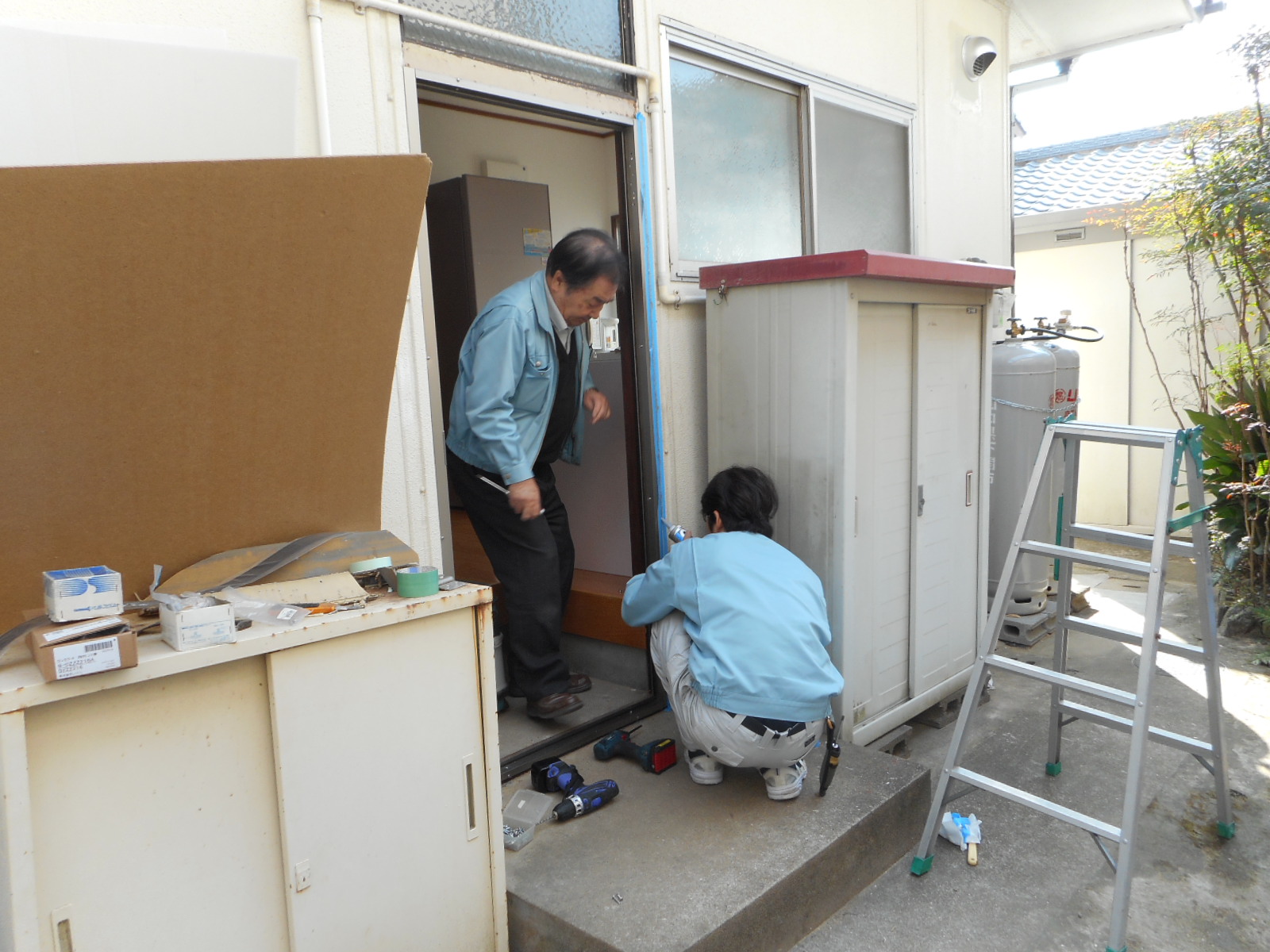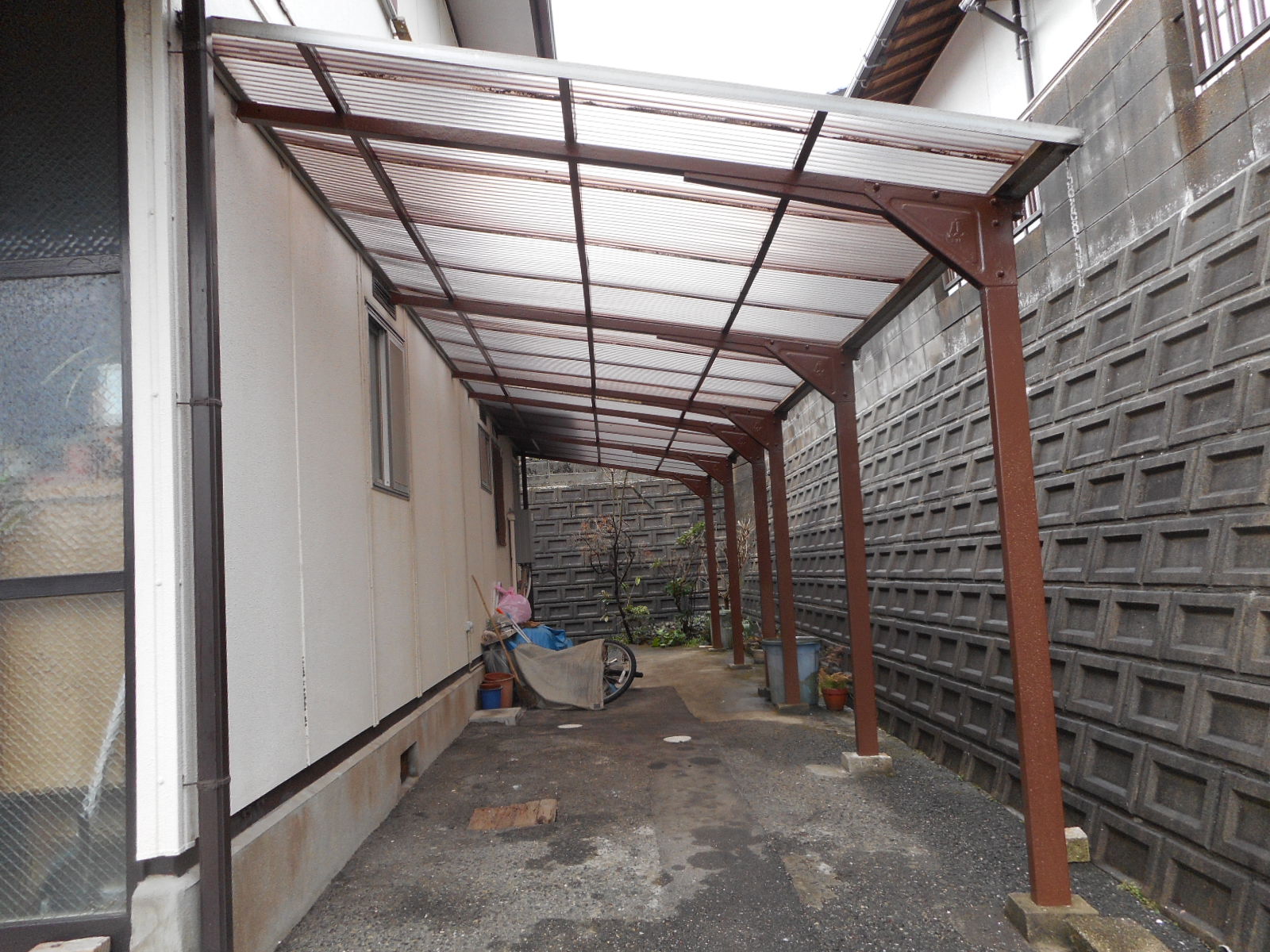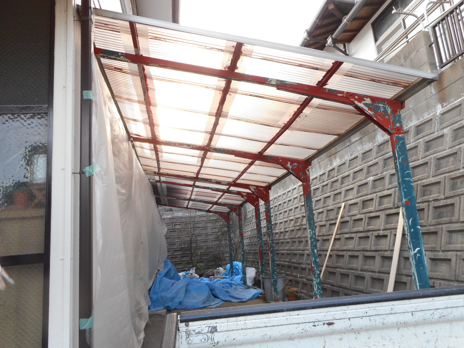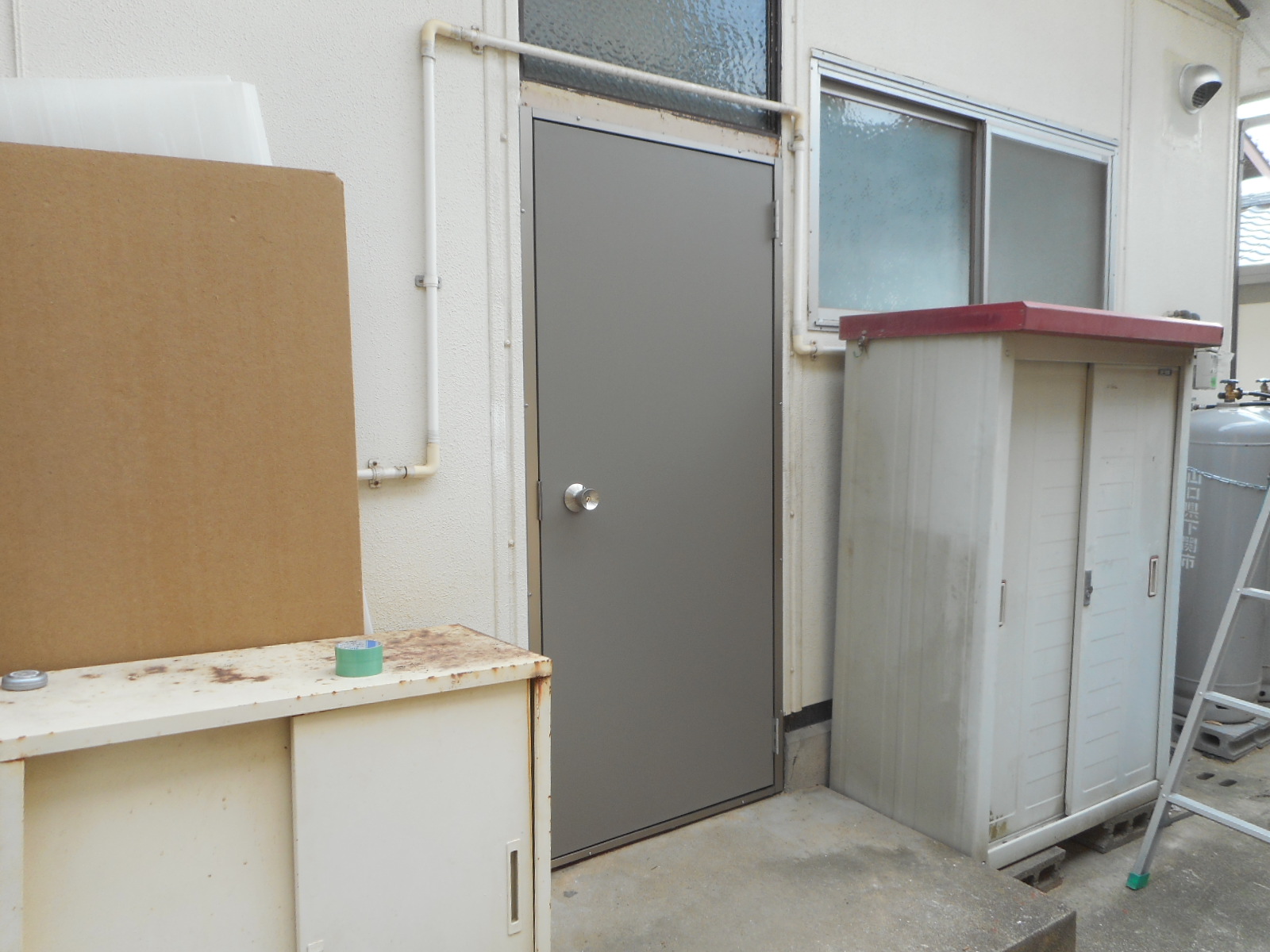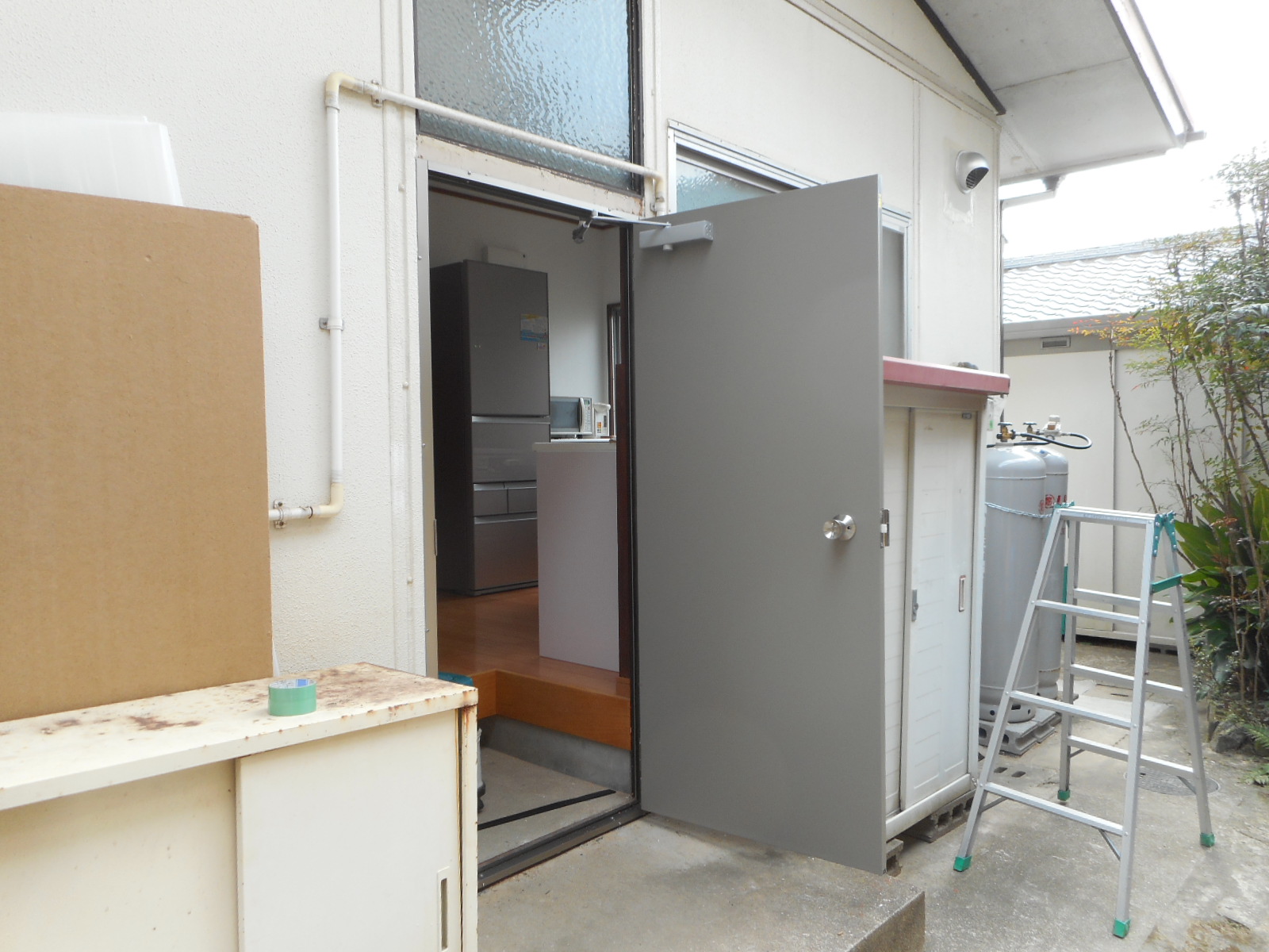 前回のブログで紹介した、台所の改修工事をした長府満珠町の施主さんから、更なる追加工事として勝手口のドアの交換と鉄骨で出来たテラスの塗装の依頼がありました。