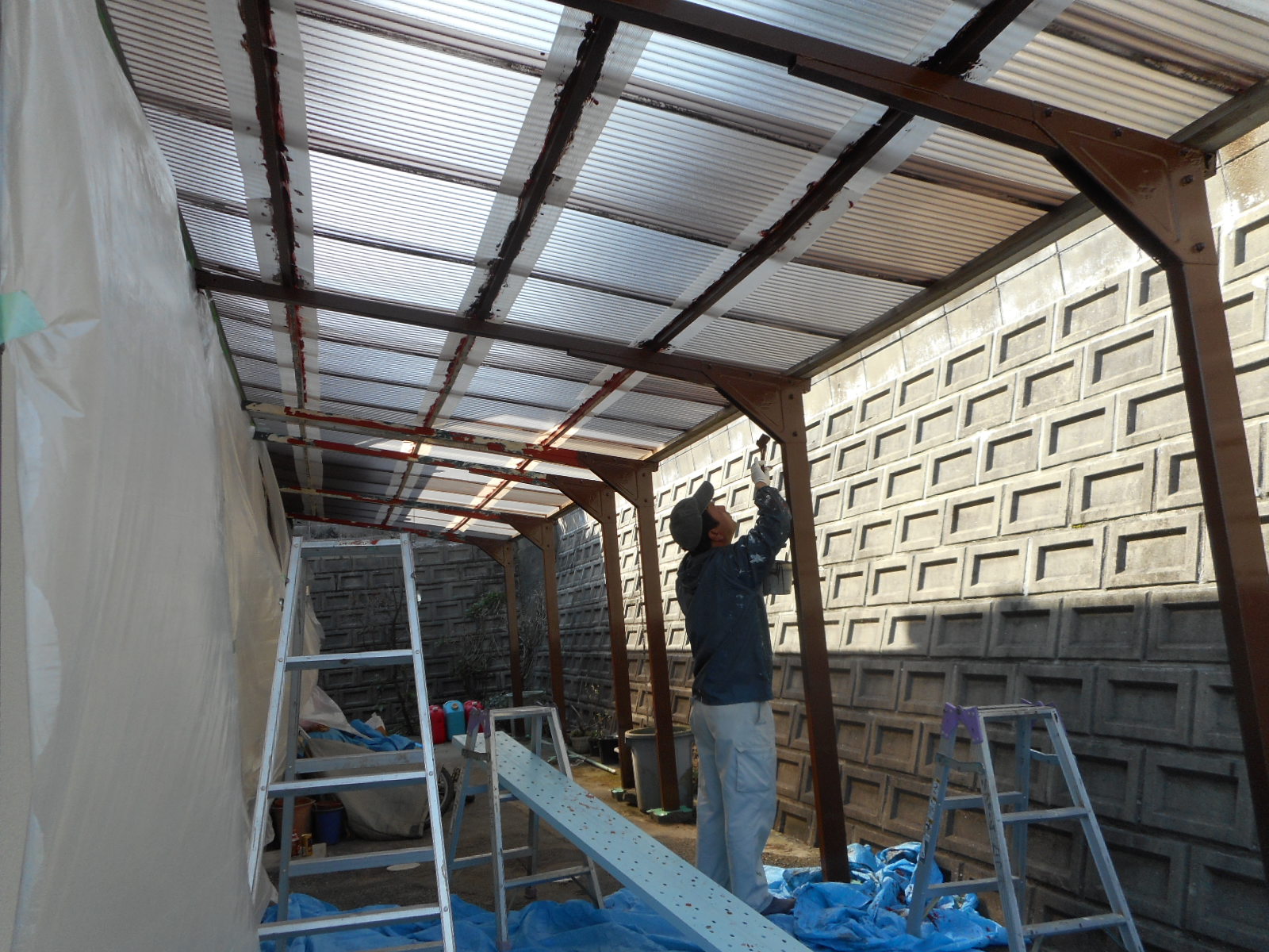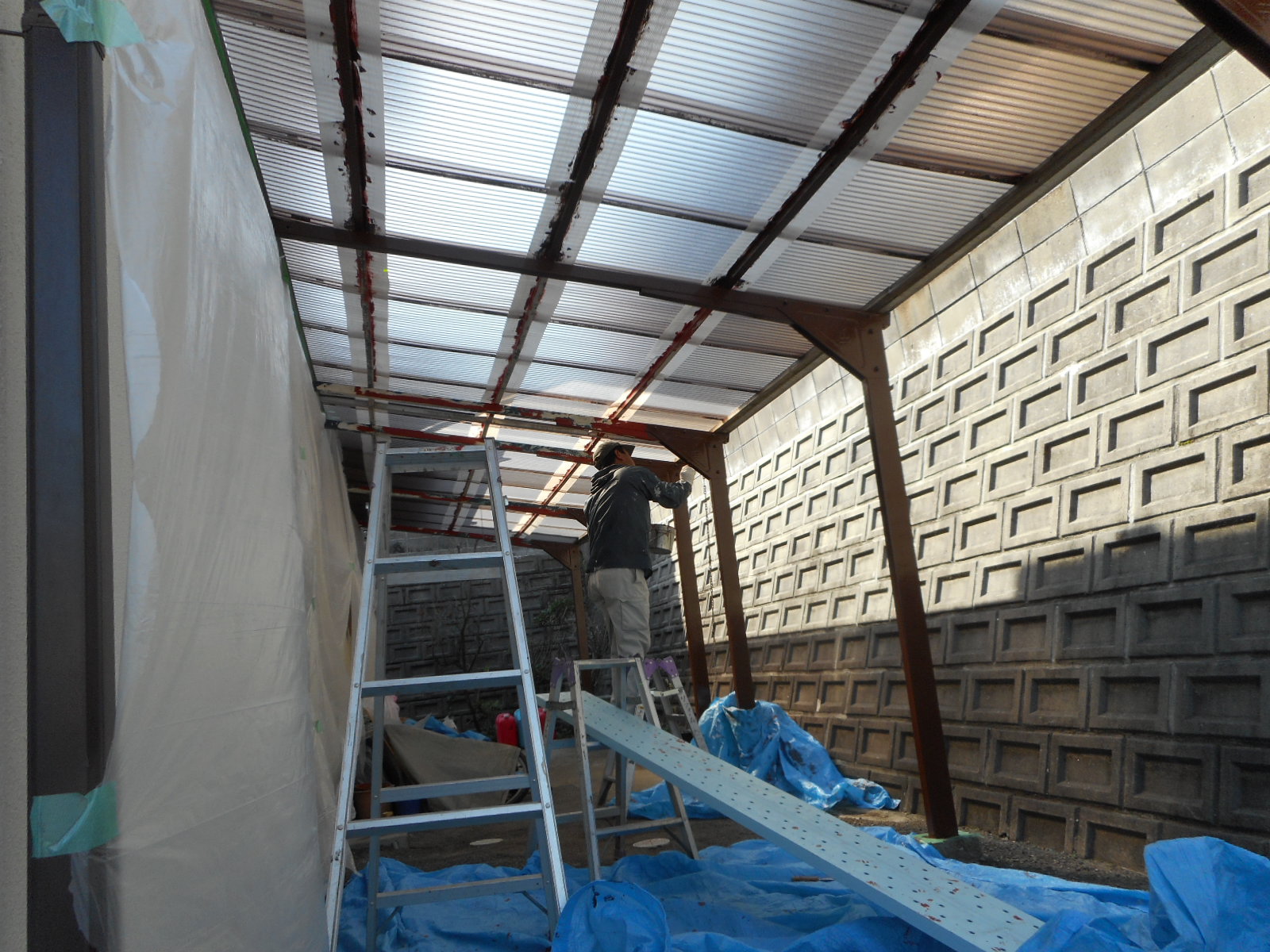 *工事前の状態(鉄骨の骨組みで出来たテラスの鉄骨部分の塗装が、いたる所で剥がれていて状態が悪いため、塗装をやり直すことにしました<ケレン作業中です>)!!