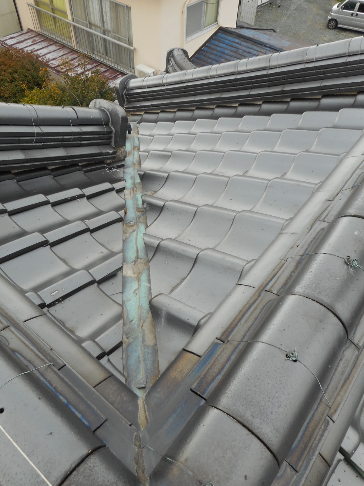 板金を交換し、撤去していた尾棟の、のし瓦を元に戻し、谷の板金の交換作業の完了です!!