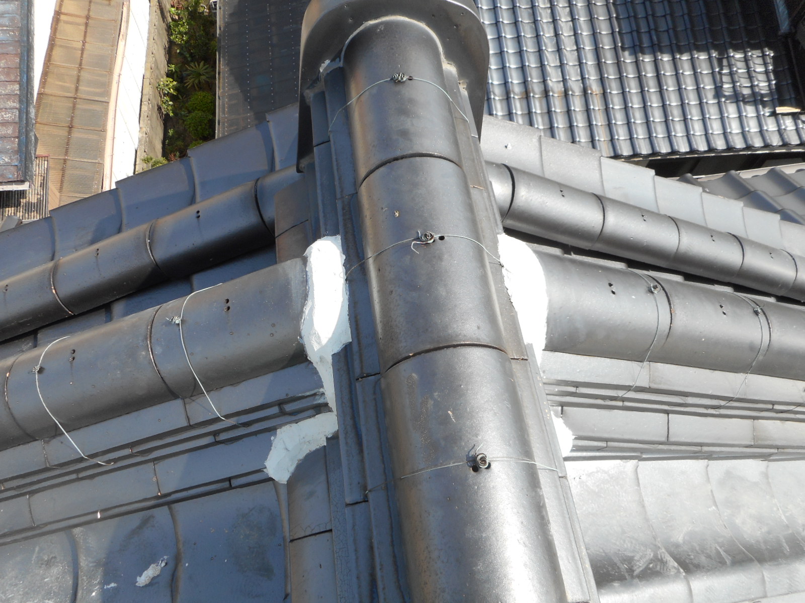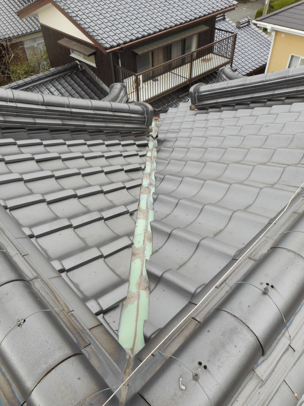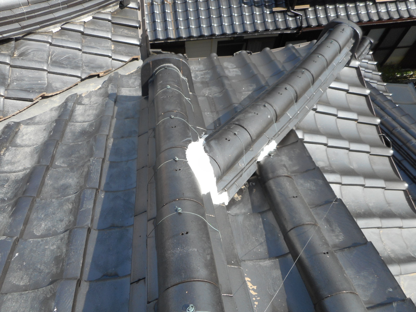 ◎上の作業の時に、気が付いたのですが棟のノシ瓦と尾棟のノシ瓦の接続部分のシックイが殆ど割れていることが分かり、施主さんに伝えて、悪いところは、すべれ補修することにしました。