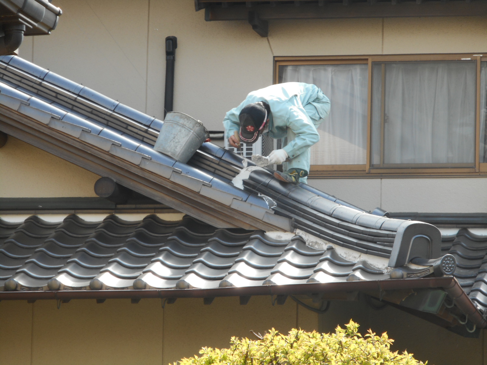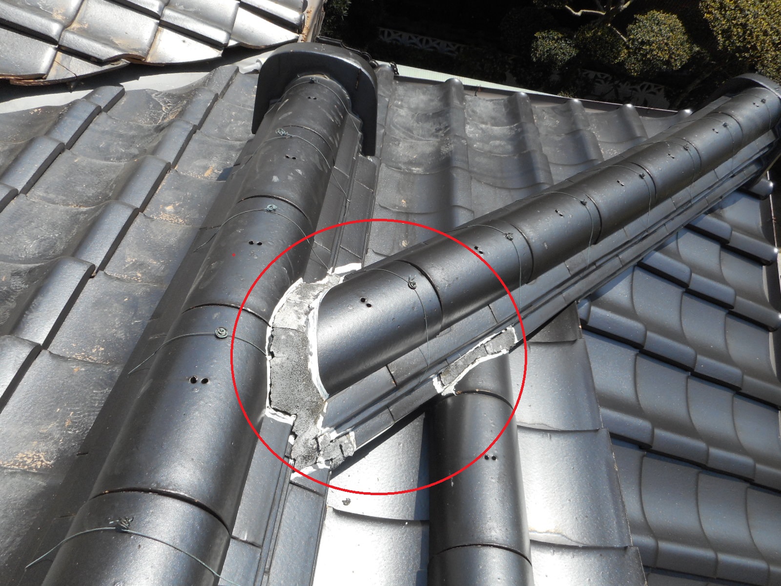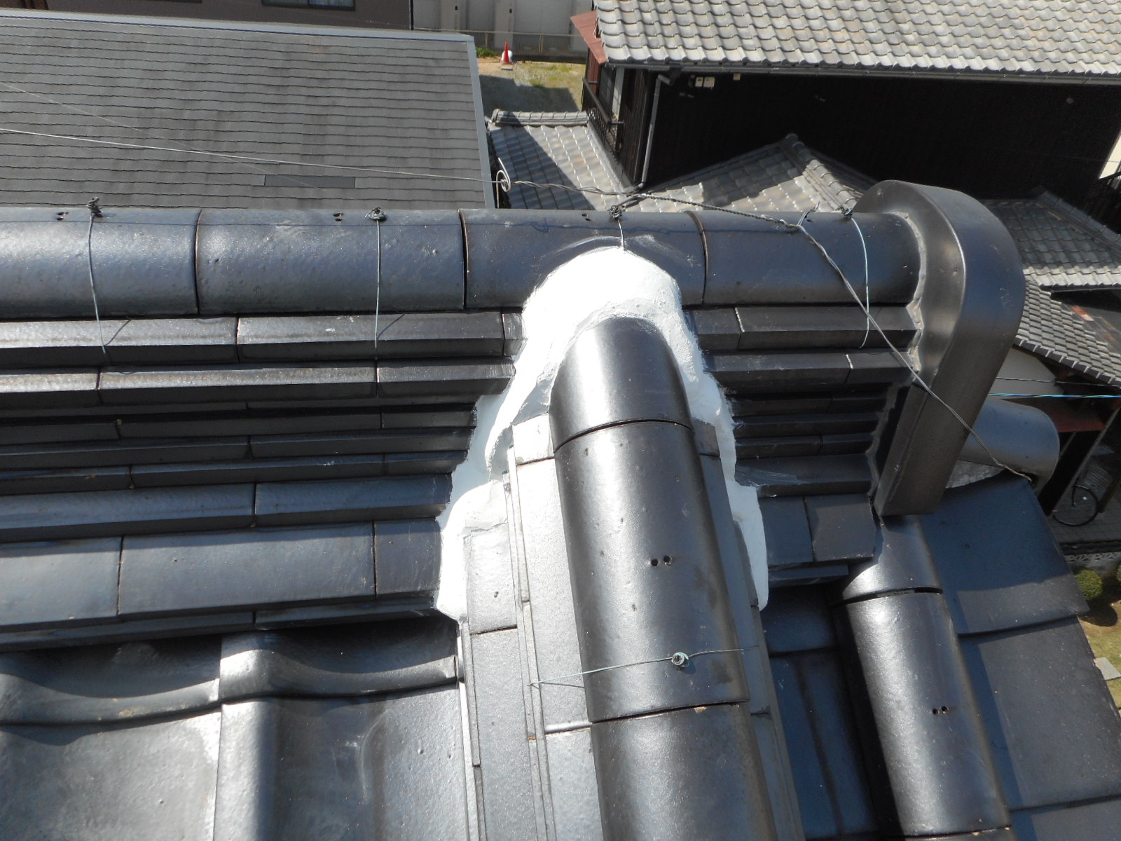 ◎上の作業の時に、気が付いたのですが棟のノシ瓦と尾棟のノシ瓦の接続部分のシックイが殆ど割れていることが分かり、施主さんに伝えて、悪いところは、すべれ補修することにしました。