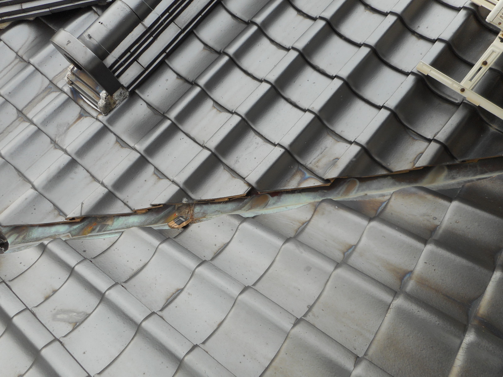 ◎室内の数箇所で雨漏れがすると言うことで、屋根に上がり調査したところ1、2階の屋根のコーナー部分に4箇所ある谷の板金の状態が悪く、そこから雨漏れがすることが分かりました。