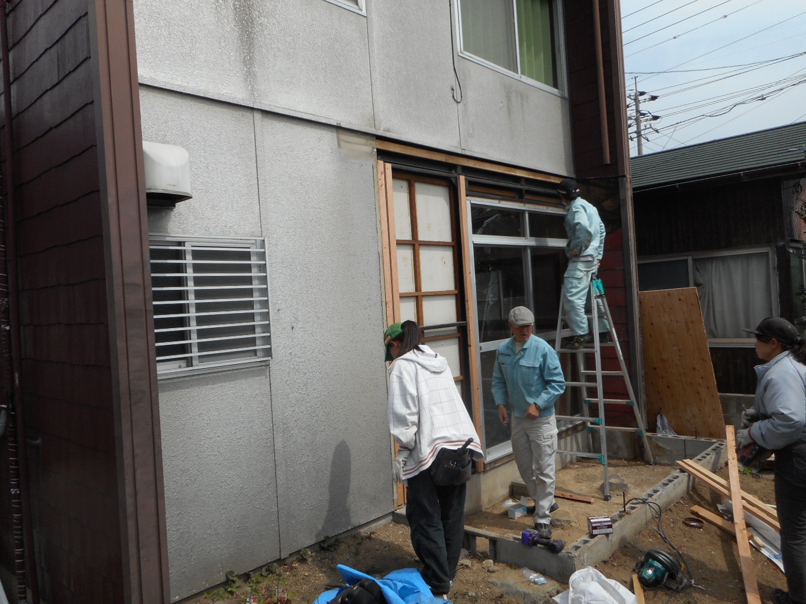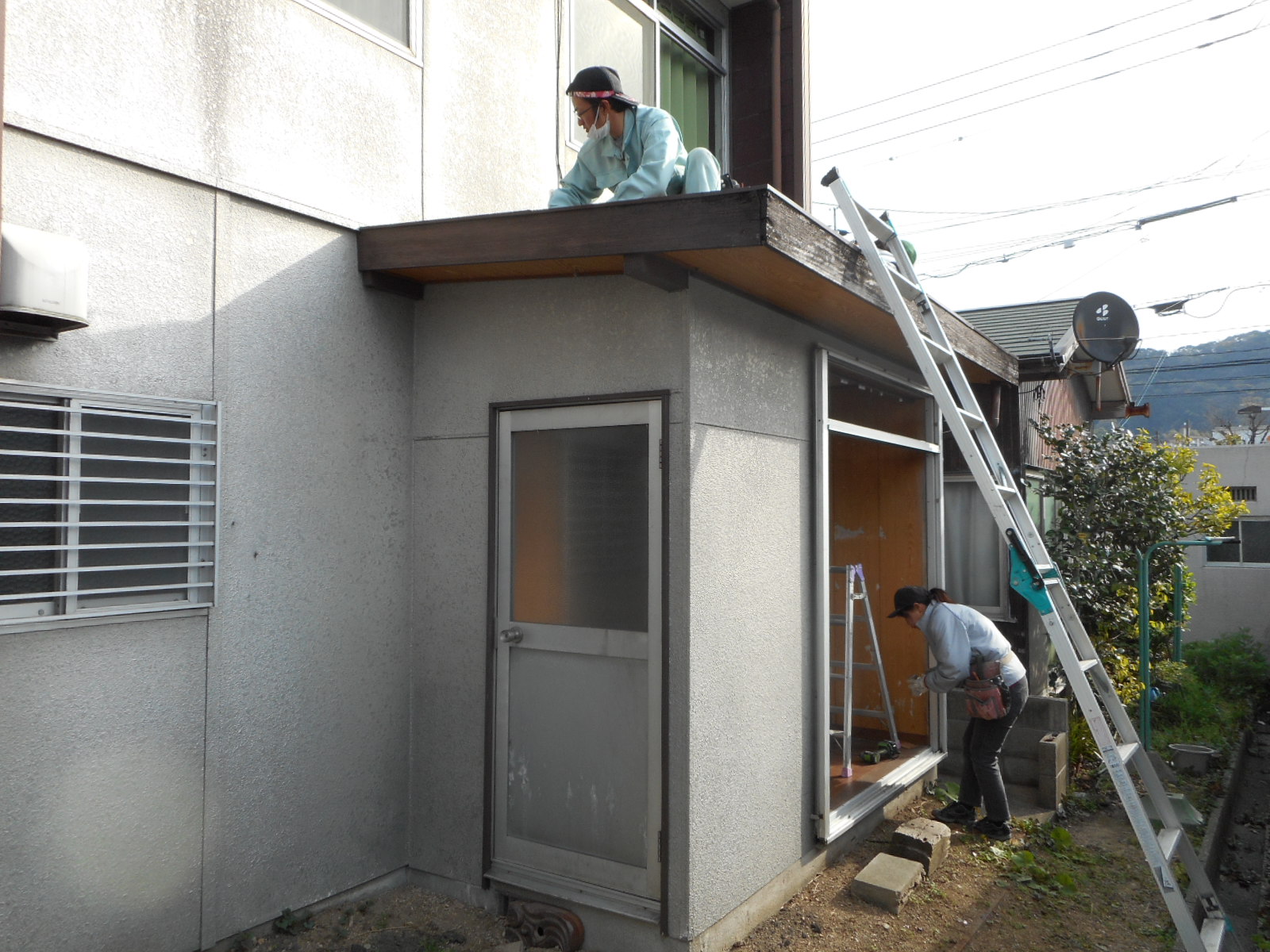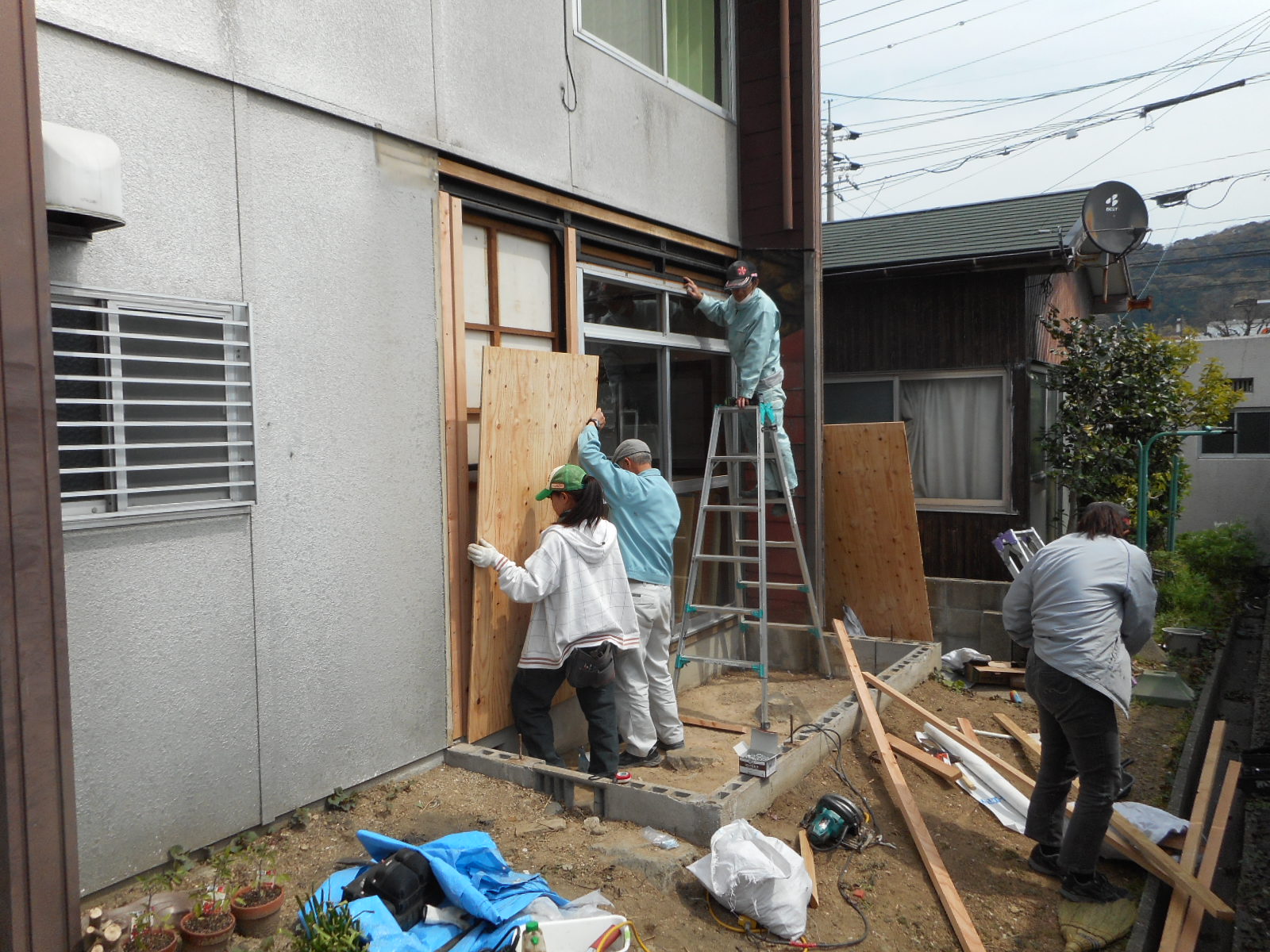 雨が降るといけないので、壁廻りの応急修理をします(下地コンパネを施工します)!!