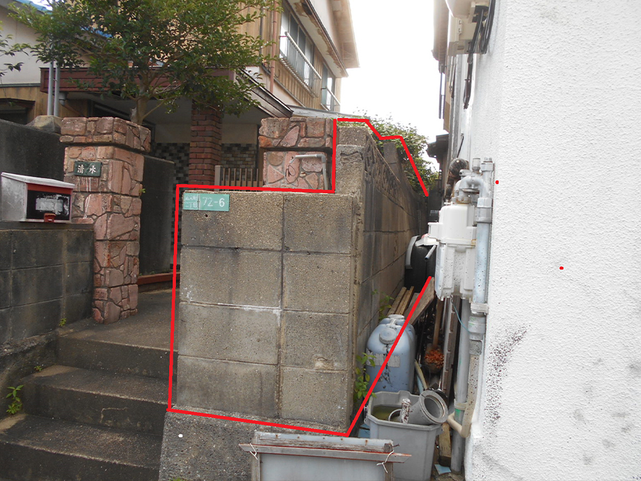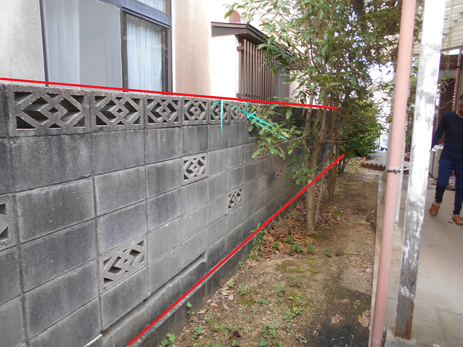 ・赤線で囲った、お隣との境界ブロック(約20m)がかなり傾いていて危険な状態なので全面解体撤去し新規に3段ブロックを積み、その上にフェンスを取付けます。