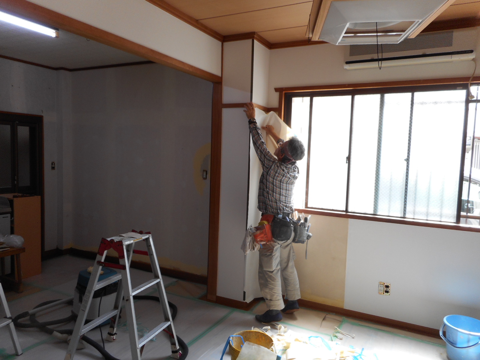 | 店舗側の壁の下地づくりも完了です!! | 壁廻りのクロスを張替えます!! |