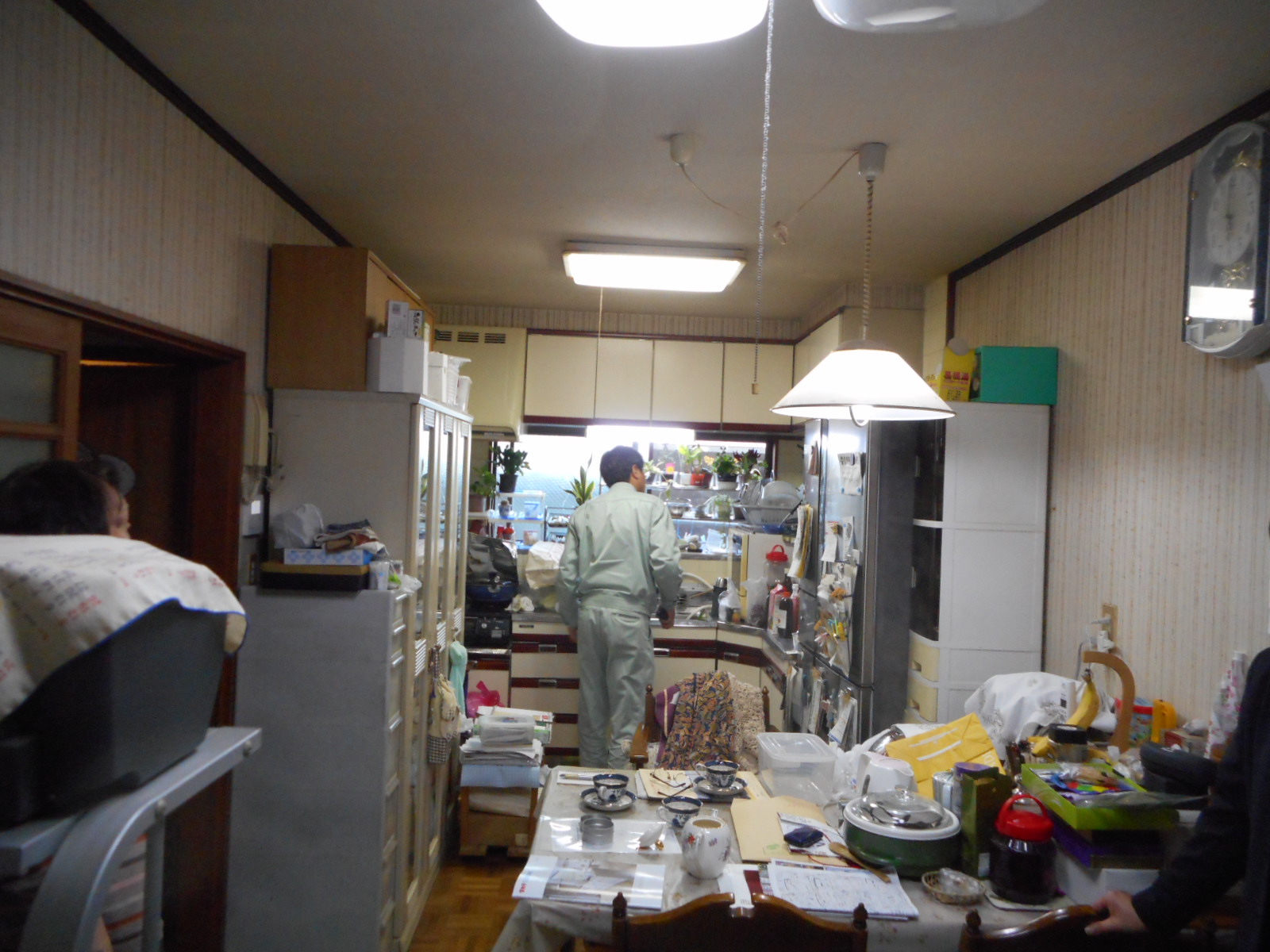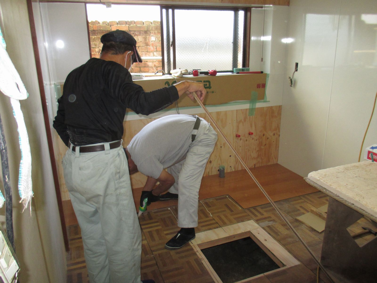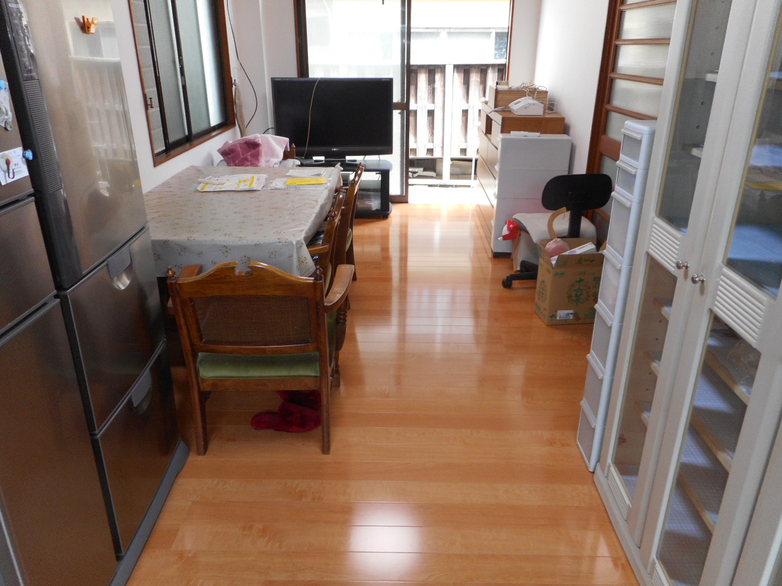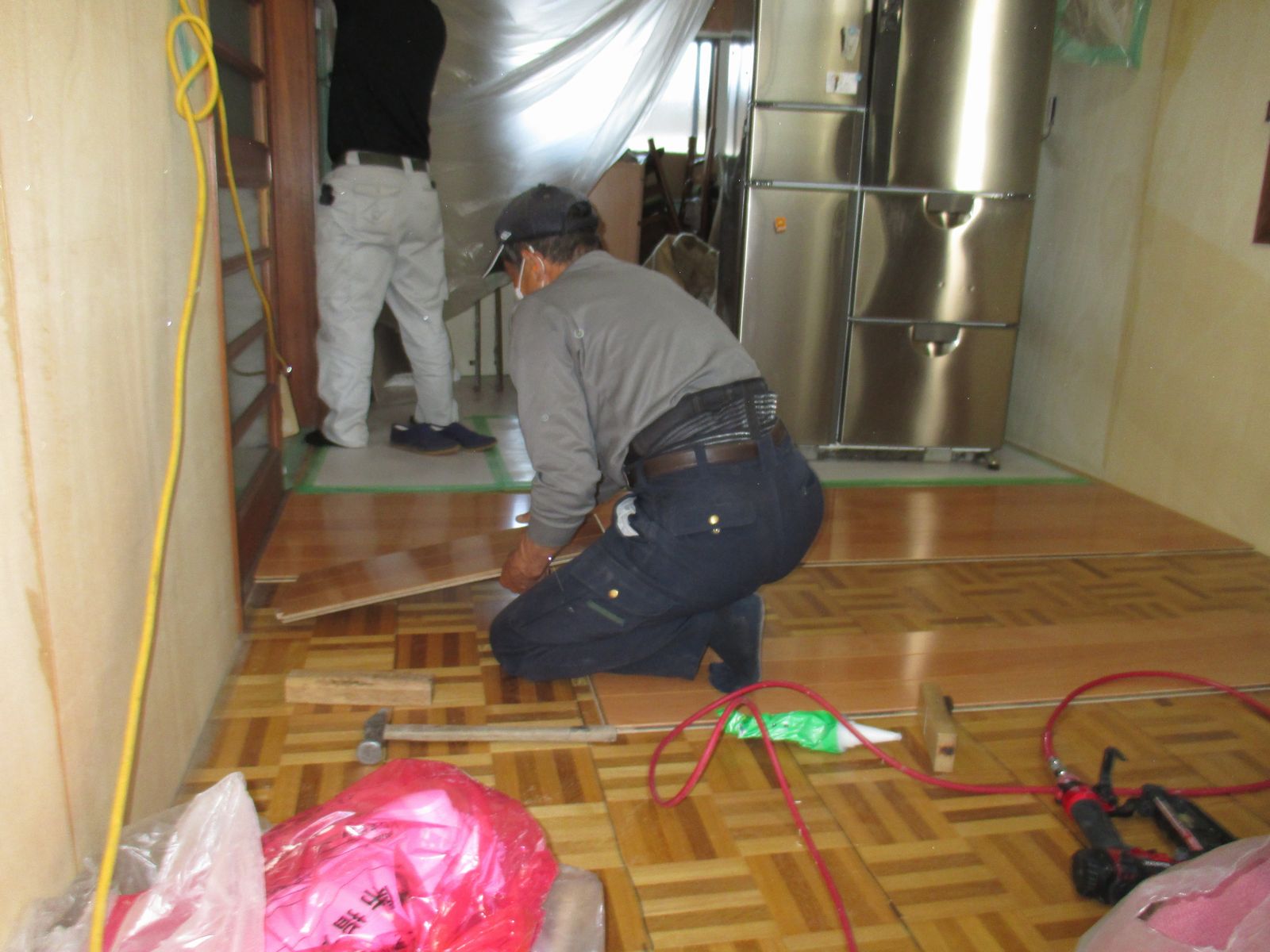 | キッチン側から、新規のフロア材を既存上部より施工して行きます!! | 荷物を移動しながら、フロア材を順次施工して行きます!! |
