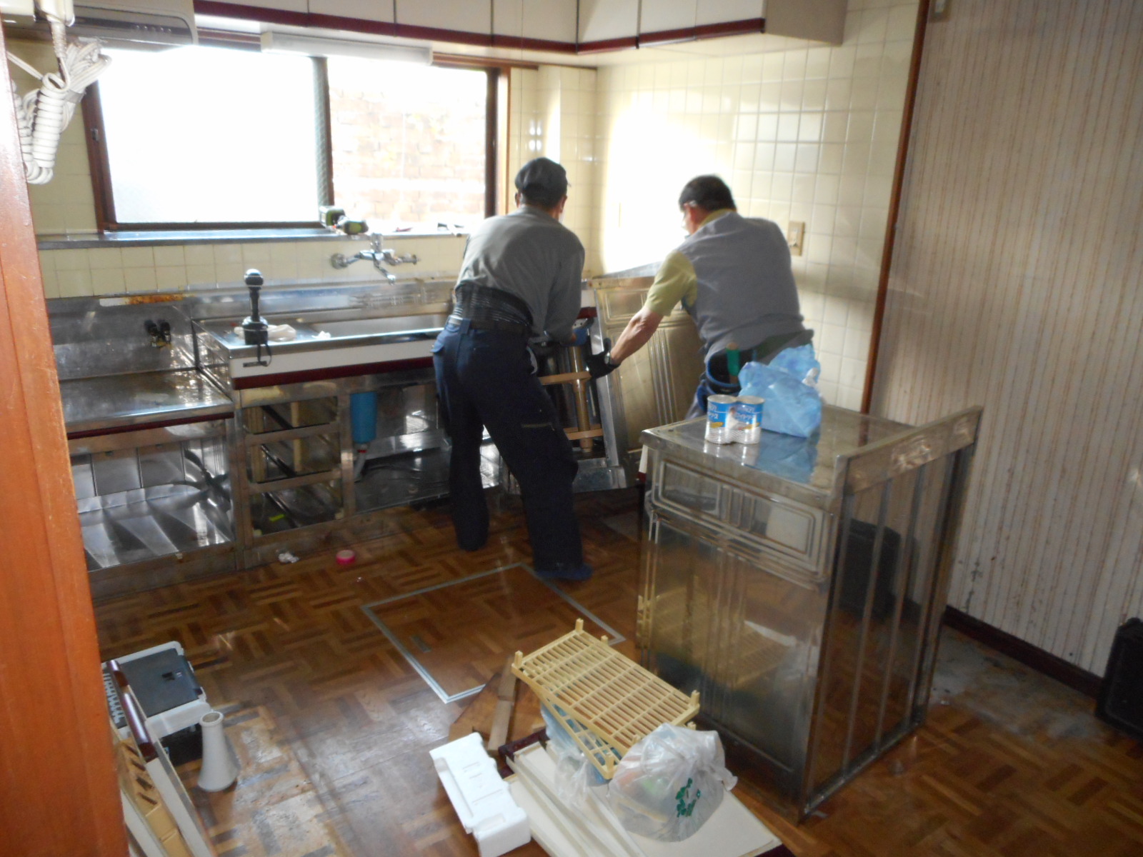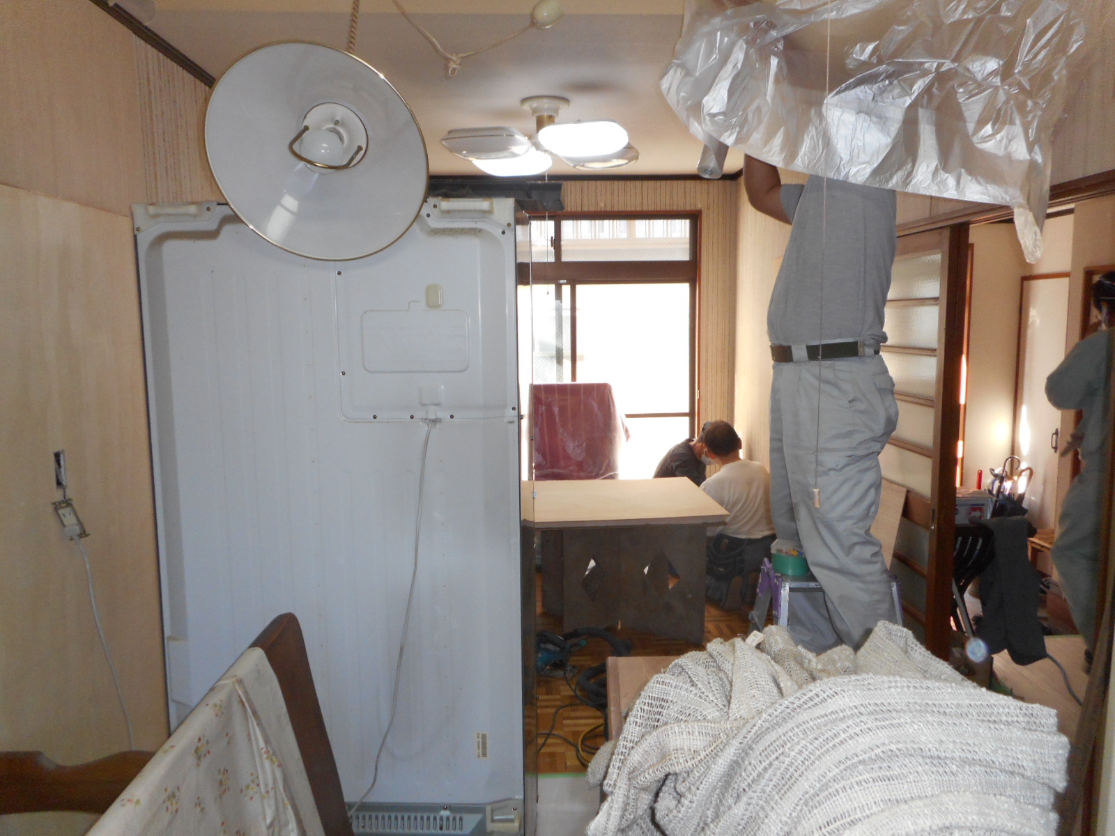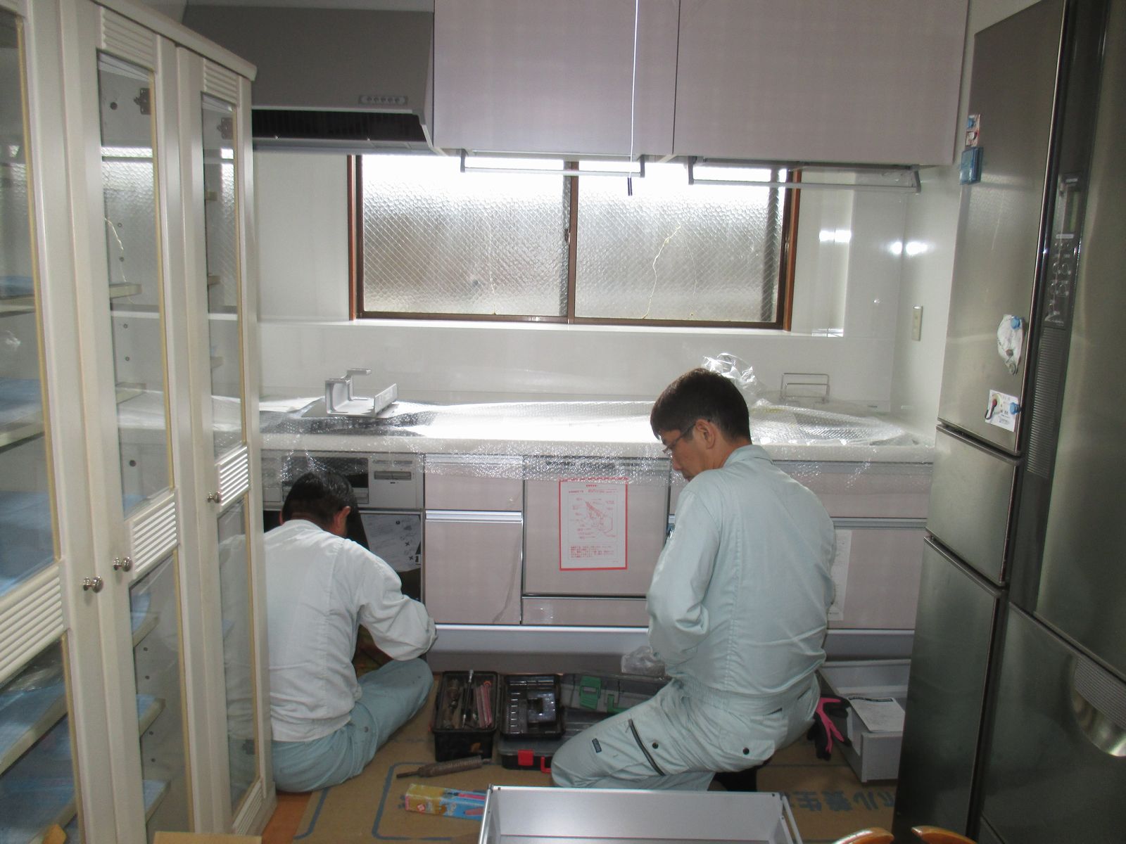 | 解体作業の様子!! | キッチンパネルの施工の様子!! |