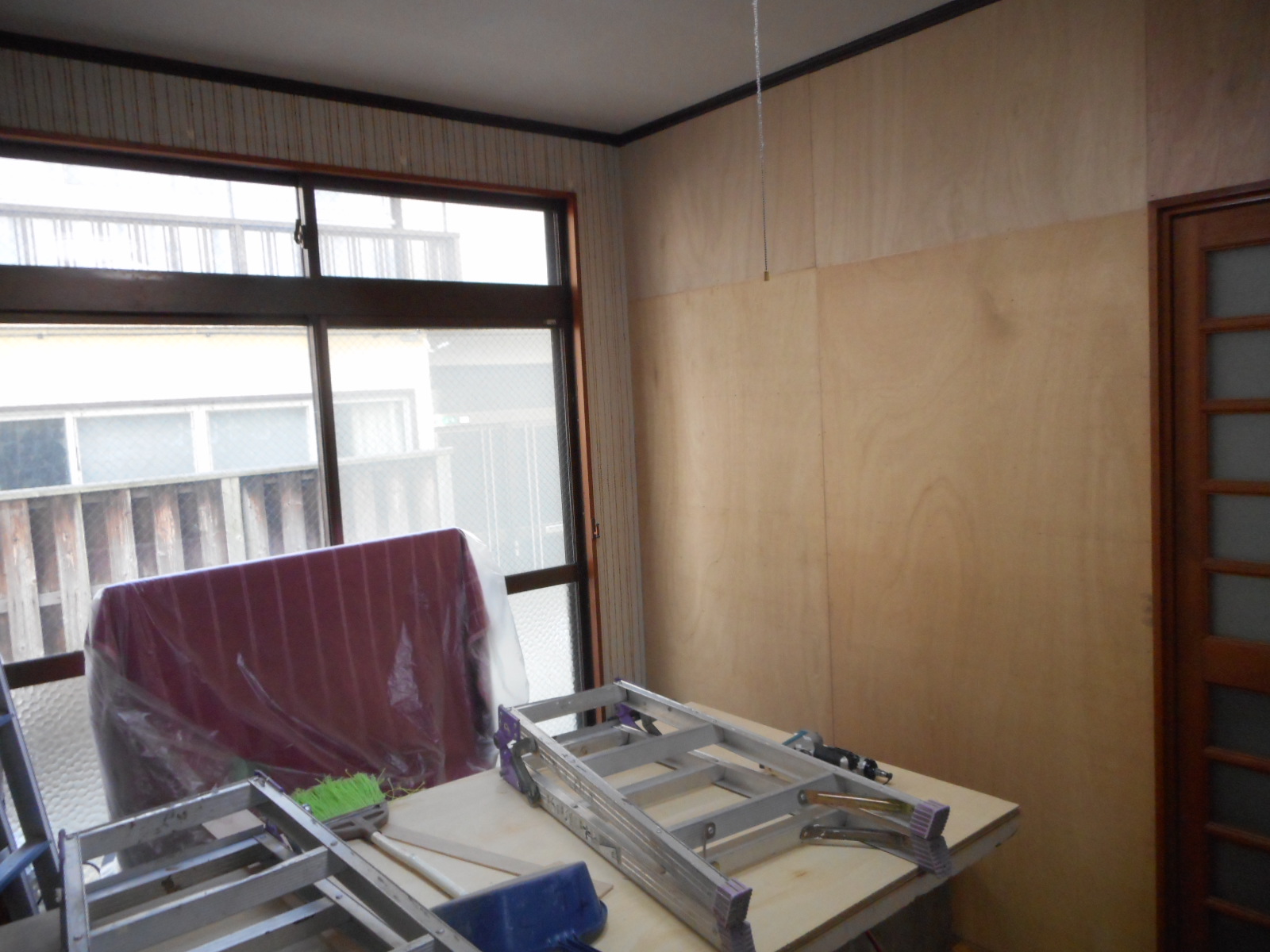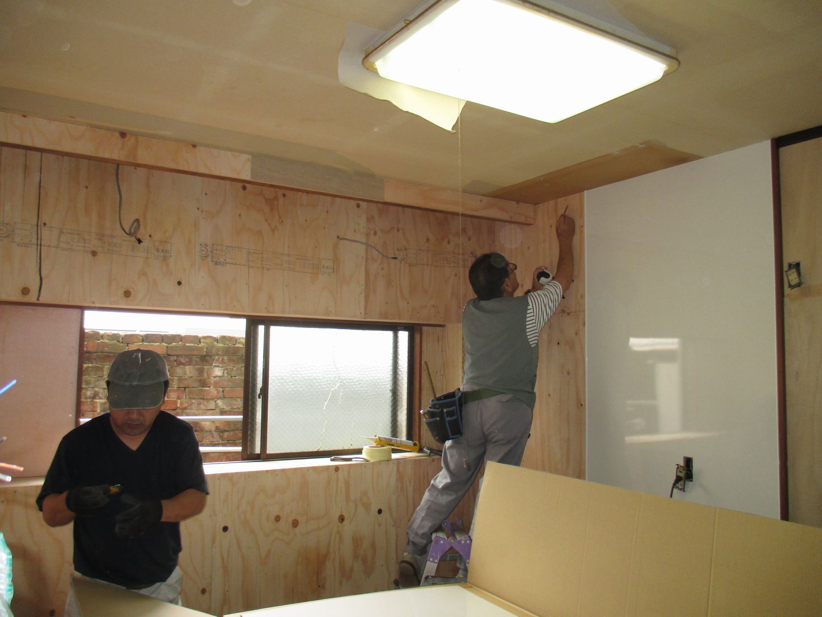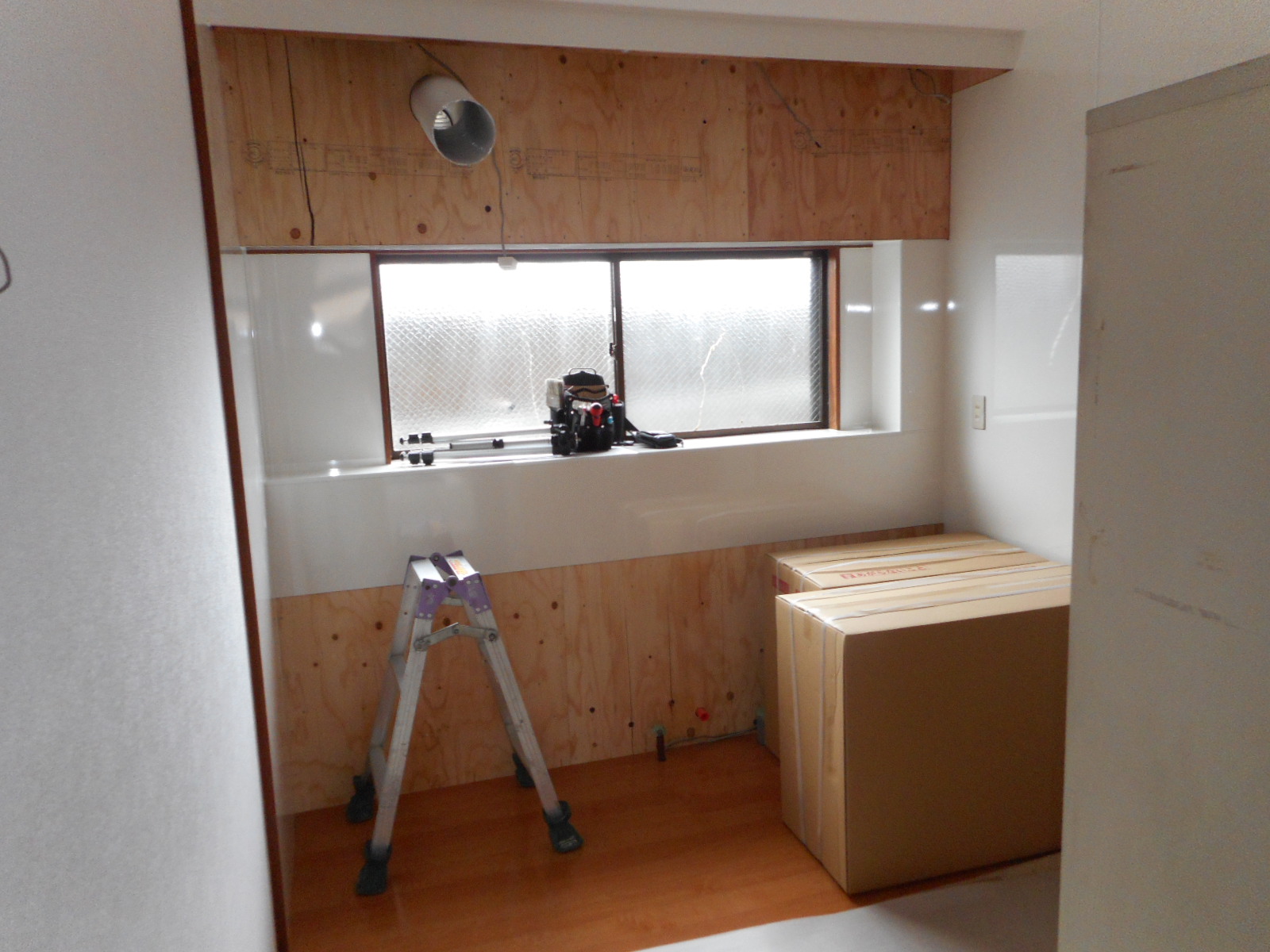 | 壁廻りに、クロス下地のベニアを施工して行きます!! | 順次、ベニヤを施工します!! |