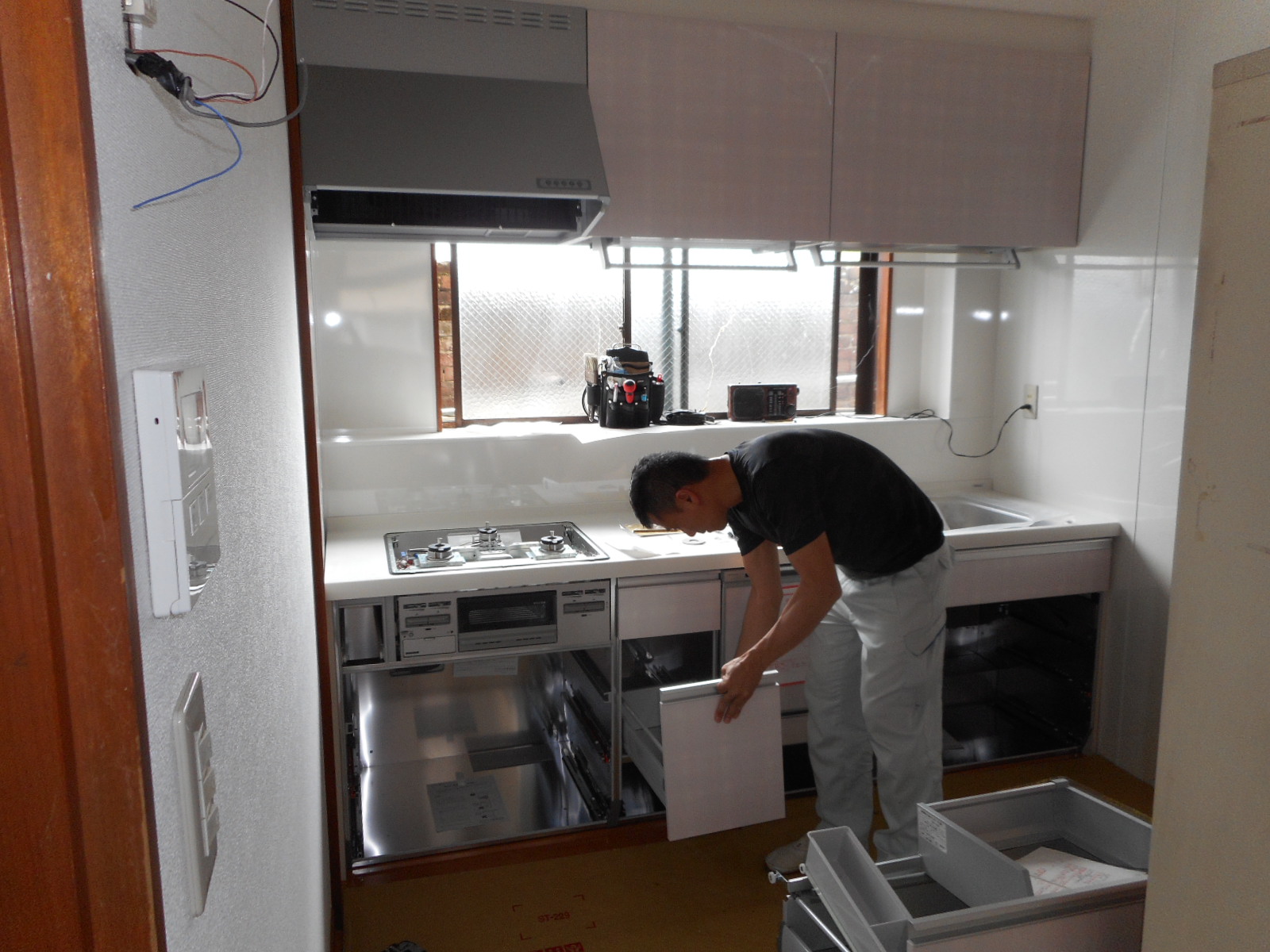 | 新規のシステムキッチンを組む準備をします!! | システムキッチンを順次組立てて行きます!! |