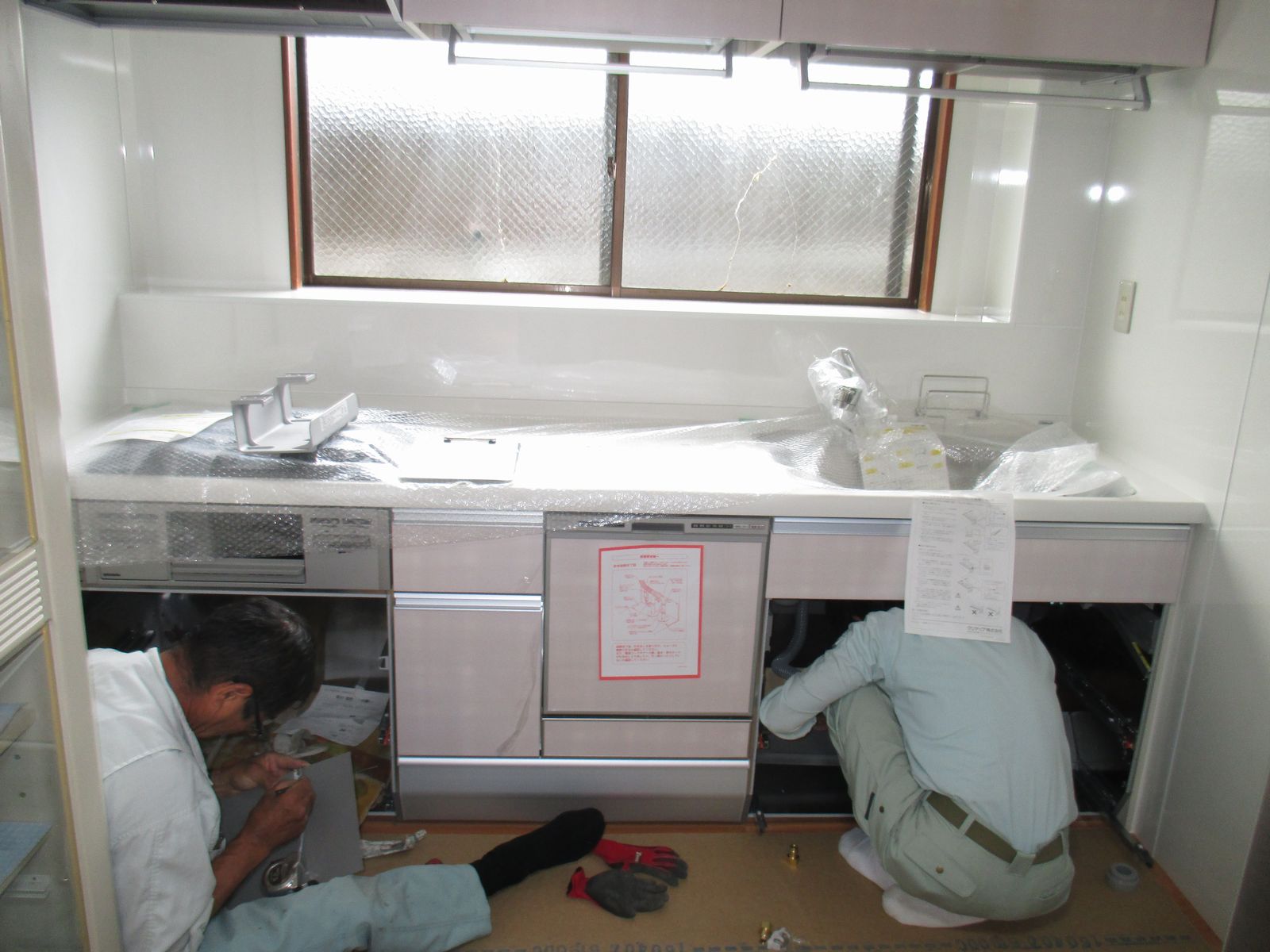 | キッチンの組付けが終わった翌日、ガス屋さんが入りガスの接続工事をします!! | 同時に設備屋さんも入り、給排水管の接続工事をします!! |