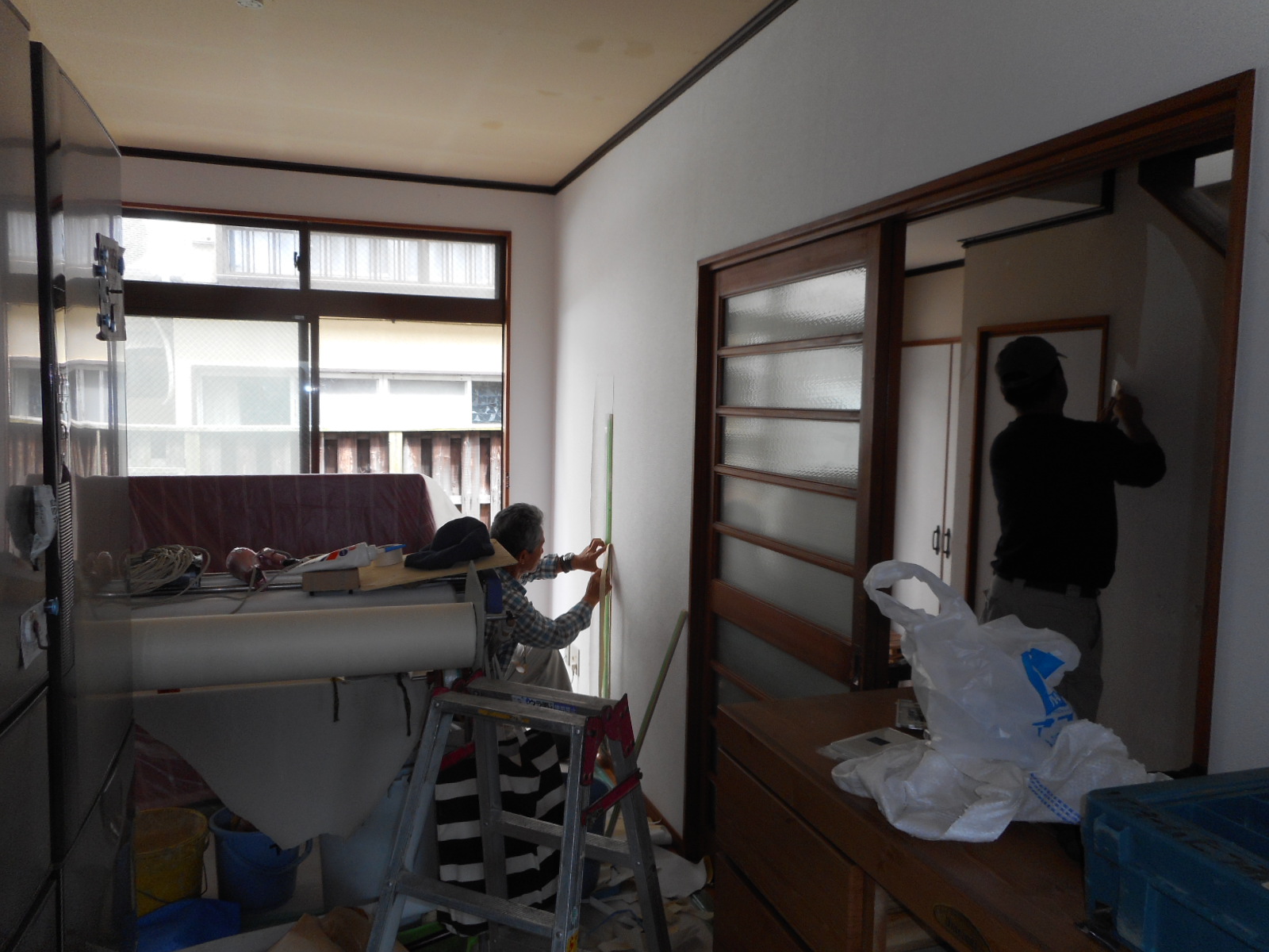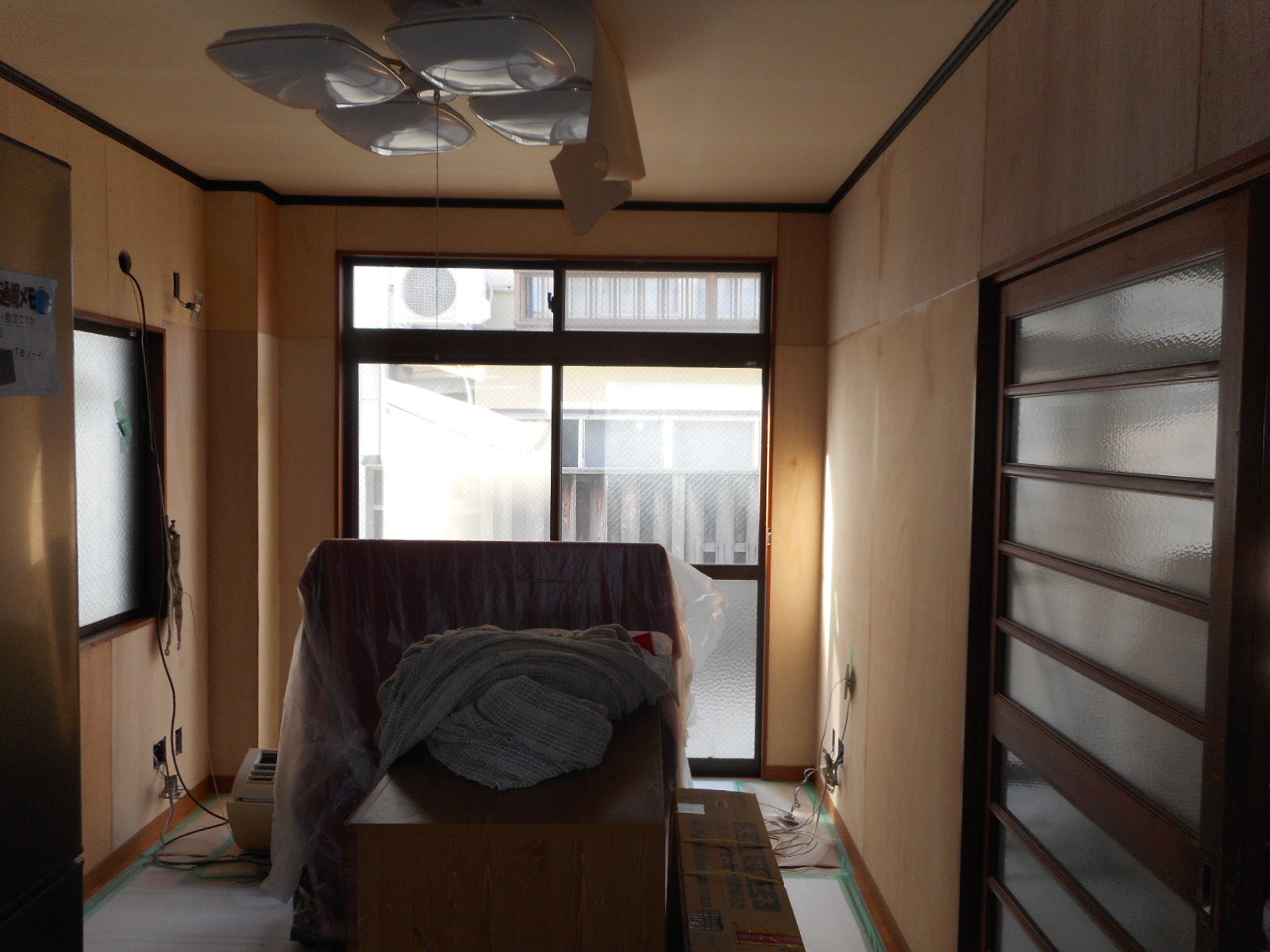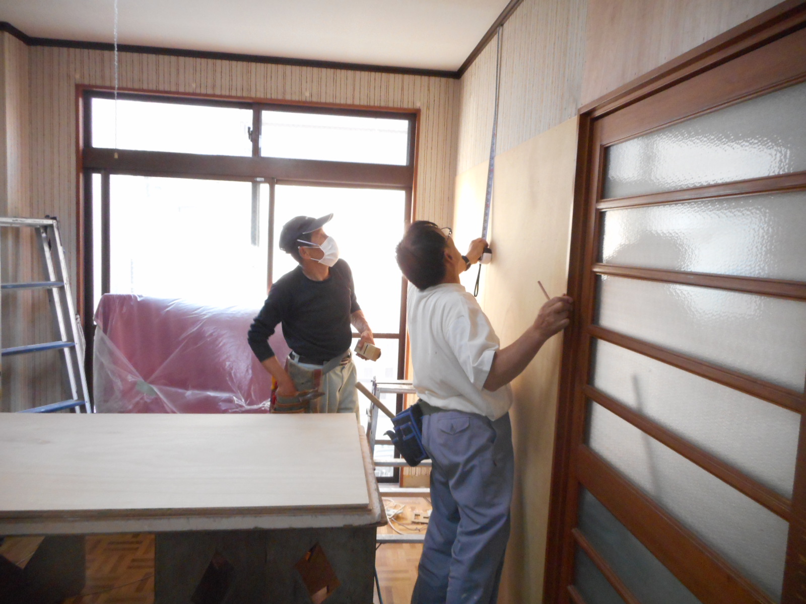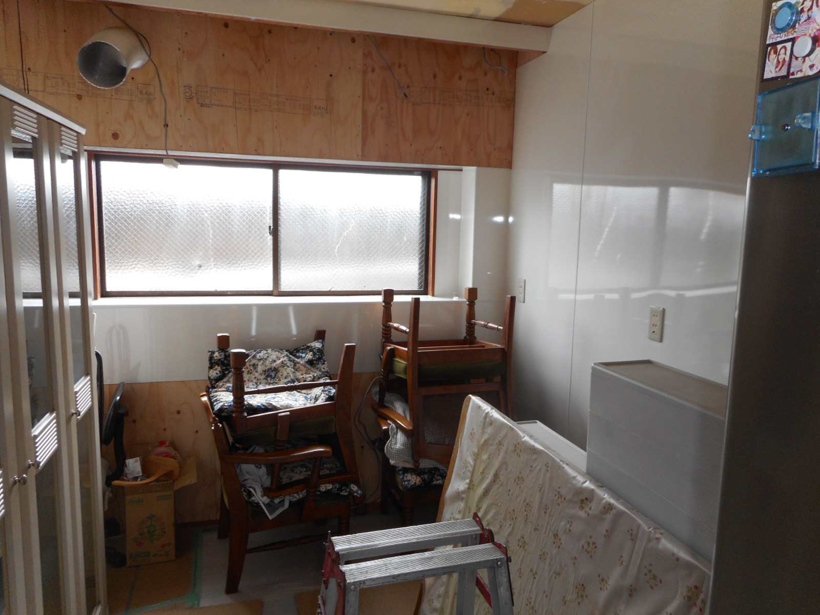 *今回はフロアの施工、クロスの下地づくりからクロス張り、最後に新規のシステムキッチンの組立てから