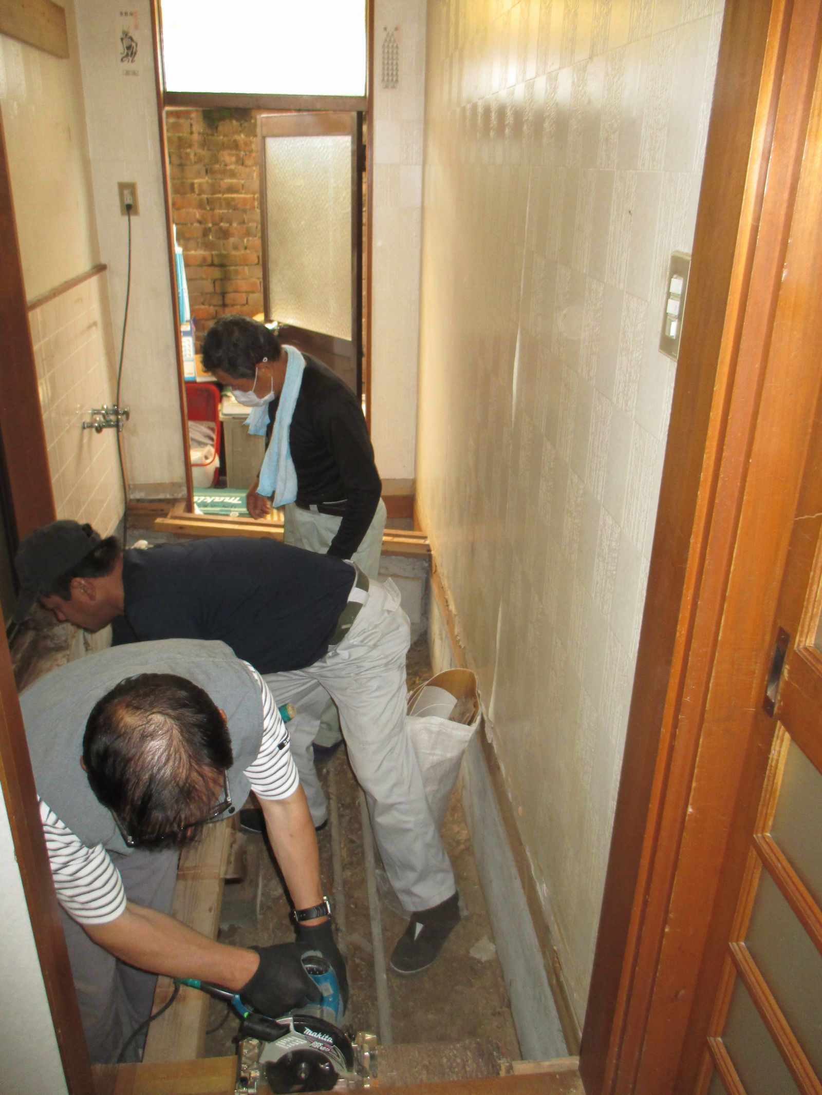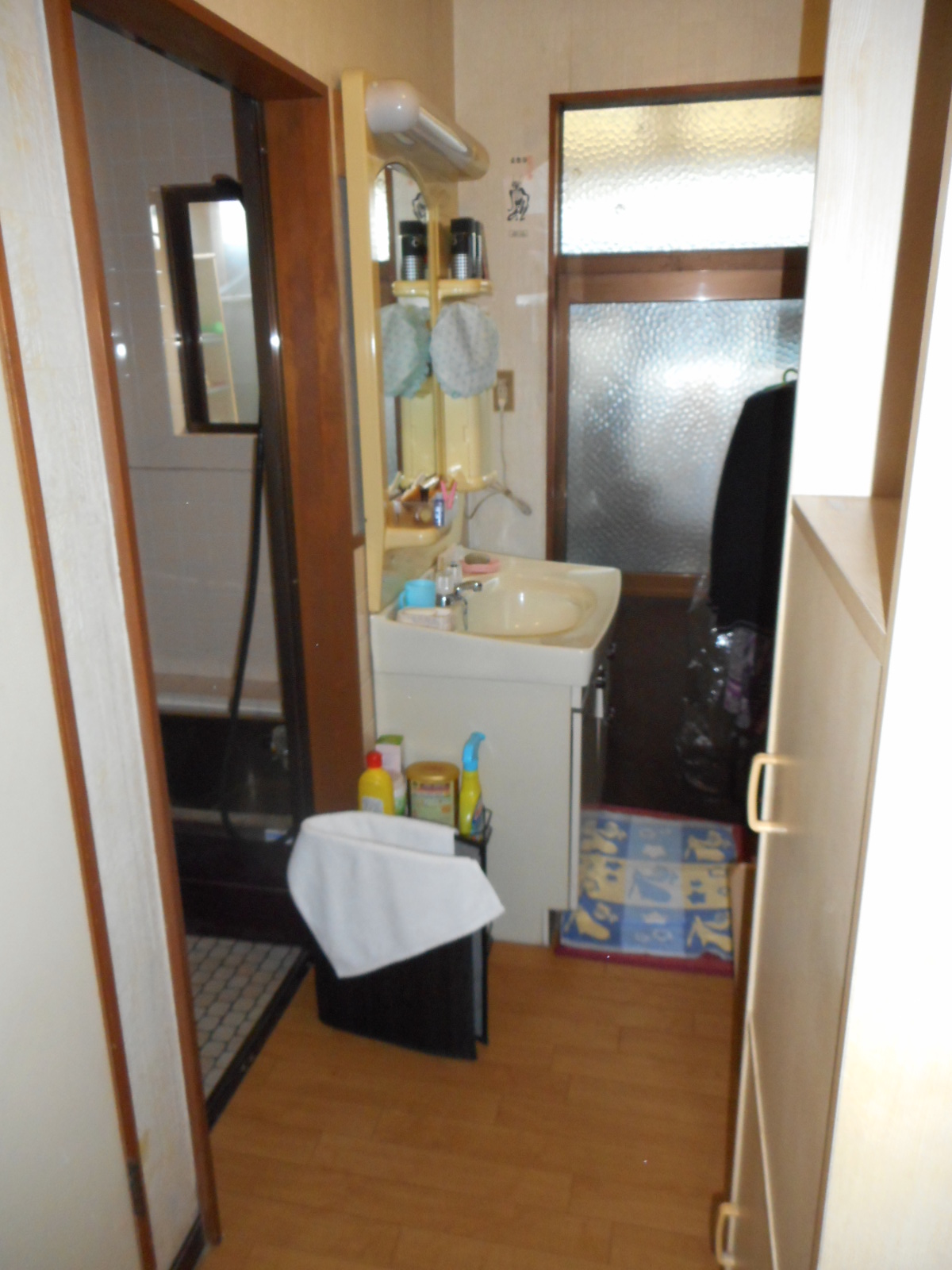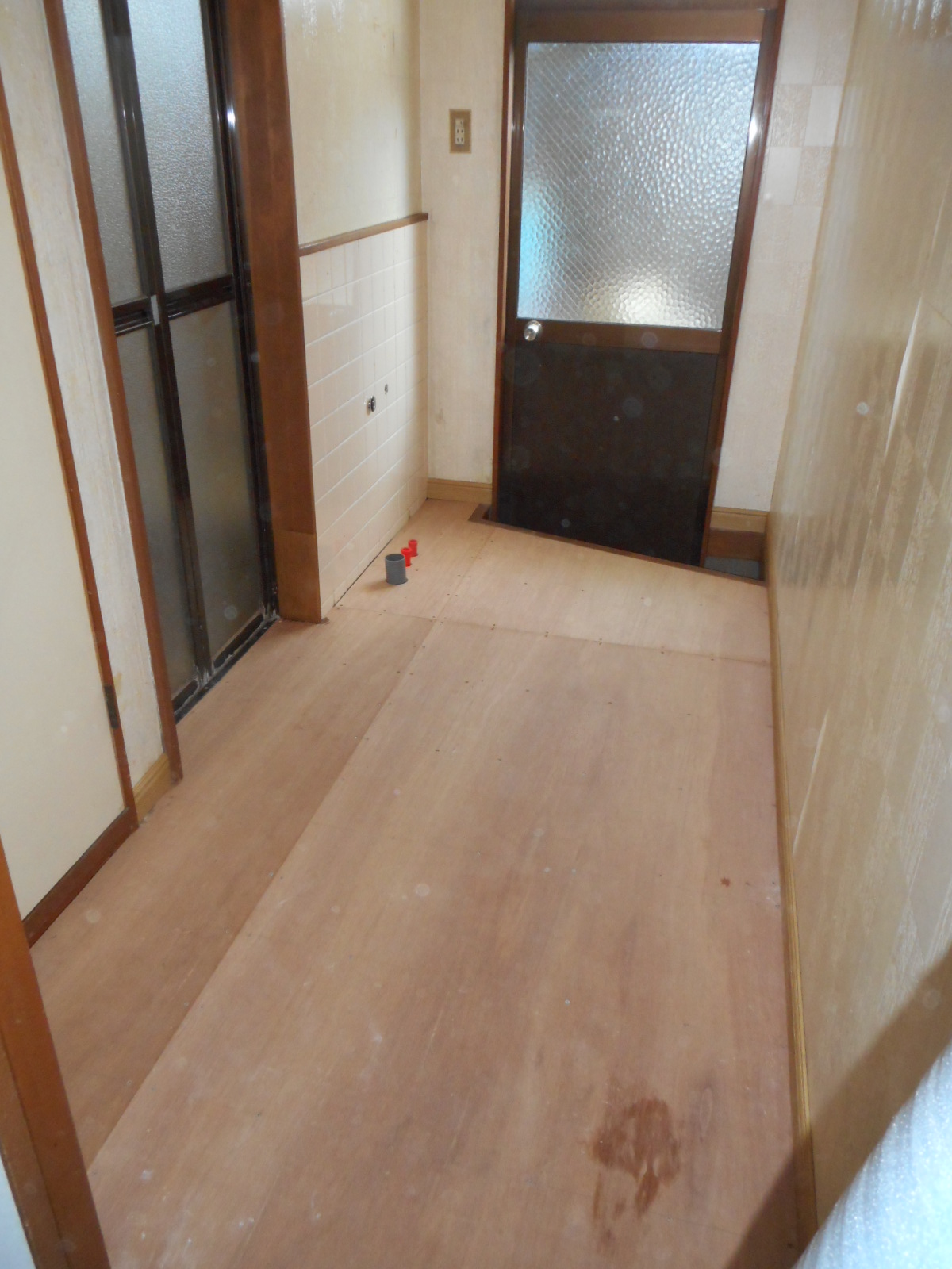 見た目では分かりませんが、浴室の入り口枠の下部がシロアリ被害により状態が悪く、洗面所の床も同様に状態が悪いため、床を全面解体後改修し、枠の下部も補修し、古くなった洗面化粧台を新しくします。