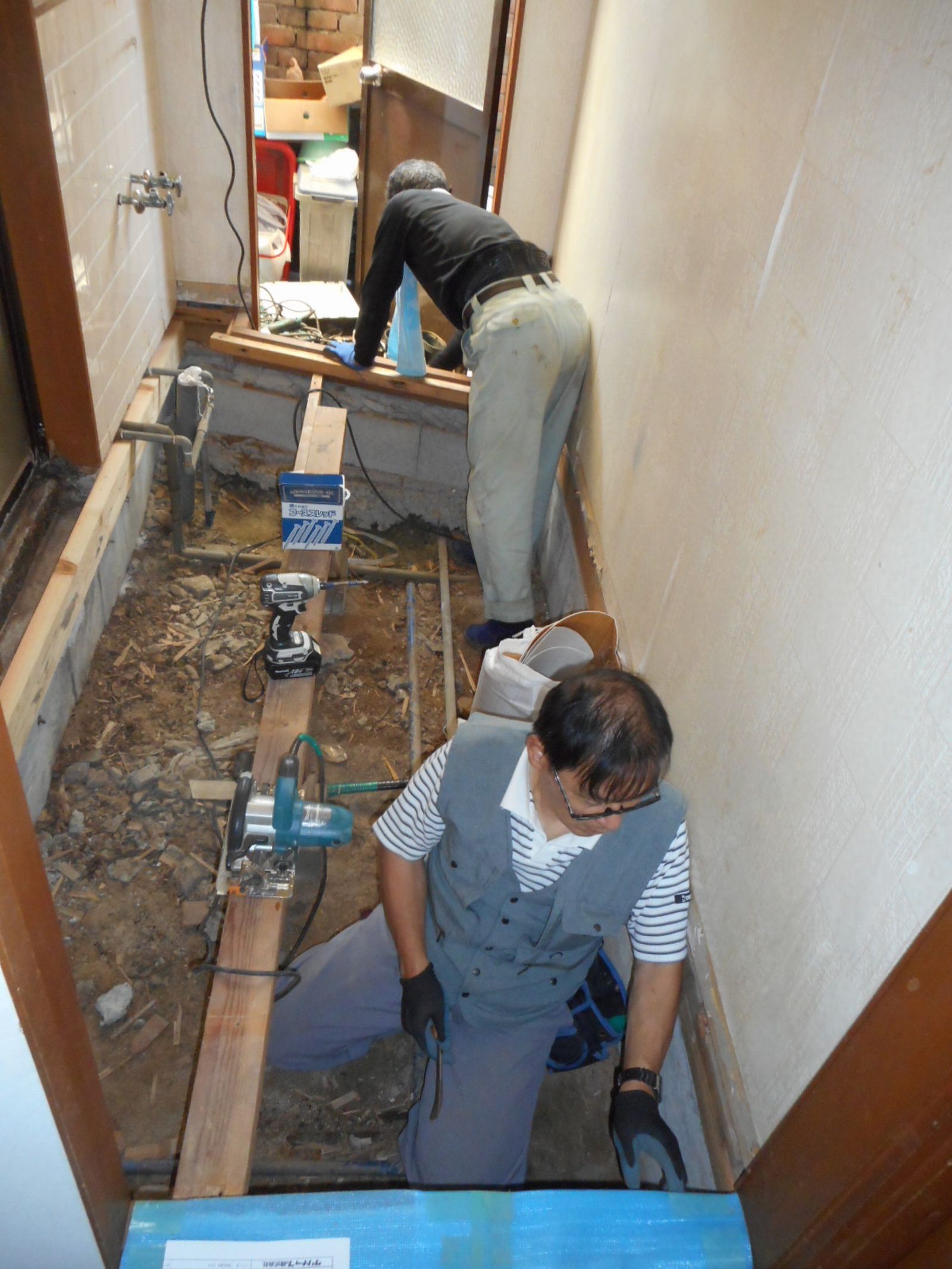 | 化粧台を撤去後、床を全面解体しました!! | 新規の根太を施工して行きます!! |