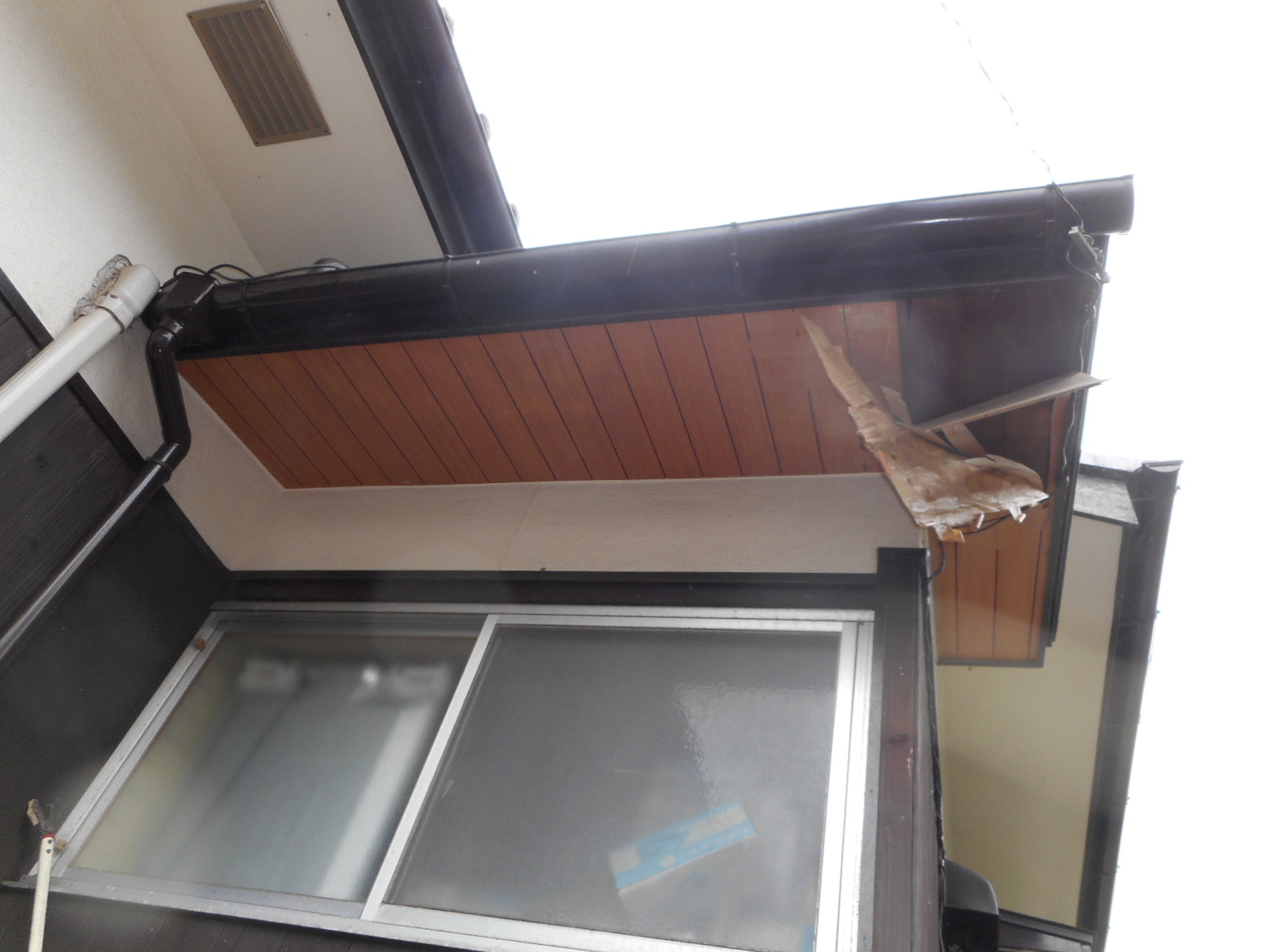 | 工事前 (軒天が剥がれて崩落しそうな状態です)!! → |