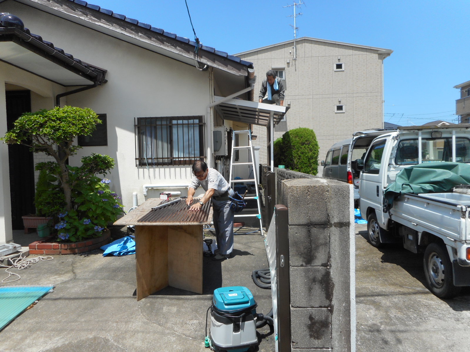 | 既存波板を解体、撤去し、新規波板を張って行きます!! | 順次波板を張って行きます!! |