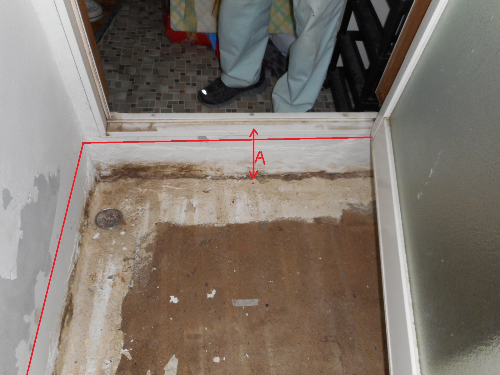 上の右の写真の様に、入り口の立ち上がり部分の(A寸法)が18cmあるので、土間を10cm(赤線まで)上げてモルタル補修をし、洗い場部分はタイルを張り、壁廻りは腰下のモルタル部分を、防水塗装をすることにしました。
