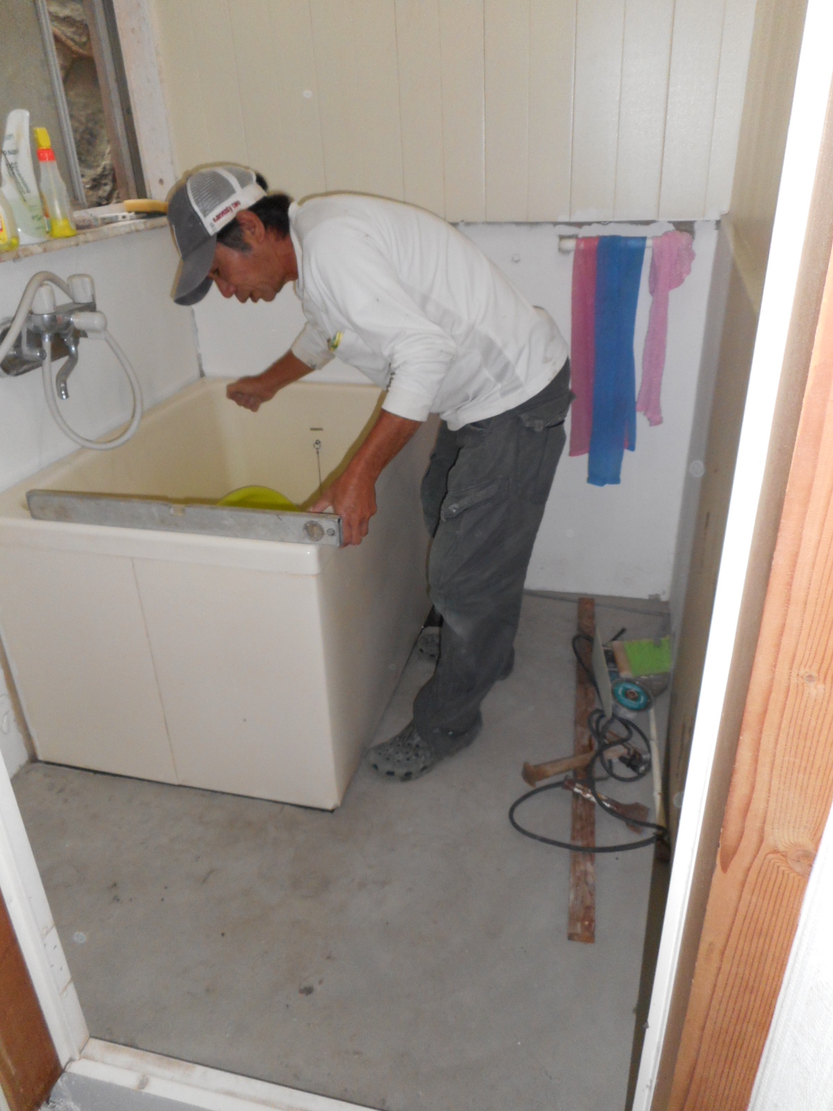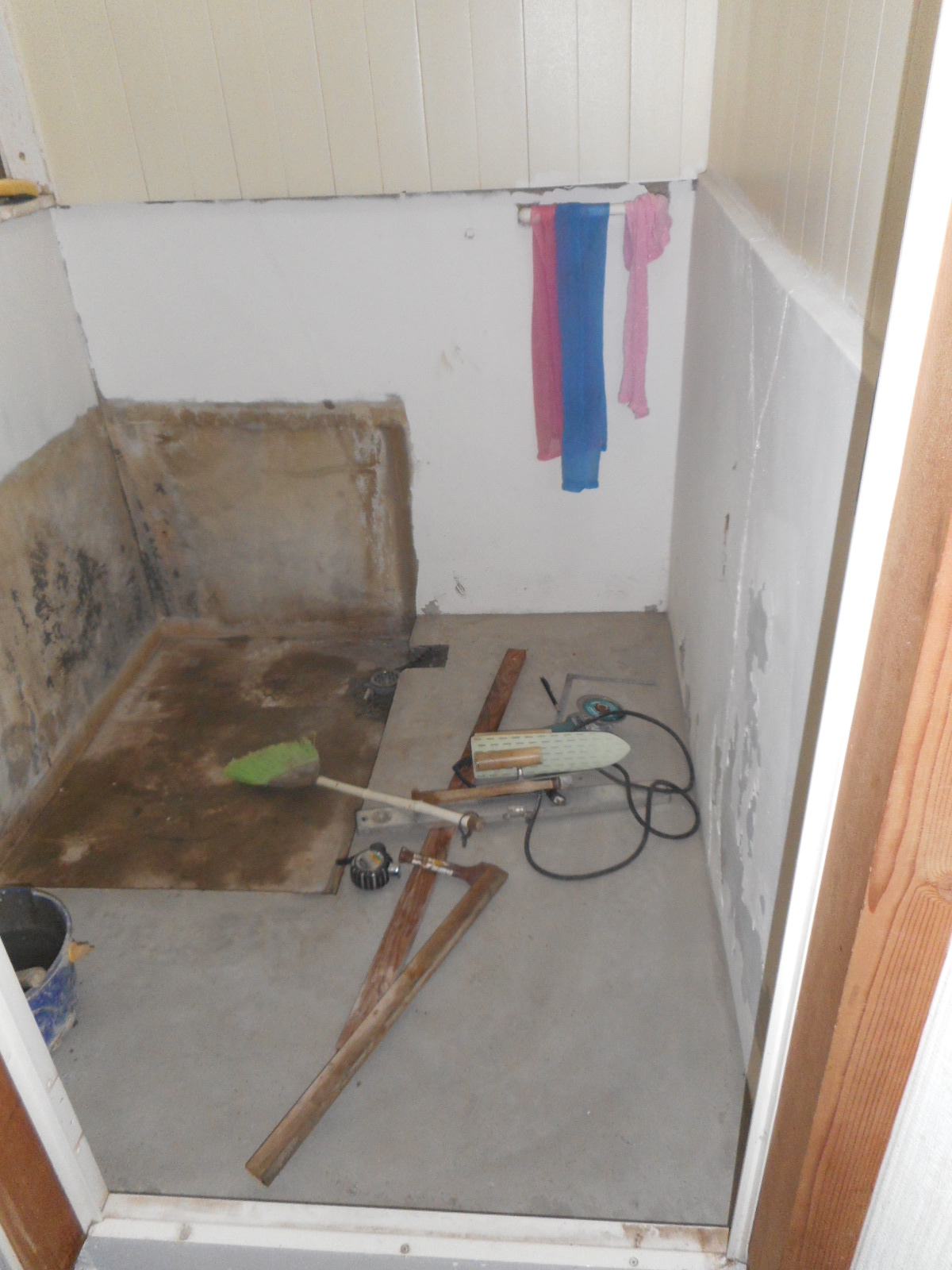 入り口のドアと浴槽を一時撤去し、浴槽据付け部分と洗い場との境界に型枠を組みます!! 洗い場部分にモルタルを施工し、型枠を撤去しました!!