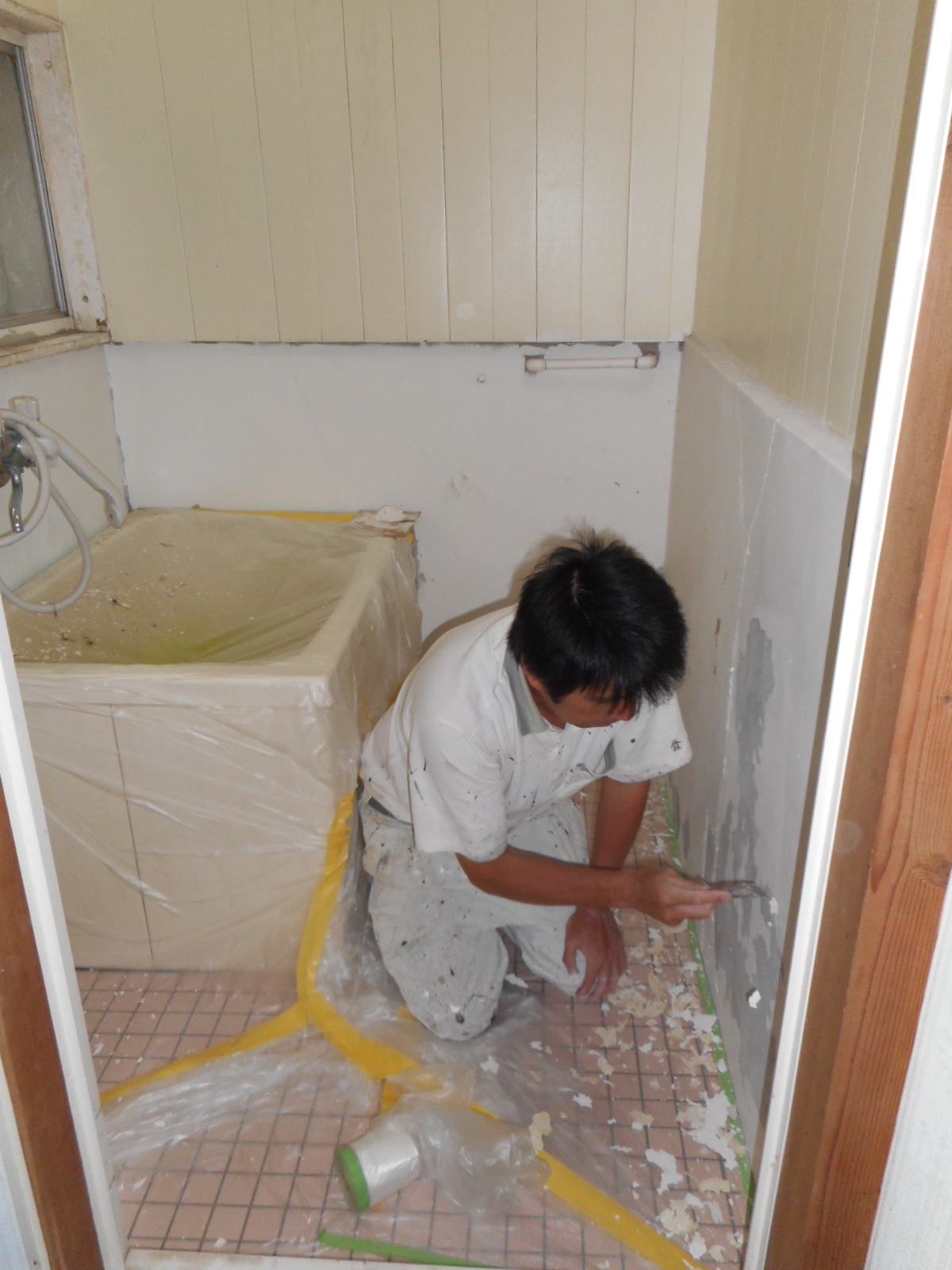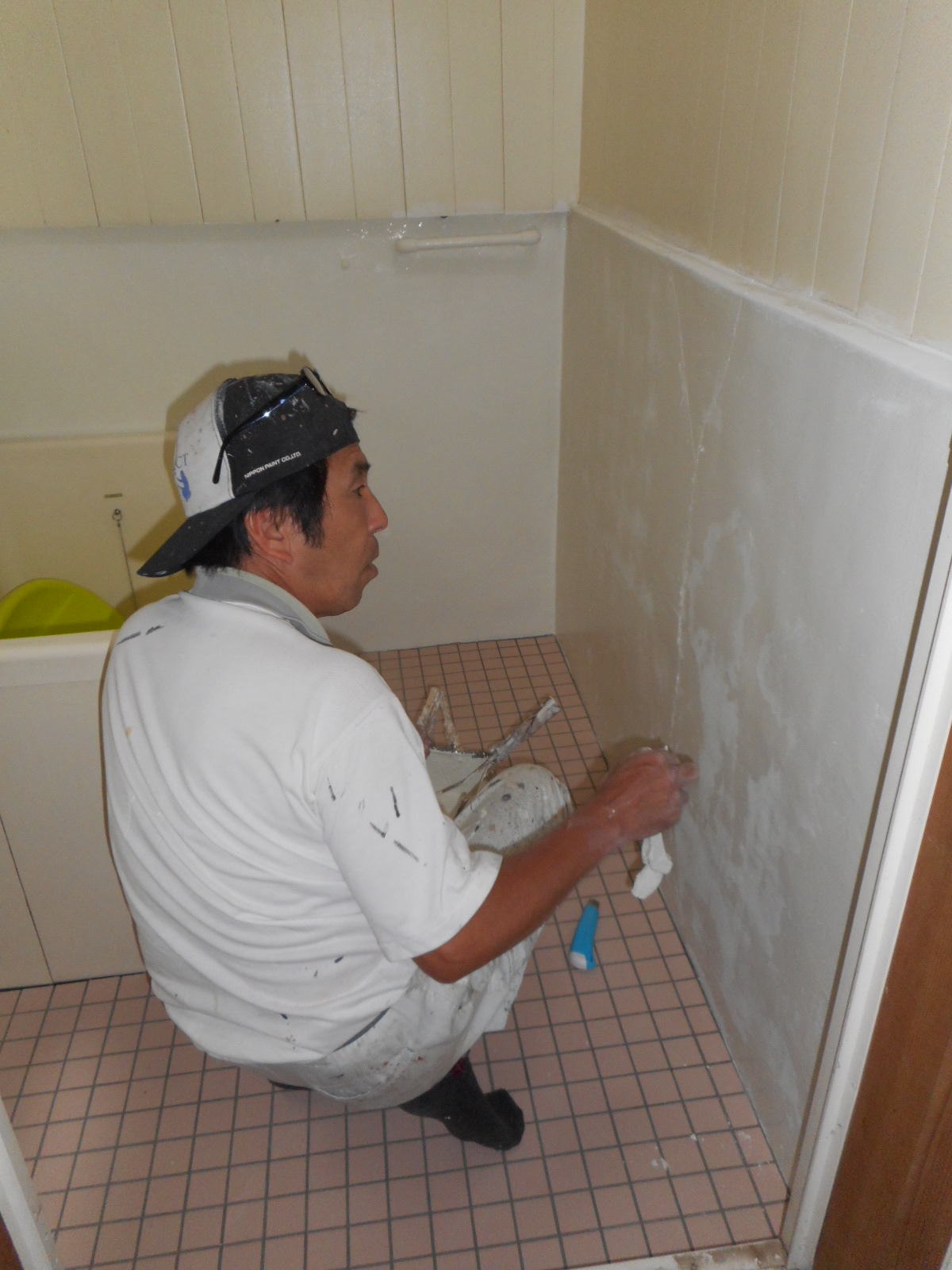 洗い場のタイル張りが終わった翌日、腰下のモルタル部分を防水塗装します(浮いた部分をしっかりとケレンしています)!!   塗装をします!!