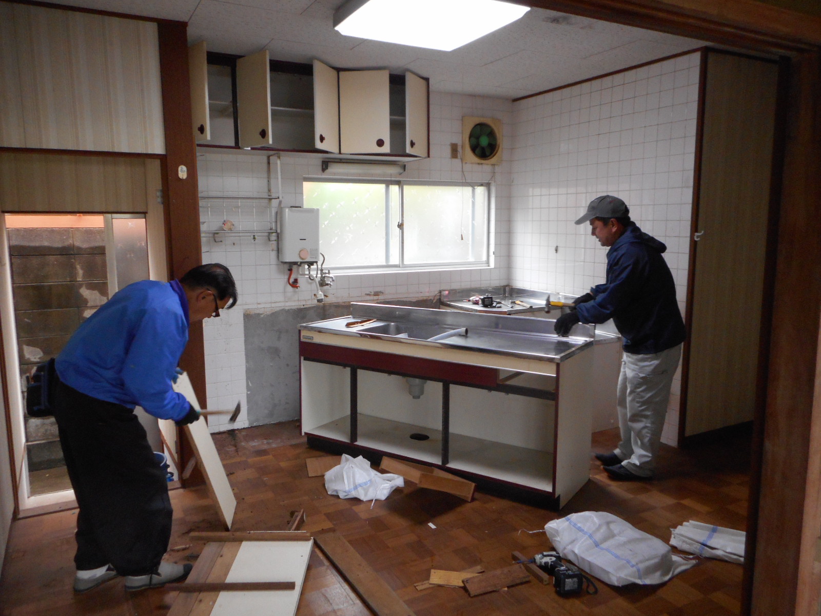 | キッチン廻りの解体!! | 解体完了(吊戸棚は残します)!! |