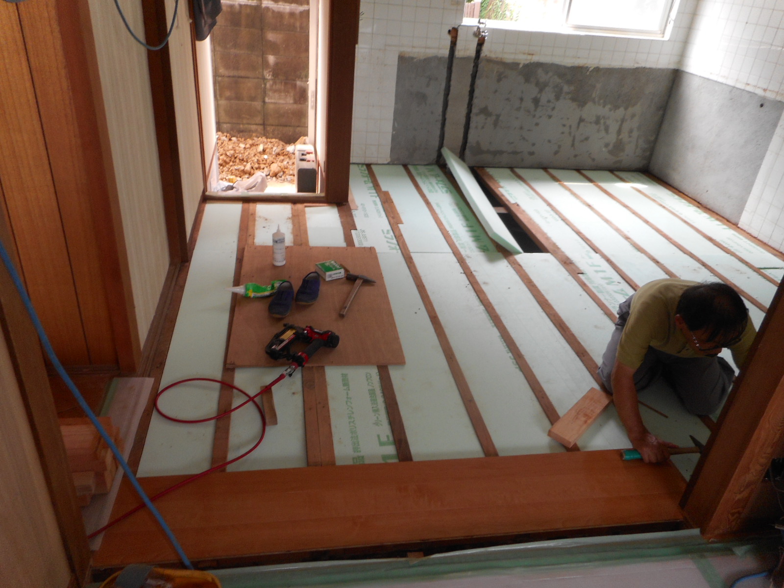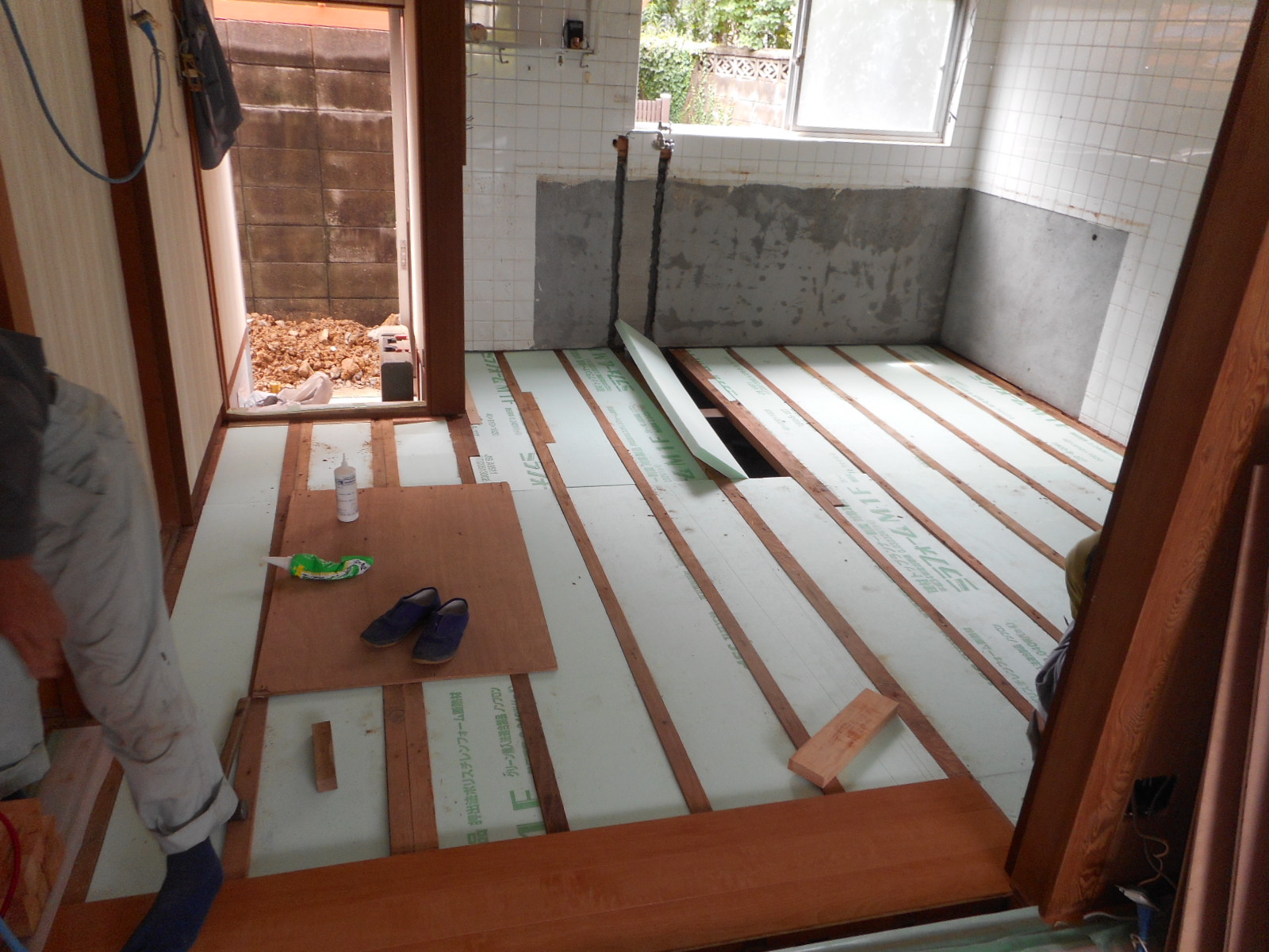 | 床板を解体、撤去しました!! | 根太を補強後、間に断熱材を入れました!! |
