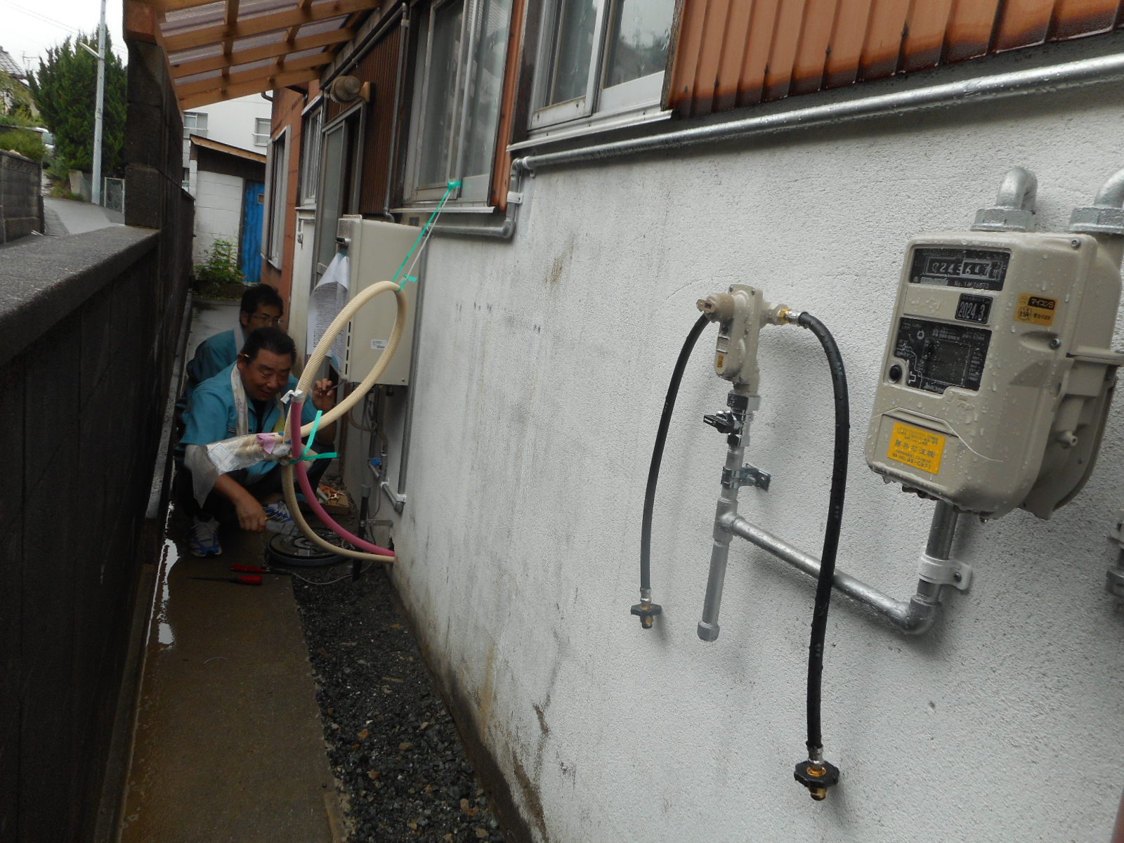 | 新規キッチンを据付け、コーキングを打ちます!! | 外では、新規のガス給湯器を取付けています!! |
