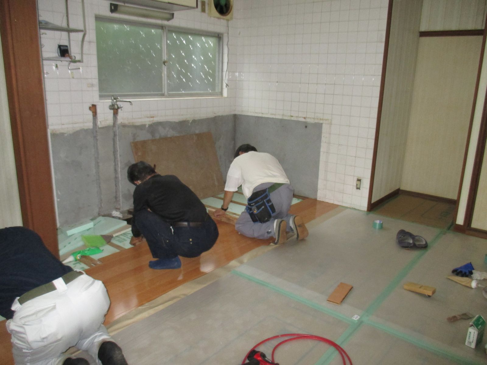 | 新規フロア材を施工して行きます!! | 順次、フロア材を施工します!! |