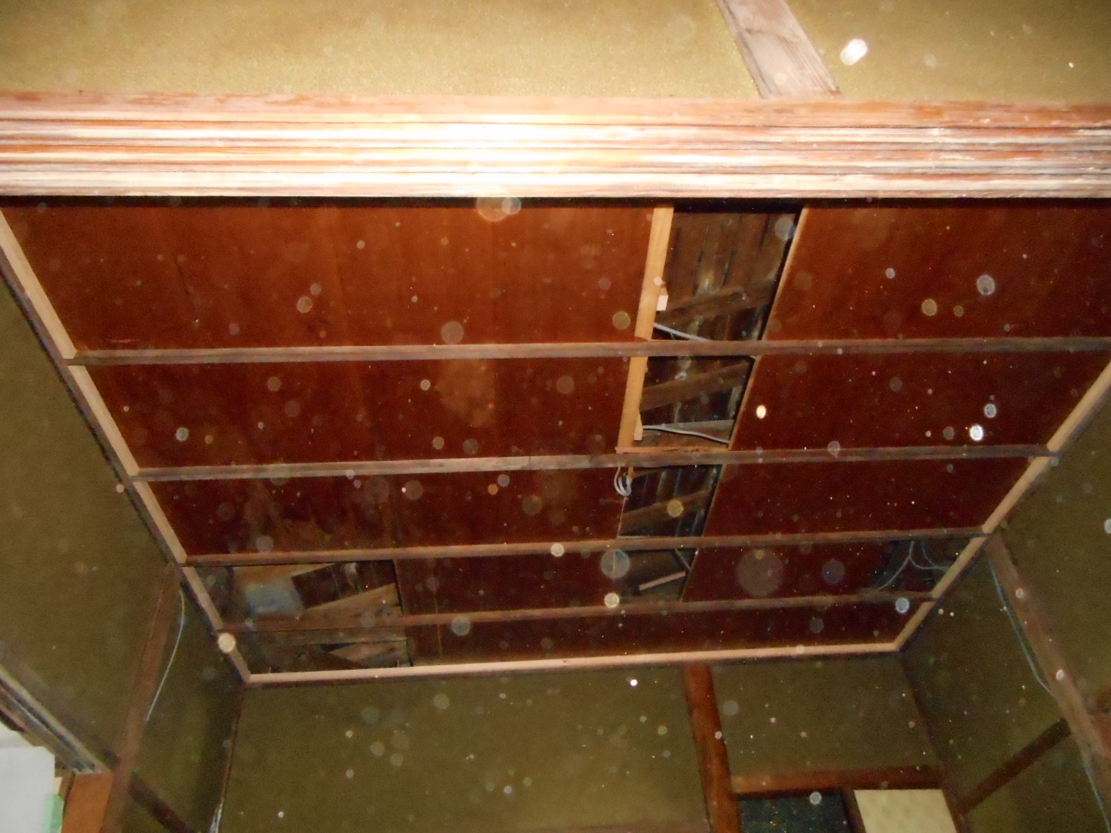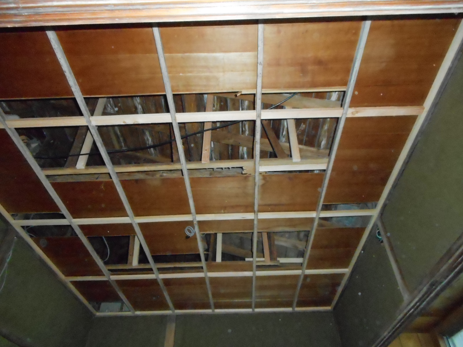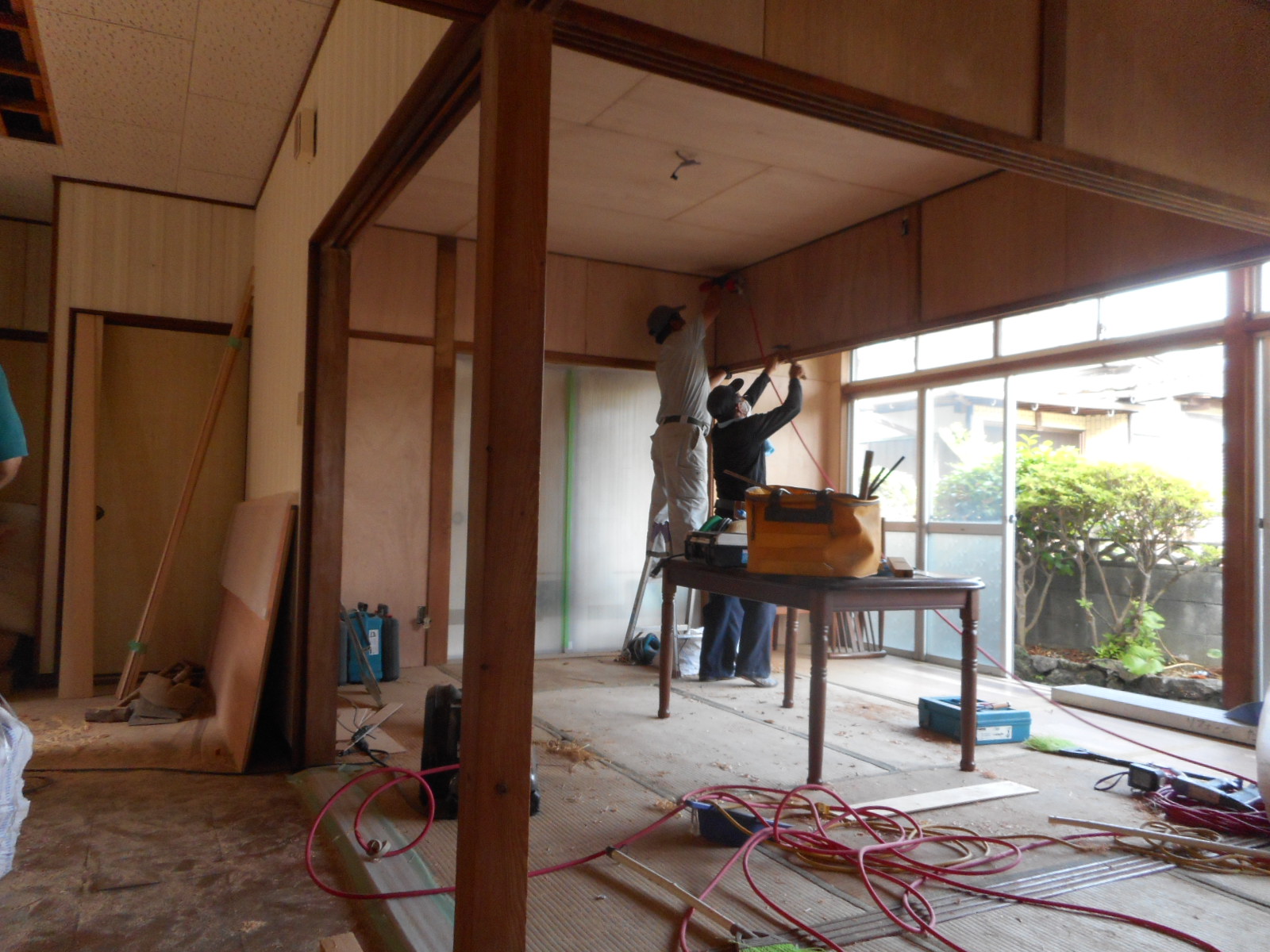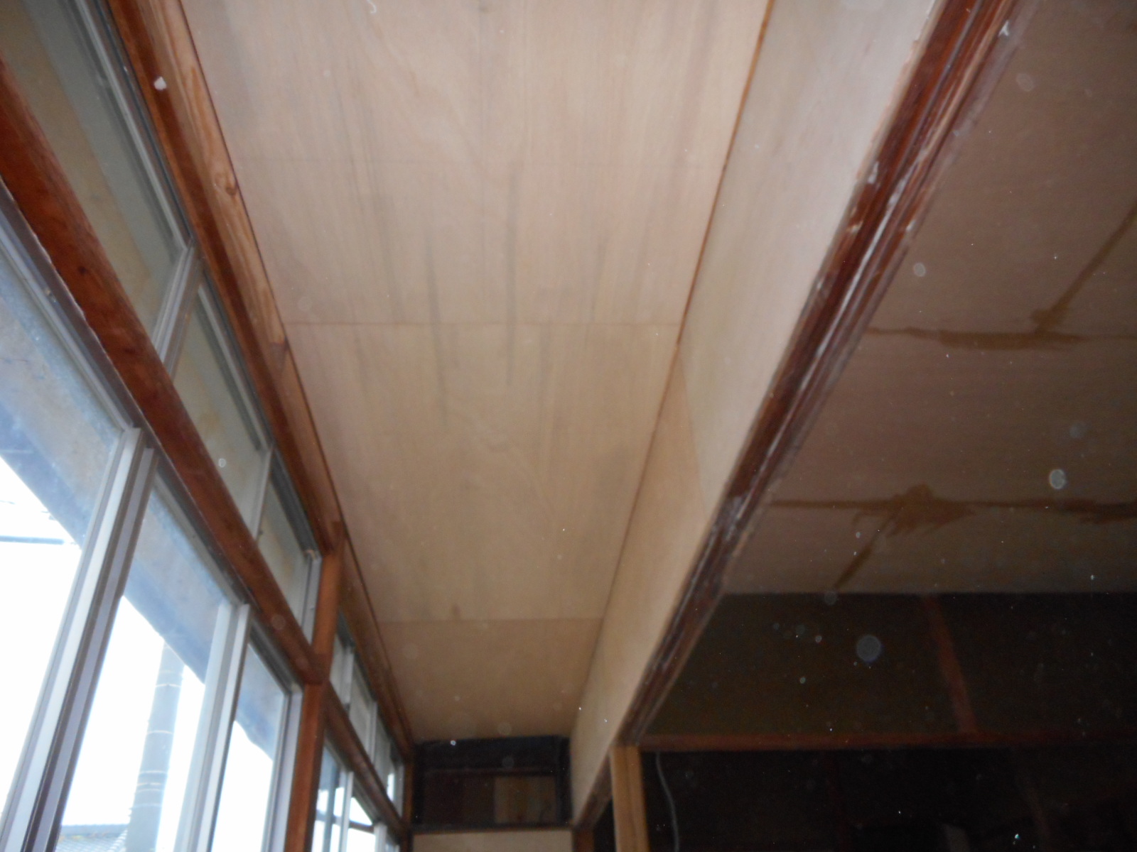 | 広縁の天井は全面解体し、下地の骨組みをしました!! | クロス下地の、ベニヤの施工が完了です!! |