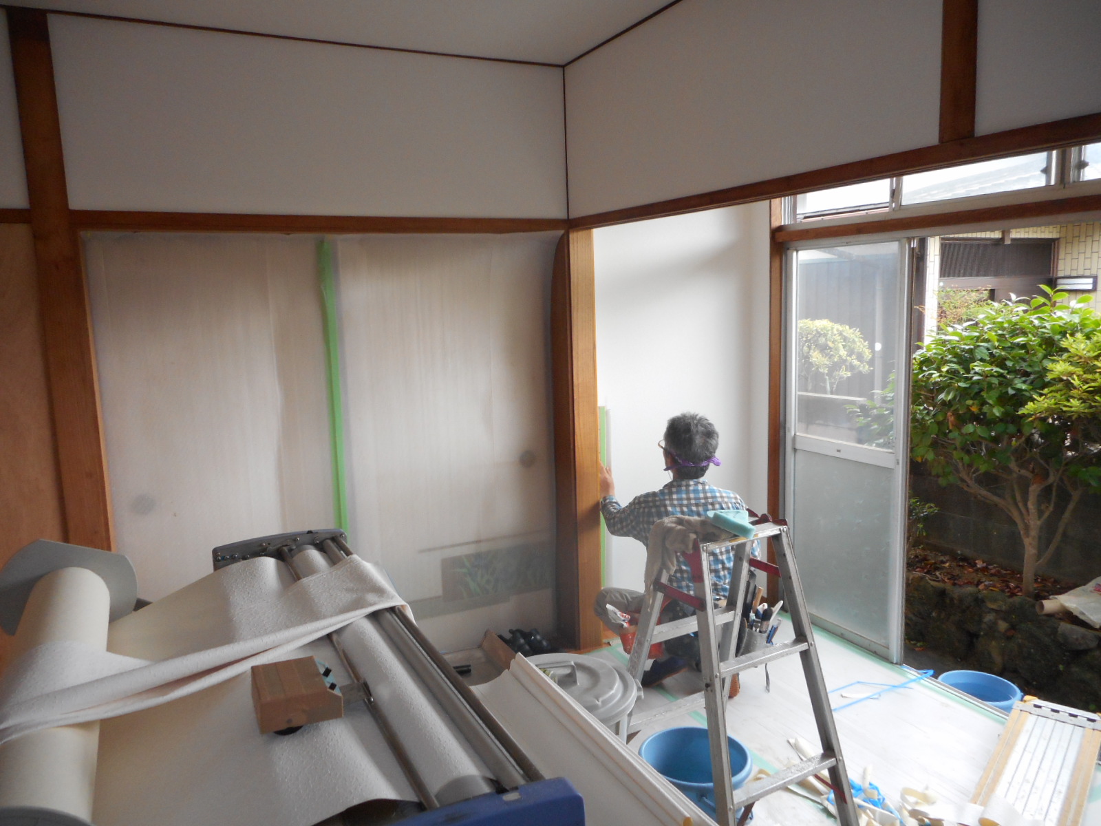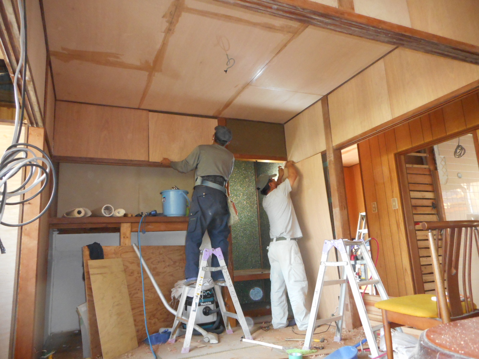 | 6畳間の壁廻りに、クロス下地のベニヤを施工して行きます!! | 4畳半の部屋も壁廻りに、クロス下地のベニヤを施工します!! |