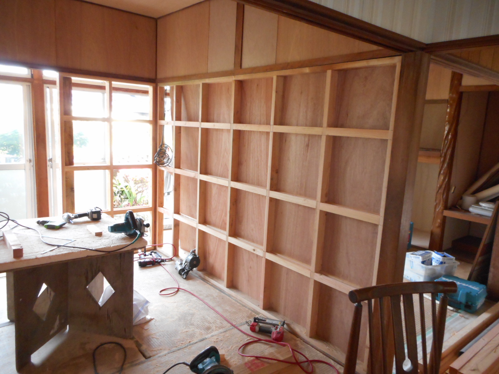 | 間仕切り壁の骨組みをします!! | クロス下地のベニヤを、両側に施工します!! |