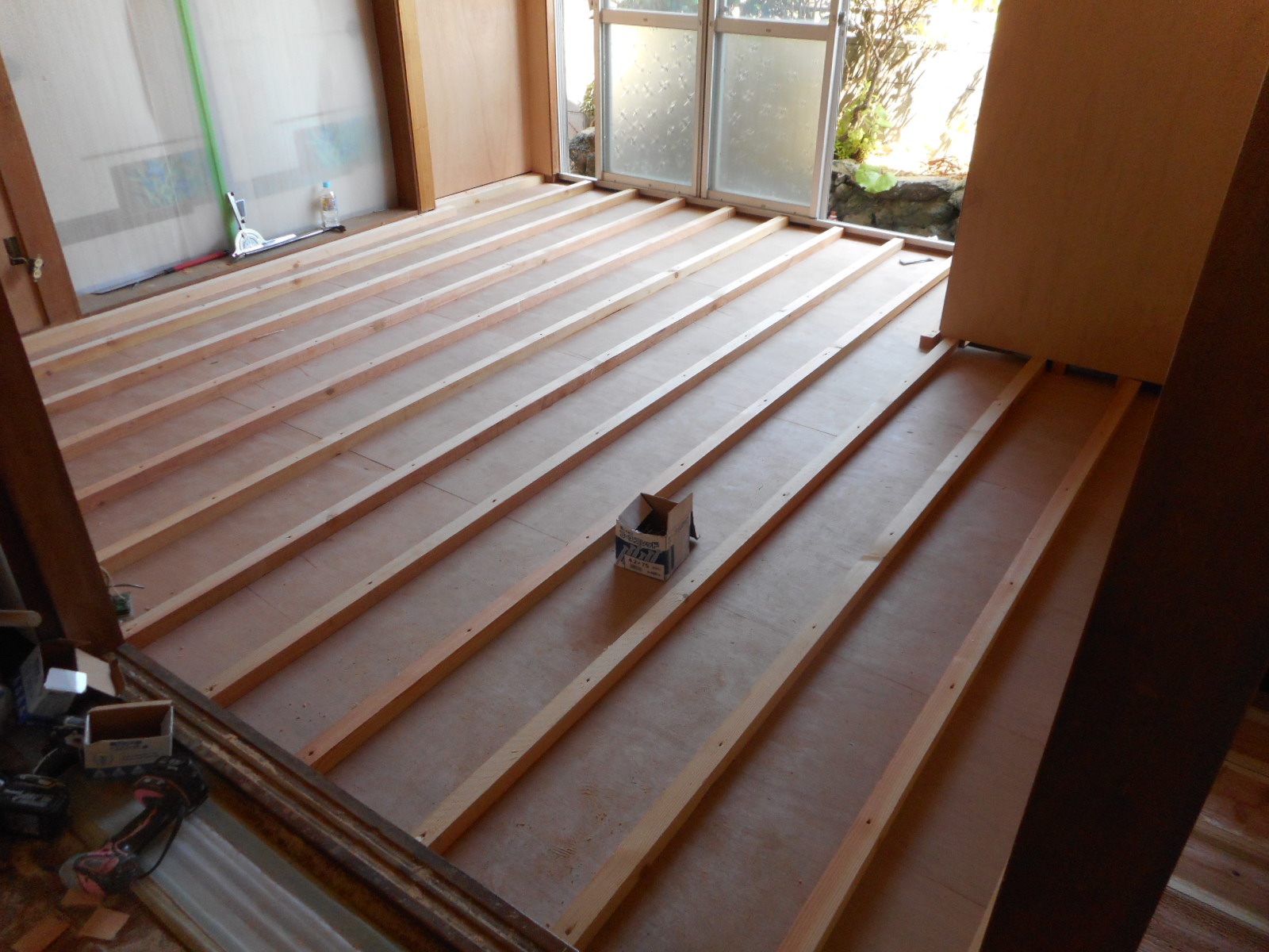 | 6畳間の床は畳を撤去後、新規を根太を施工します!! | 根太の上にコンパネを施工し、さらにタル木を施工しました!! |