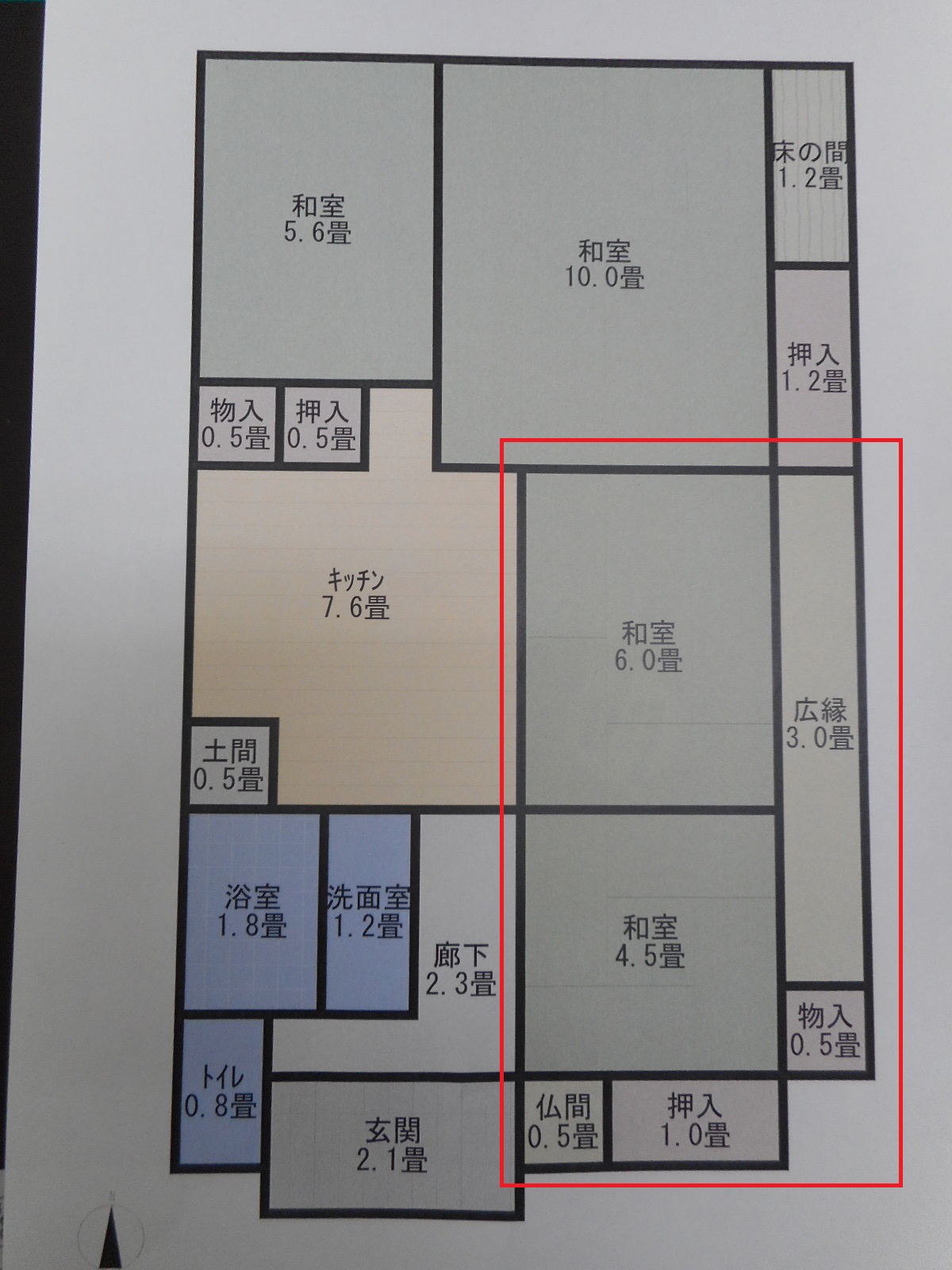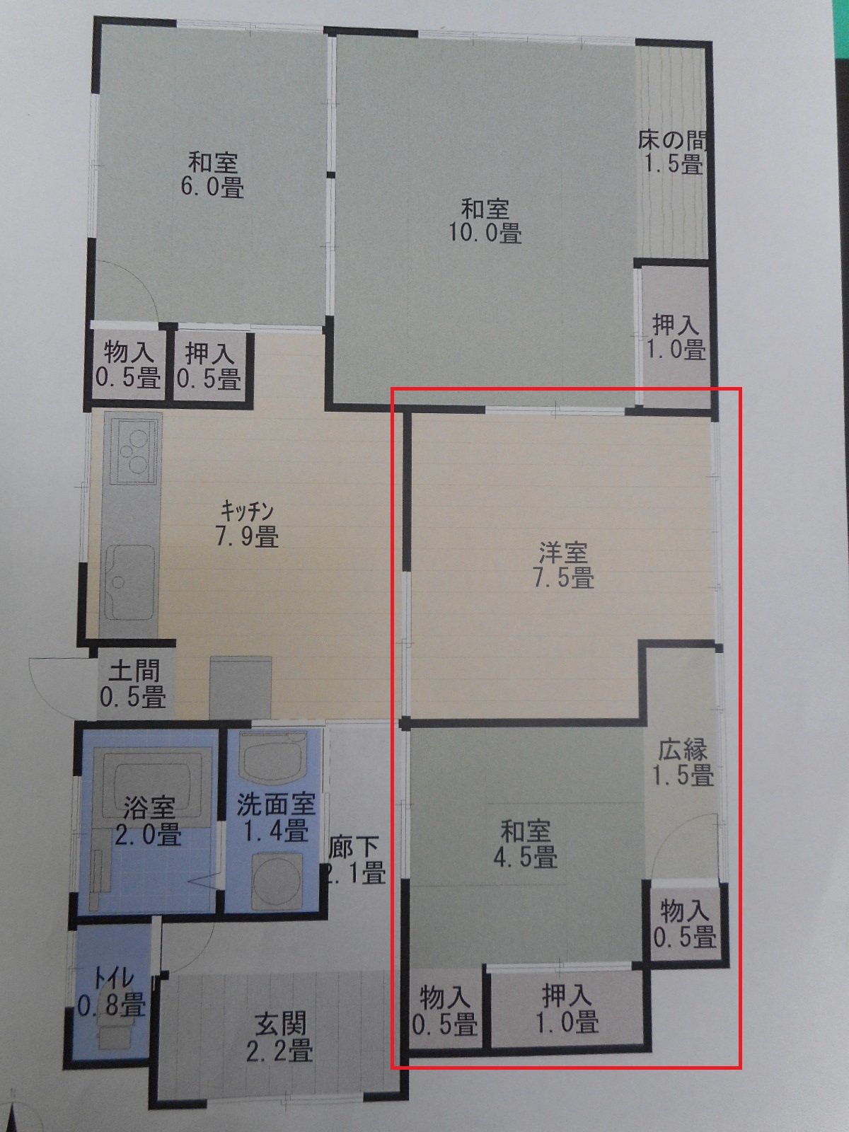 | 工事前の間取り図(赤線で囲った和室2間を右の間取り図の様に改修します)!! | 襖で間仕切りされている所を完全な間仕切り壁にし奥の6畳の間は、台所との続き間の洋間にし、4.5畳の部屋は畳を入替え全面内装をやり替えます!! |