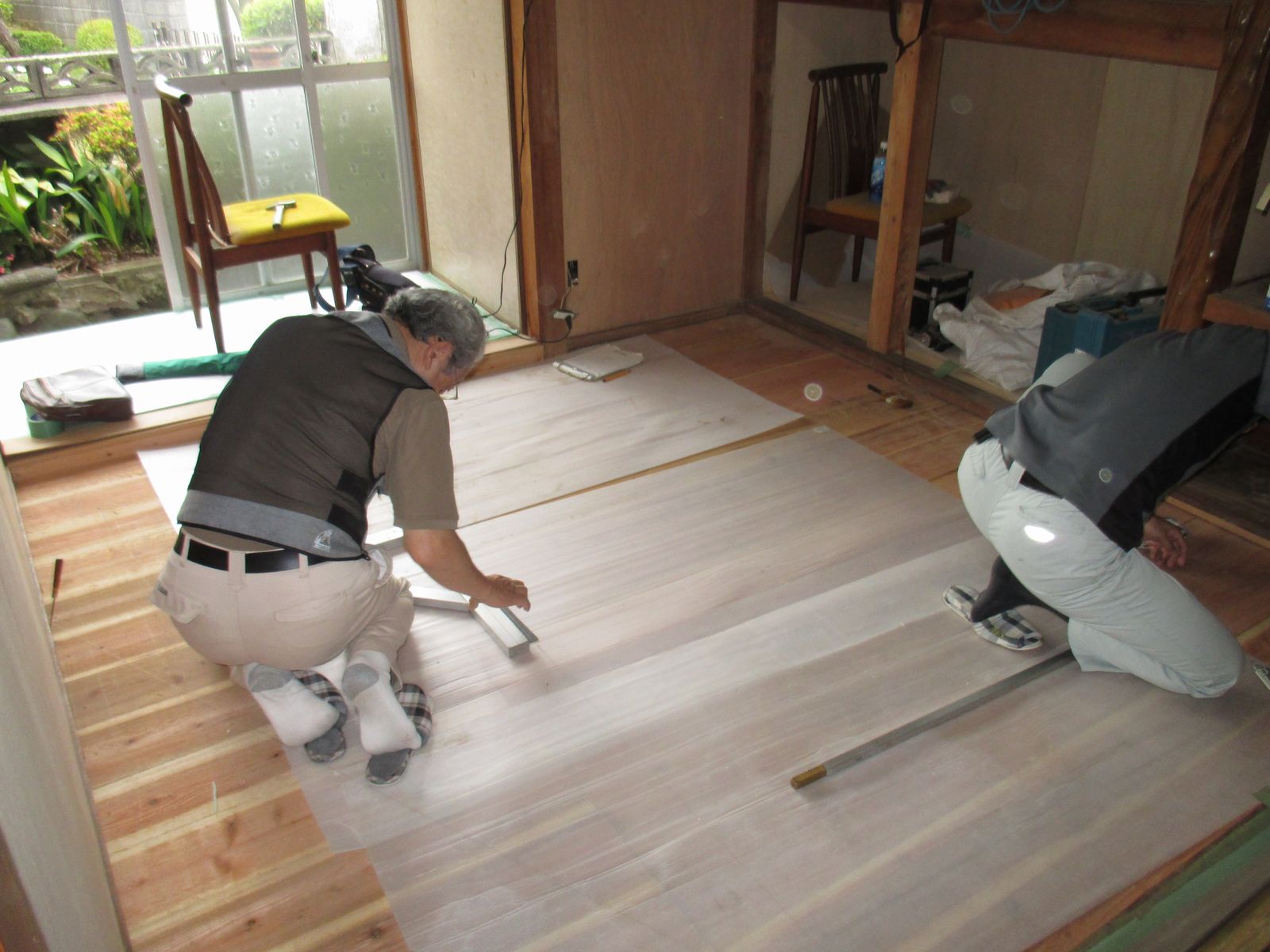 | 6畳間はタル木の間に断熱材を入れ、フロア材を施工し行きます!! | 4畳半の部屋は下地整備後、新規の畳の寸法取りをします!! |