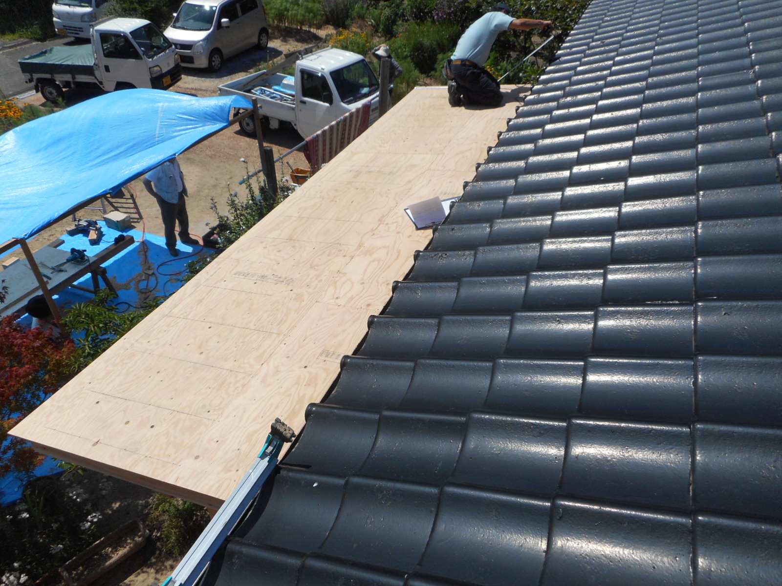| 屋根に、板金下地のコンパネを施工しました!! | コンパネの上にルーフィングを敷き、瓦棒を施工します!! |