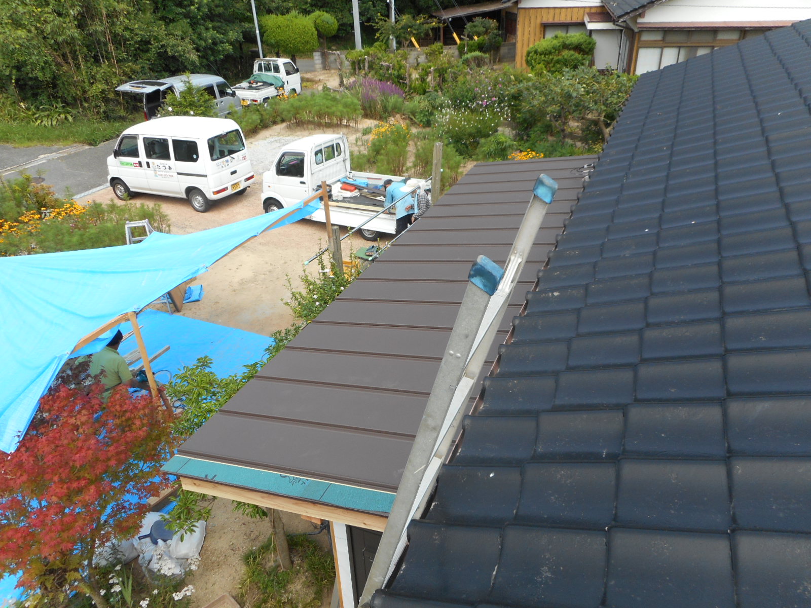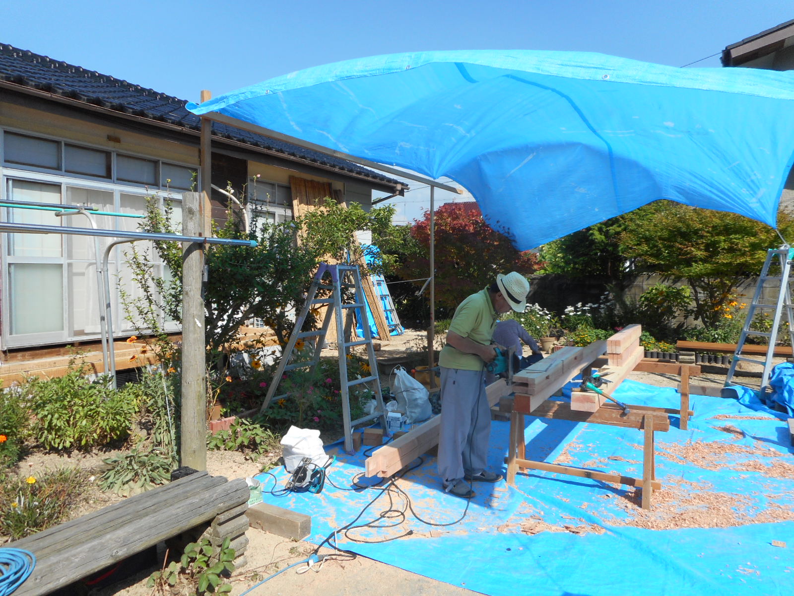 | 8月で熱かったので日除けのテントを張って、 現場で材料を加工します!! |