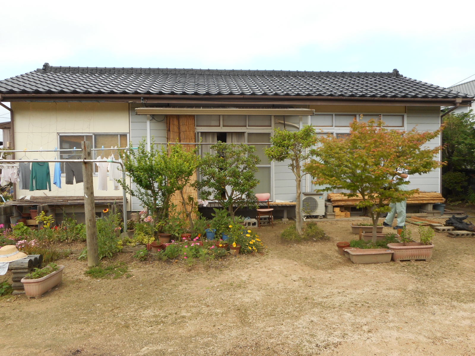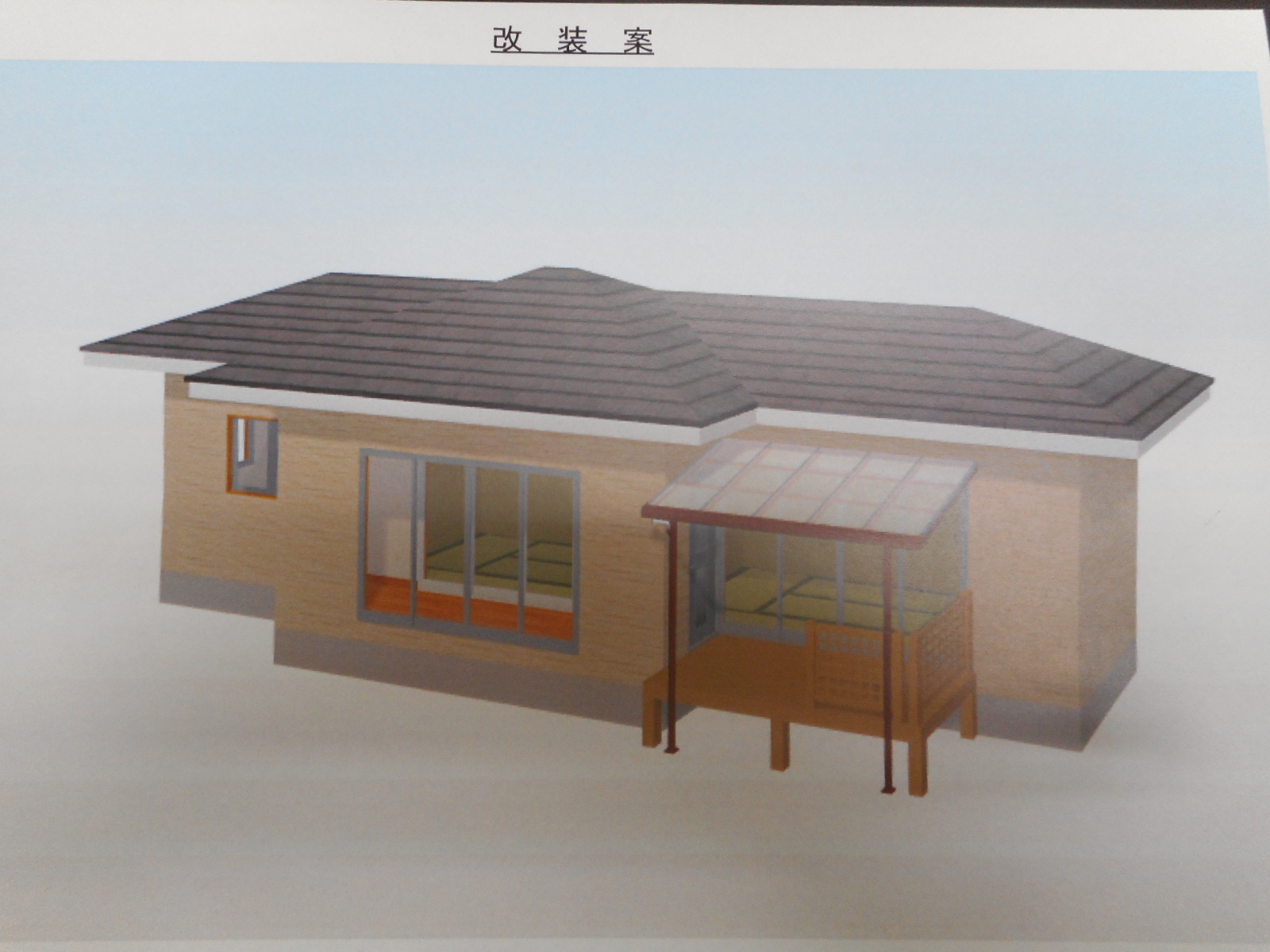 | 正面から見る(真ん中のテラスの部分に広縁を増築し、 右側にウッドデッキとテラスを新設します)!! |