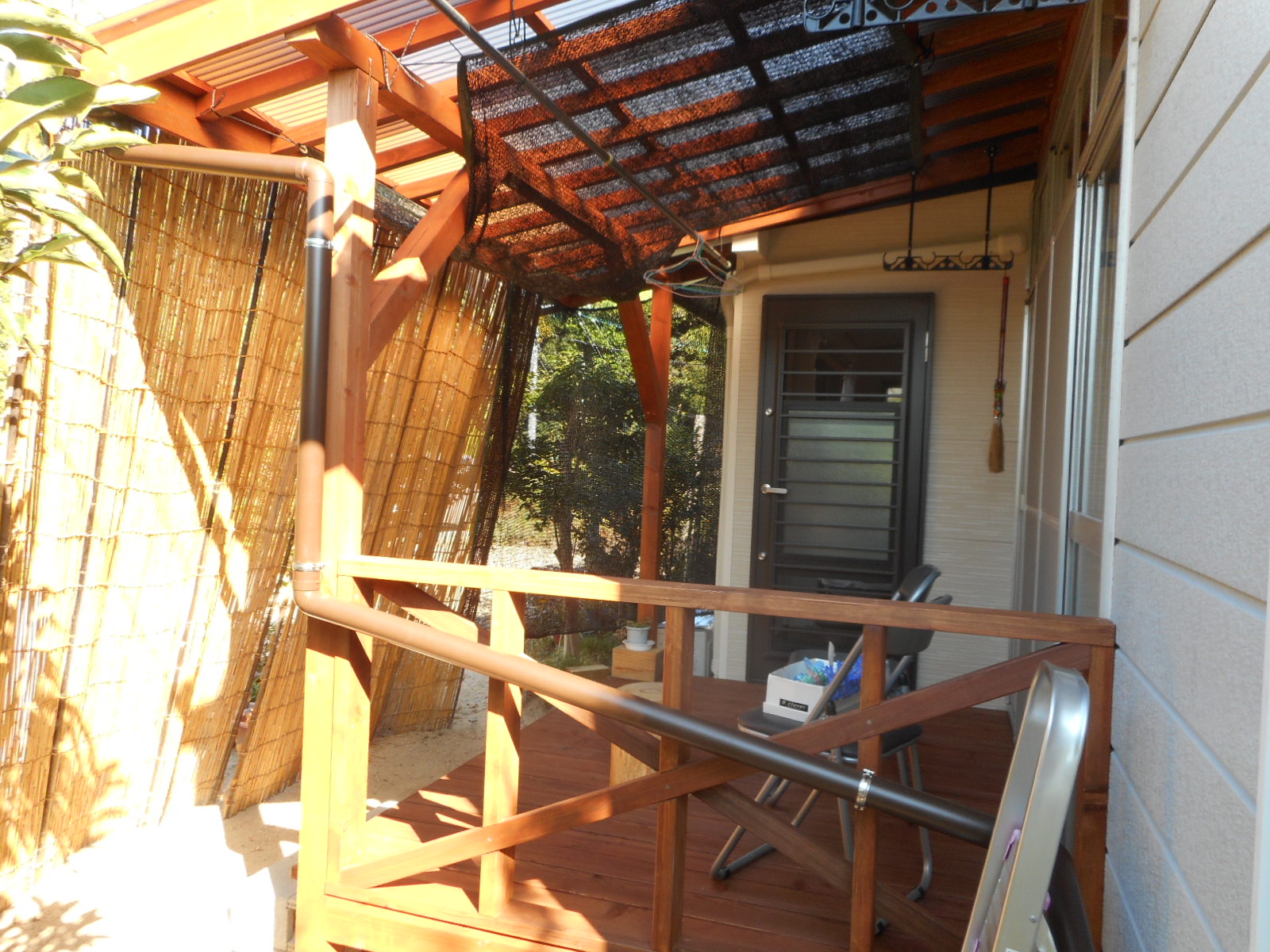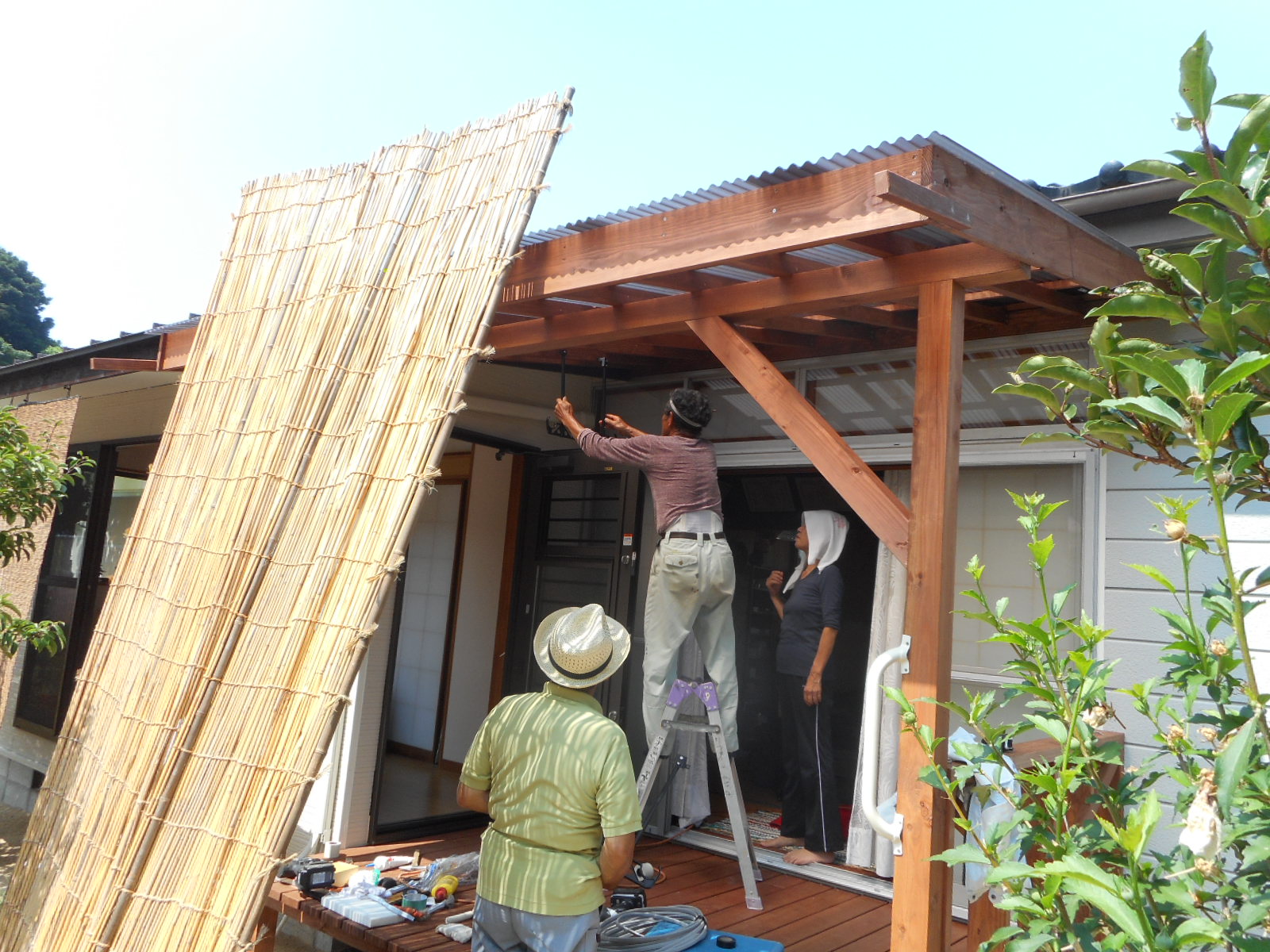 屋根に波板を張り、デッキ部分に手摺りを組付けます!! 最後に物干しを取付けます!!