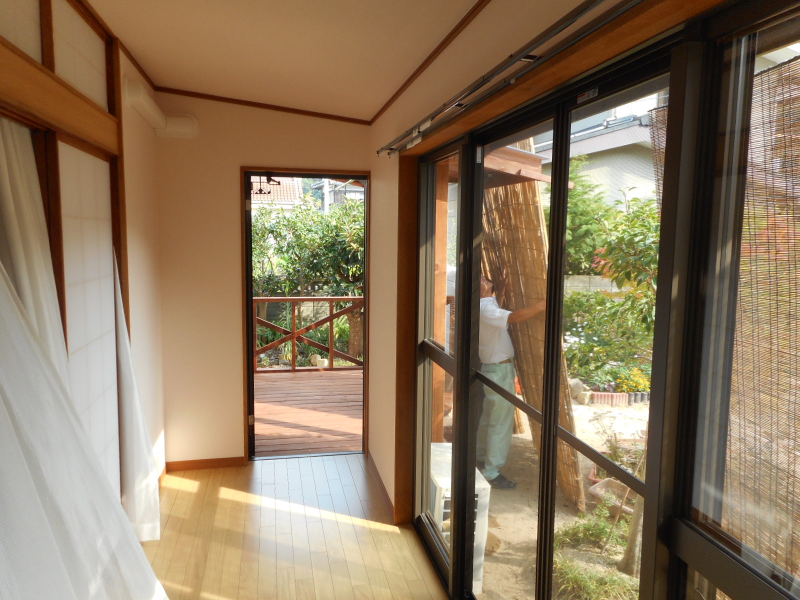 増築した広縁の中から、ドアを開けてウッドデッキ方向を見る!!